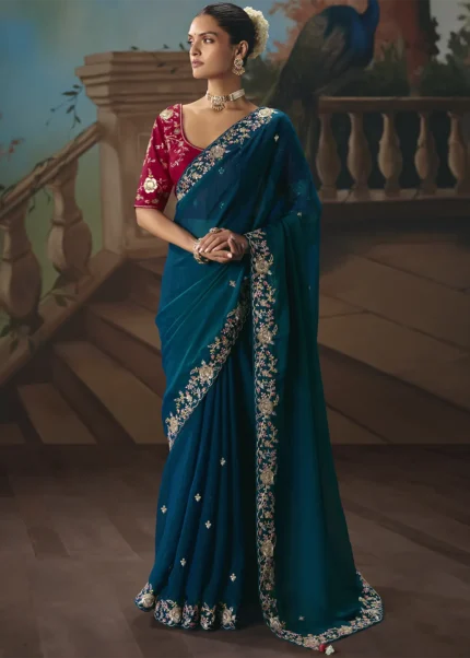 2. Blue coloured sarees: Blue represents peace, stability and wisdom. Royal and Navy blue sarees are ideal for formal events and evening gatherings, while lighter shades can be perfect for day events or office wear.