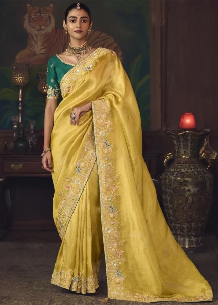 Aureolin Yellow Kanjivaram Silk Saree with Embroidery Work