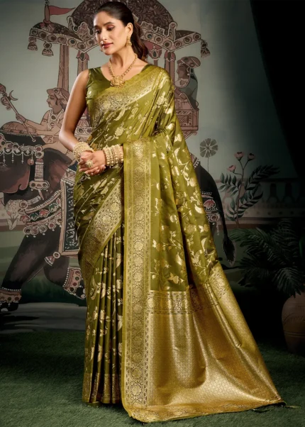 Olive Green Banarasi Silk Saree with Golden Zari Weaving