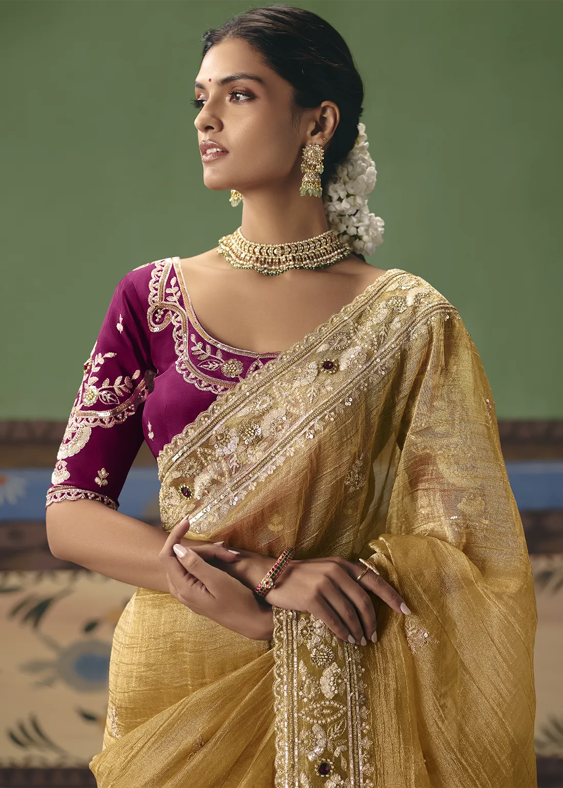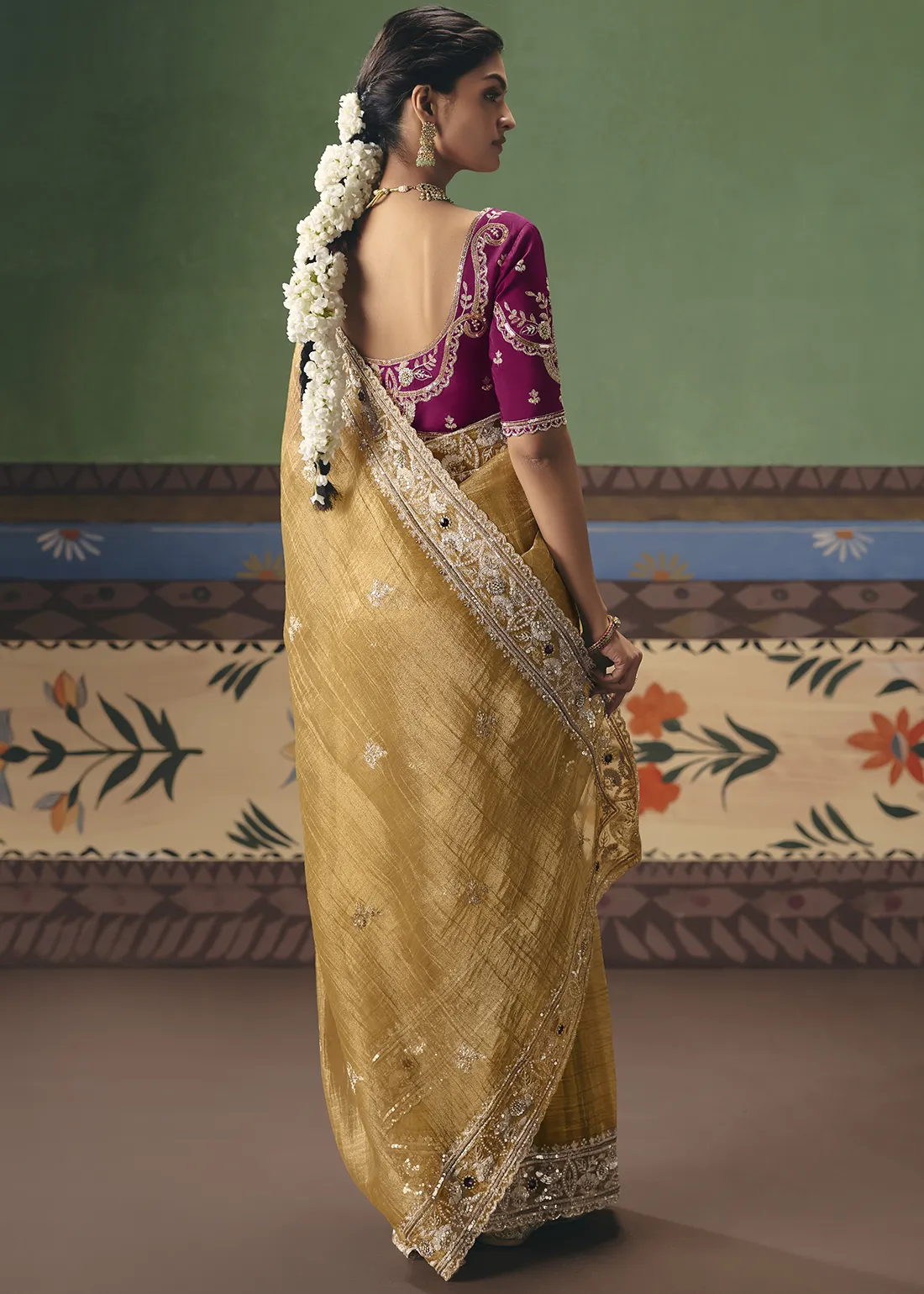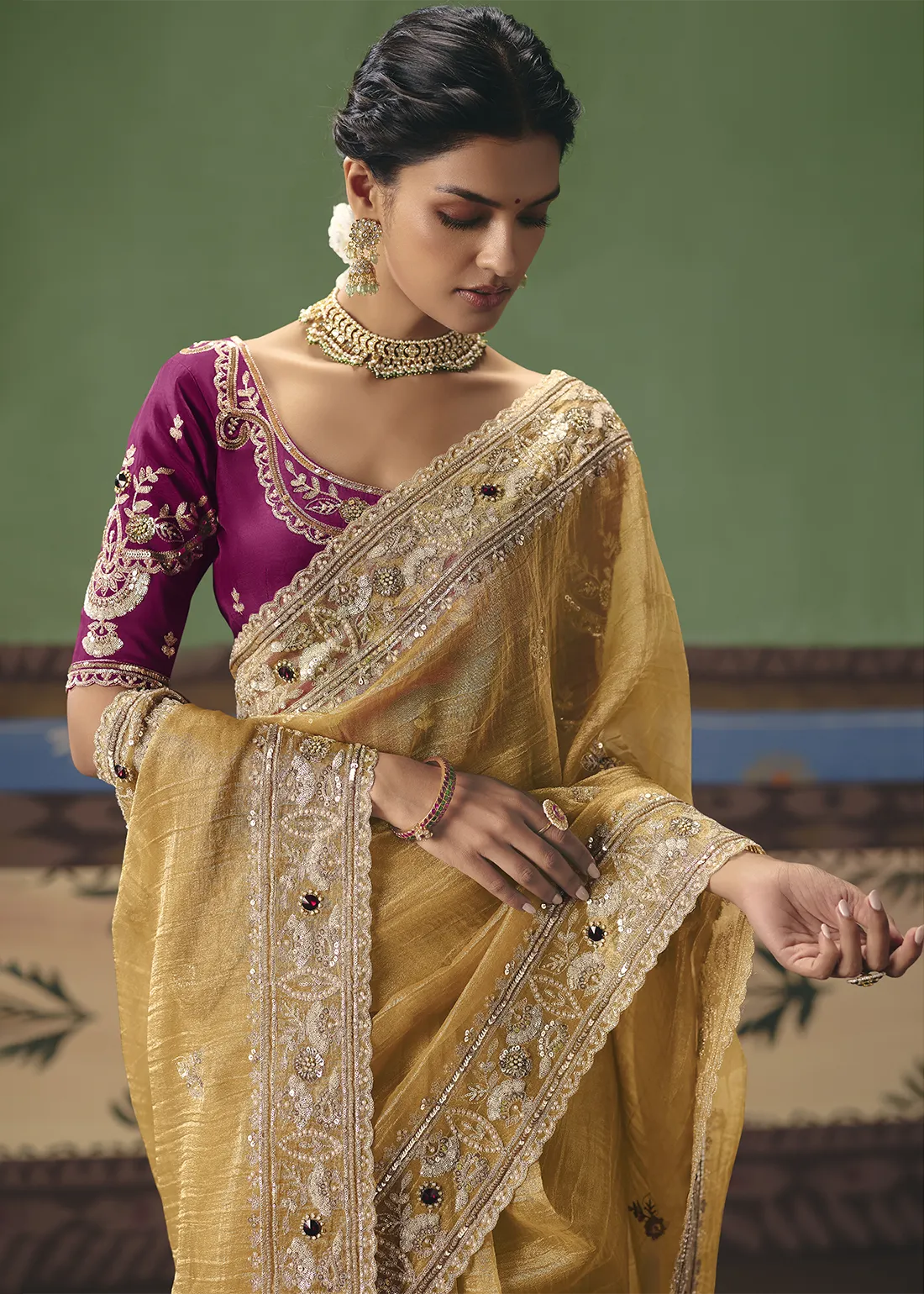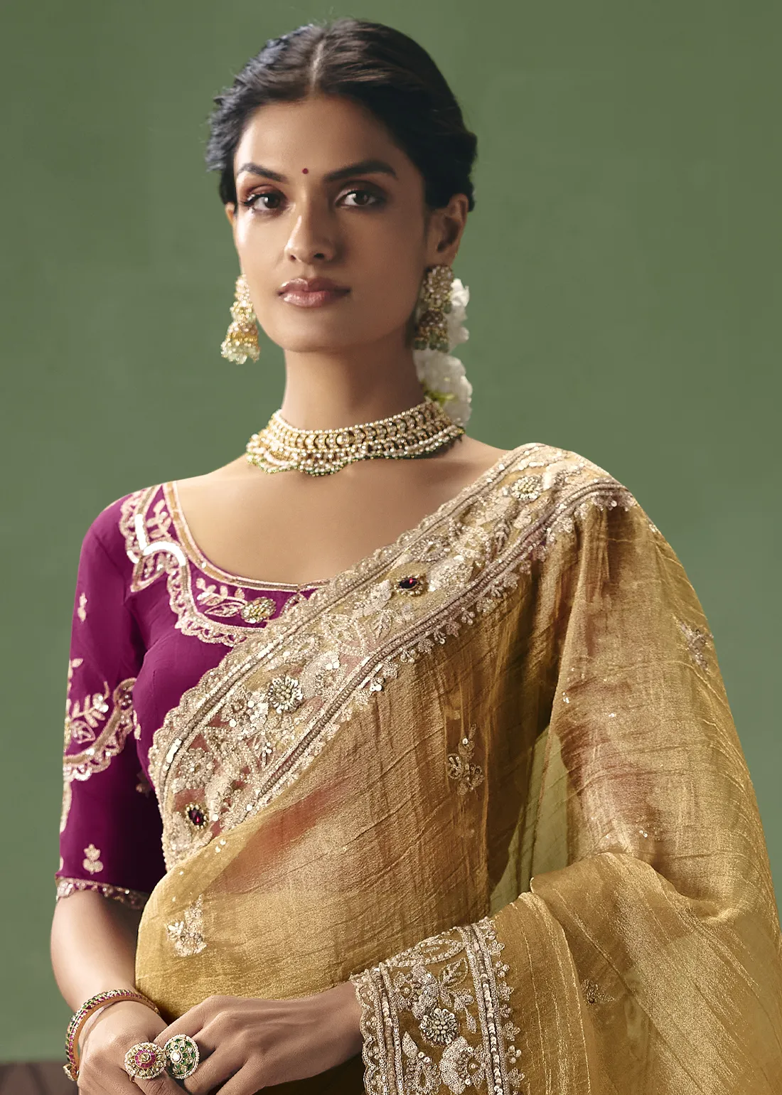 Antique Gold Embroidered Organza Saree with Magenta Blouse
