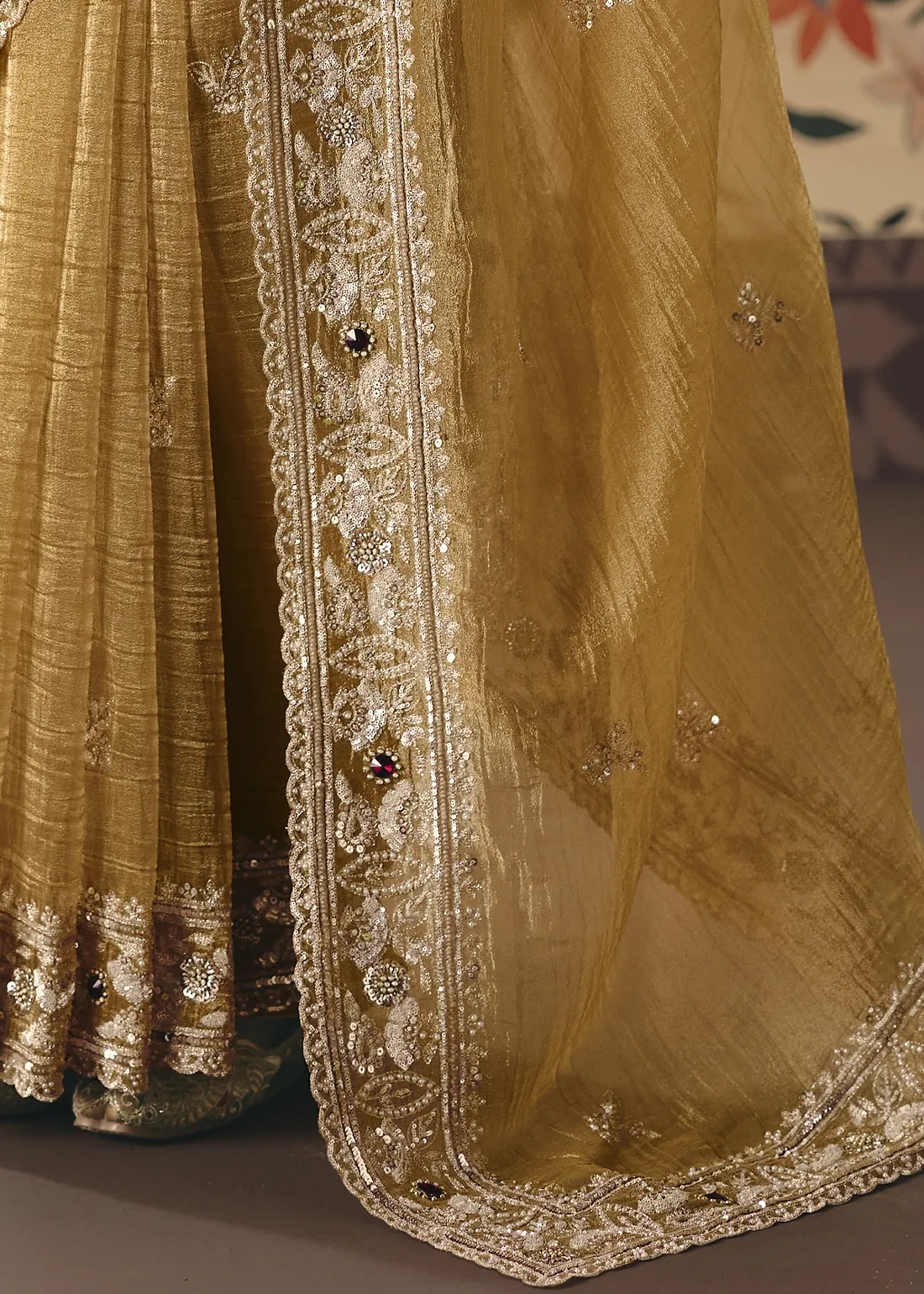 Saree: Command the room with this spectacular Antique Gold Embroidered Organza Saree. The sheer, lightweight drape of premium organza glows with a warm, metallic sheen, beautifully providing a canvas for delicate floral motifs. The true showstopper is the exquisite, heavily scalloped border—masterfully hand-embellished with intricate threadwork, gleaming zari, shimmering sequins, pearl-like beads, and striking stone accents. Designed for modern royalty, this drape is the ultimate choice for bridal receptions, bridesmaids, and glamorous festive celebrations.