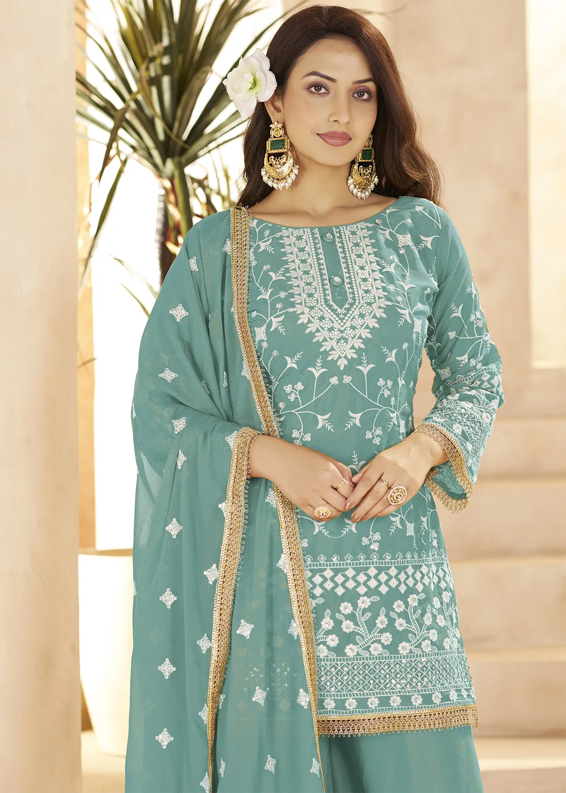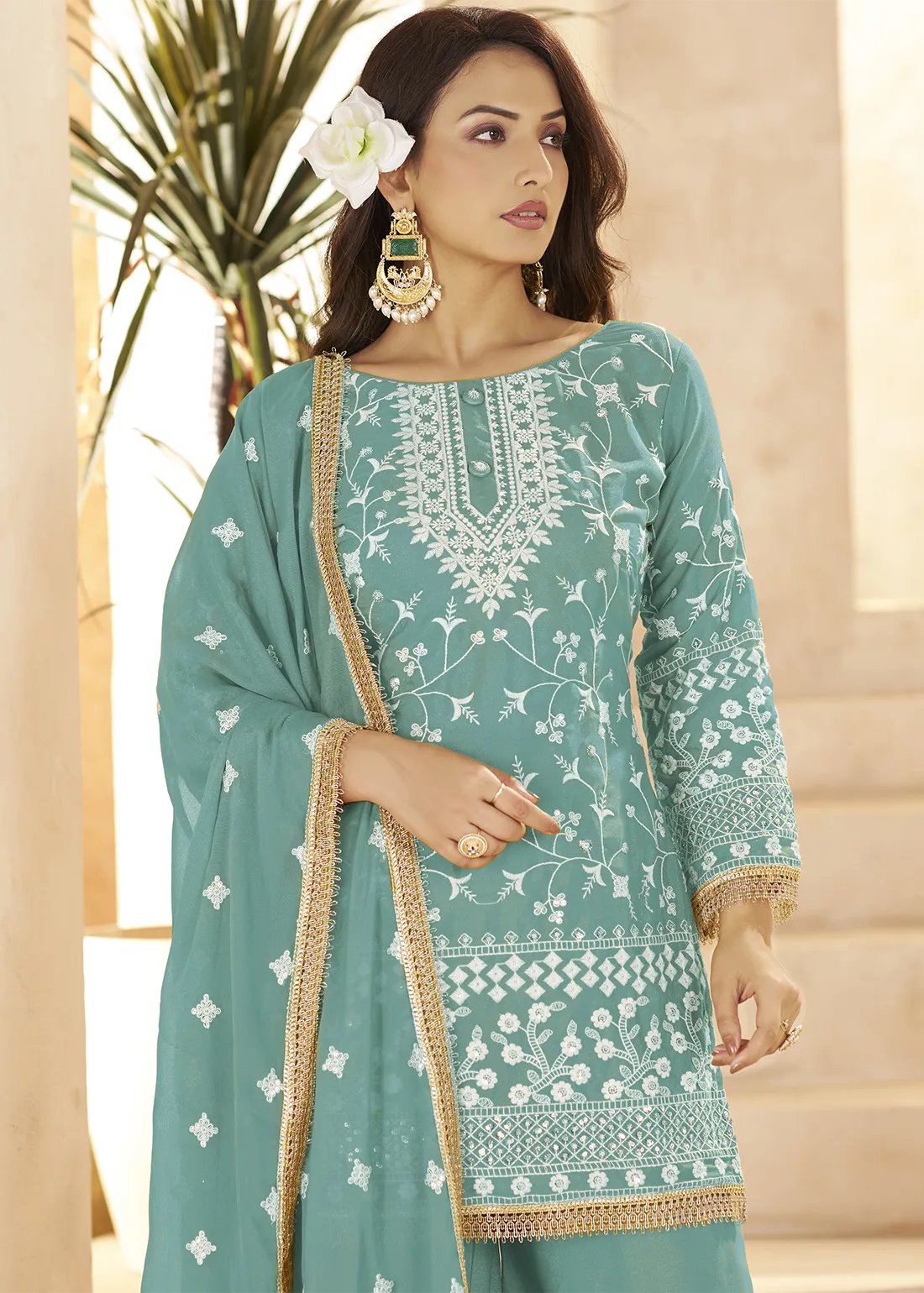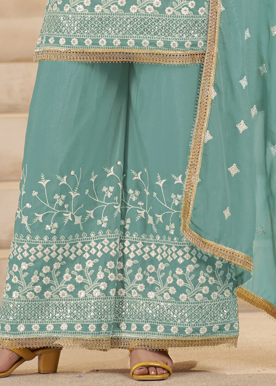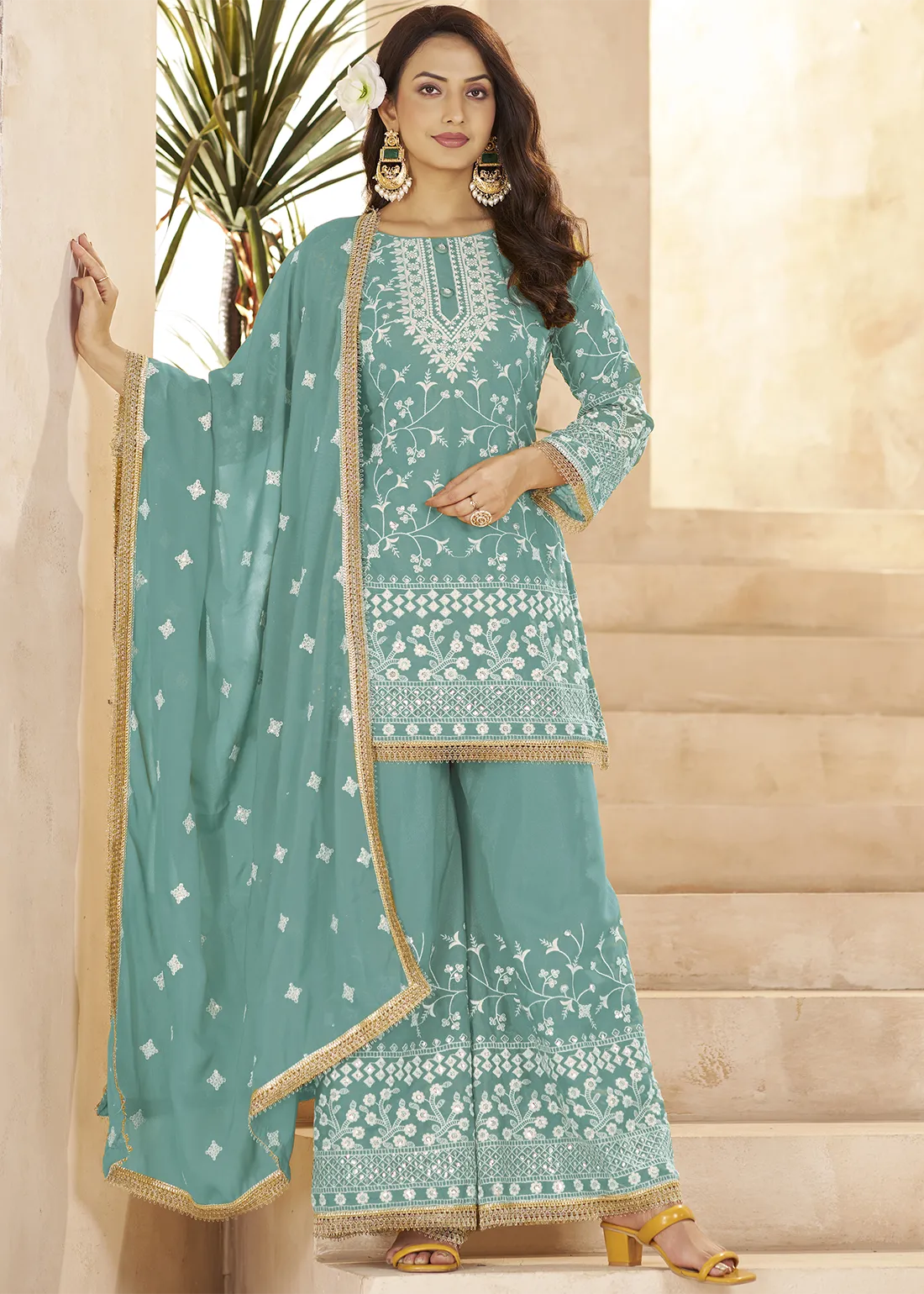 Aqua Blue Georgette Palazzo Suit with Embroidery Work