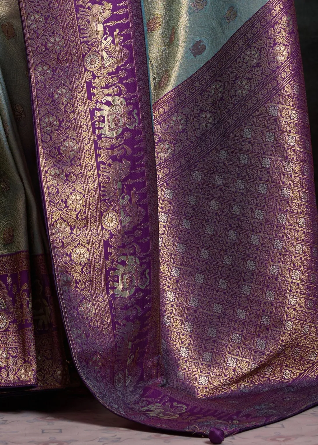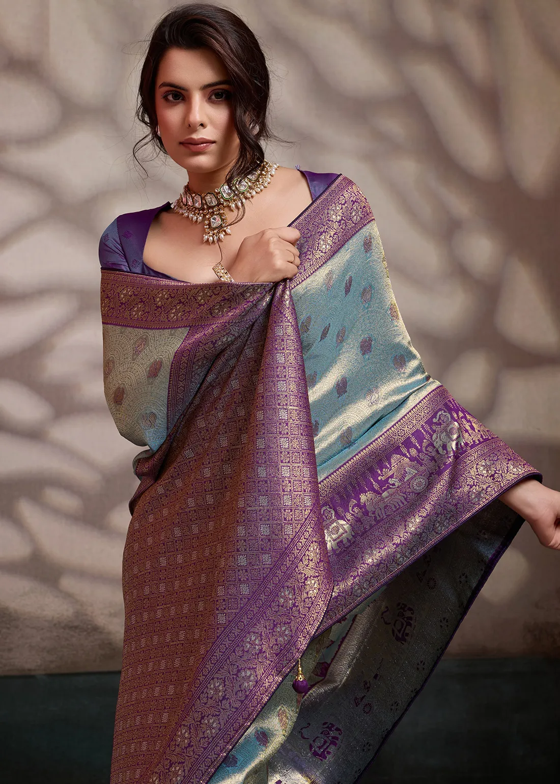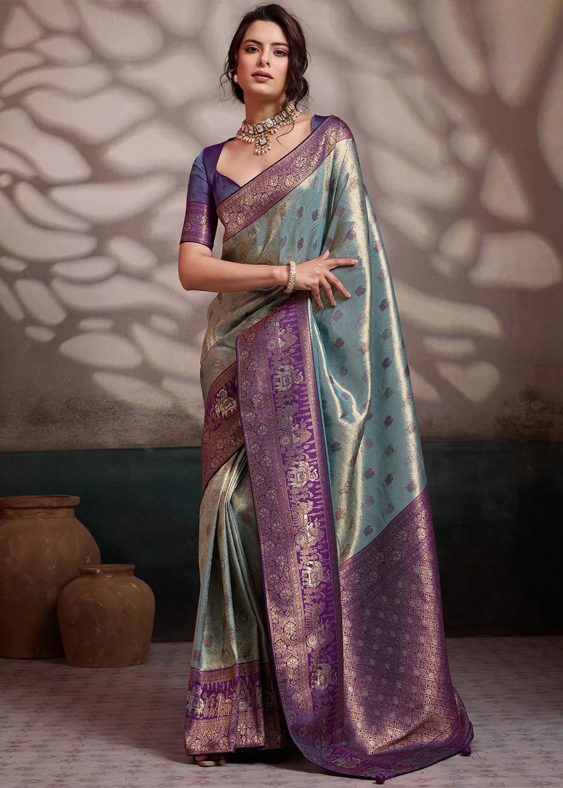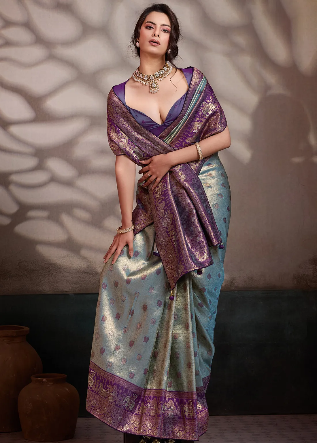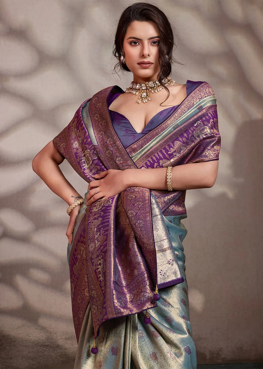 Saree: Experience the perfect harmony of modern hues and ancient heritage with this breathtaking Metallic Aqua Blue and Deep Violet Kanjivaram Pattu Saree. The luminous silk body features an icy, silver-blue sheen delicately woven with subtle contrasting bootis. It is flawlessly framed by a rich, solid Deep Violet border and a grand, heavy zari pallu that is a true work of art—showcasing majestic, traditional elephant and heritage motifs woven in brilliant antique gold. Exquisitely finished with handmade designer tassels and premium edge piping to protect the fabric and ensure a structured, graceful drape, this masterpiece is ideal for weddings, grand receptions, and elegant festive celebrations.