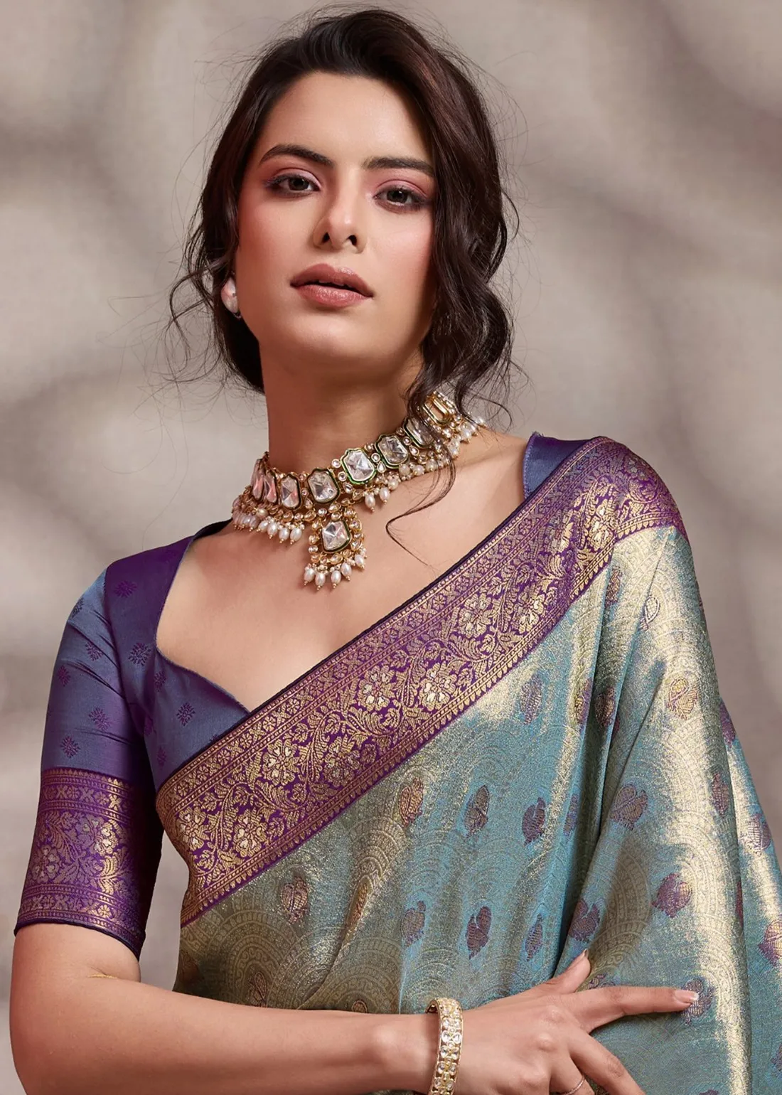 Aqua Blue Kanjivaram Pattu Saree with Deep Violet Blouse