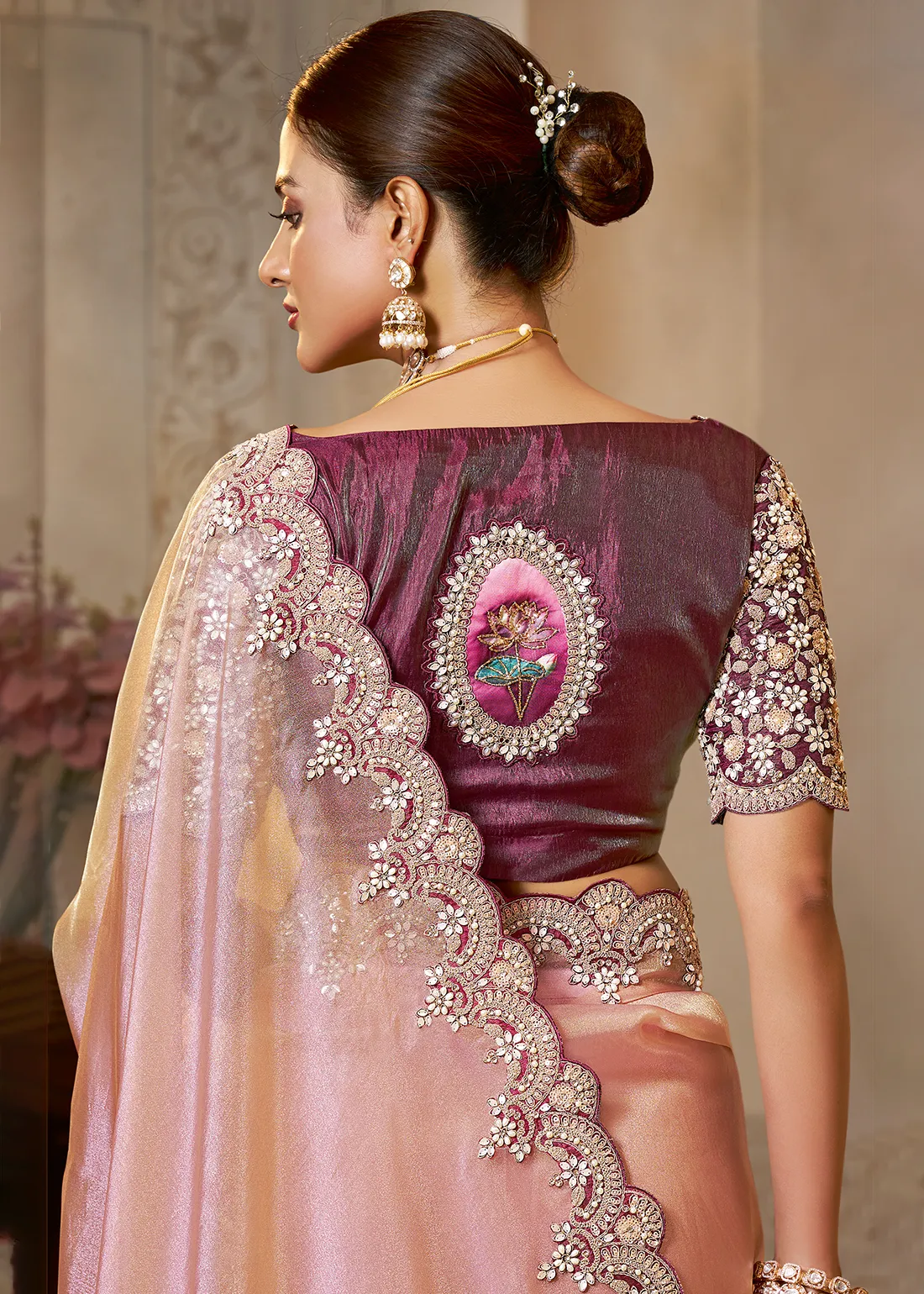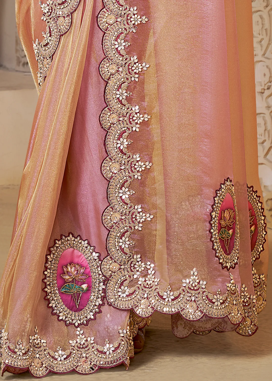 Champagne Beige Designer Tissue Silk Saree with Embroidery, Stones & Beads