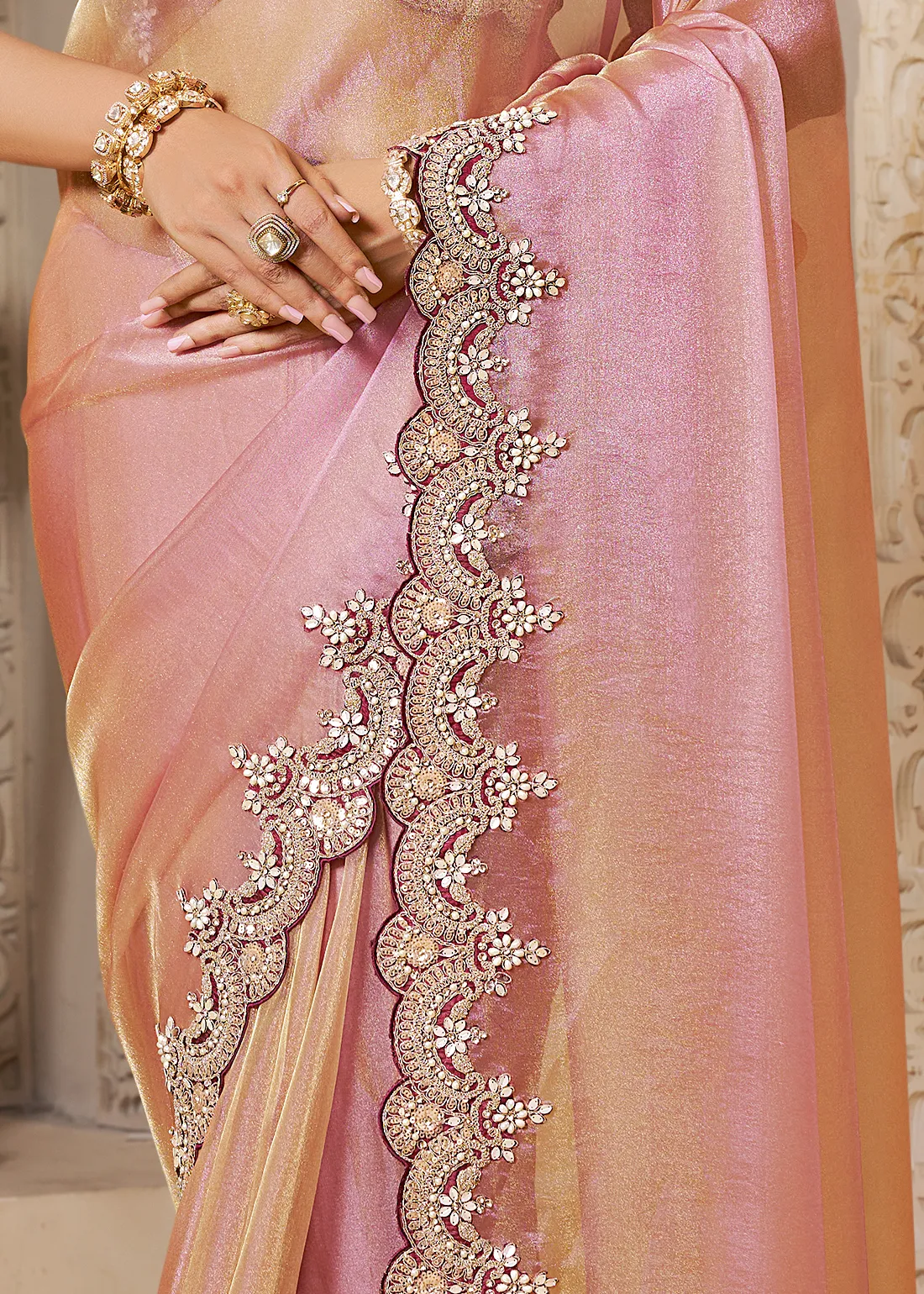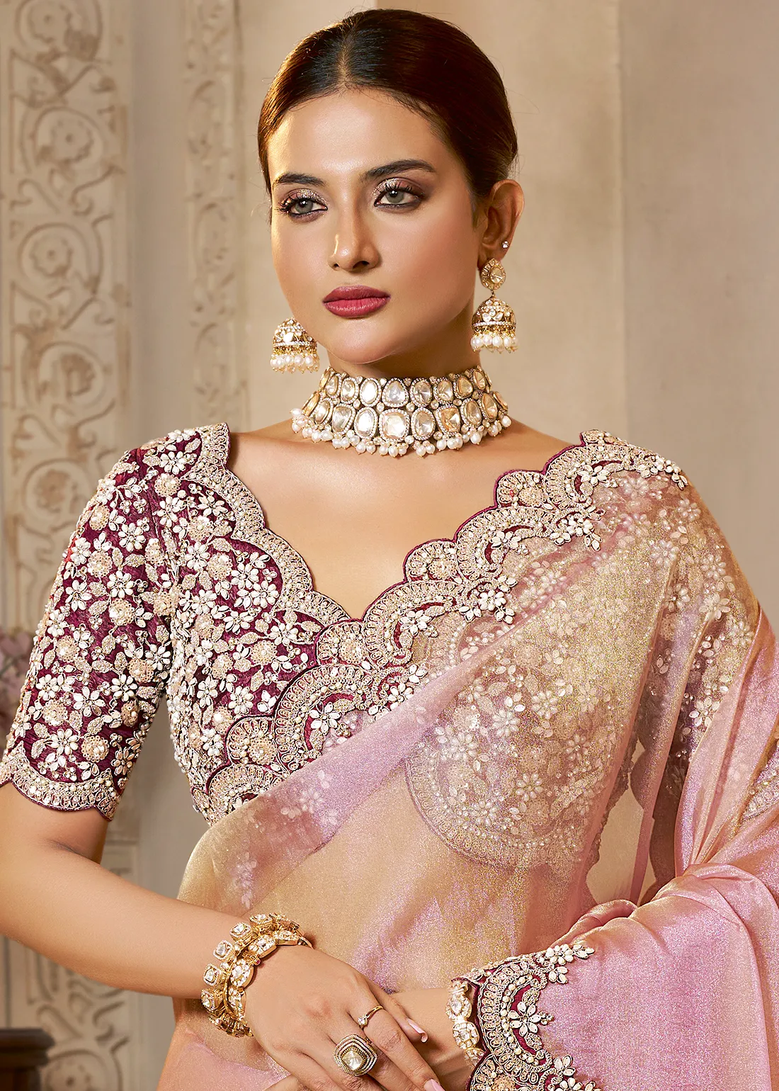 Baby Pink Designer Organza Saree with Heavy Embroidery and Stone Work