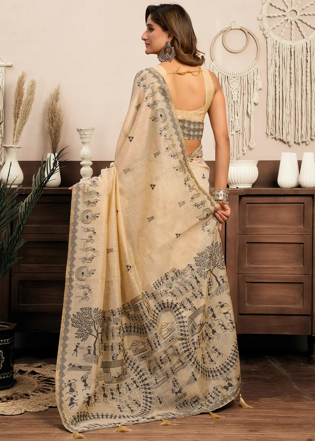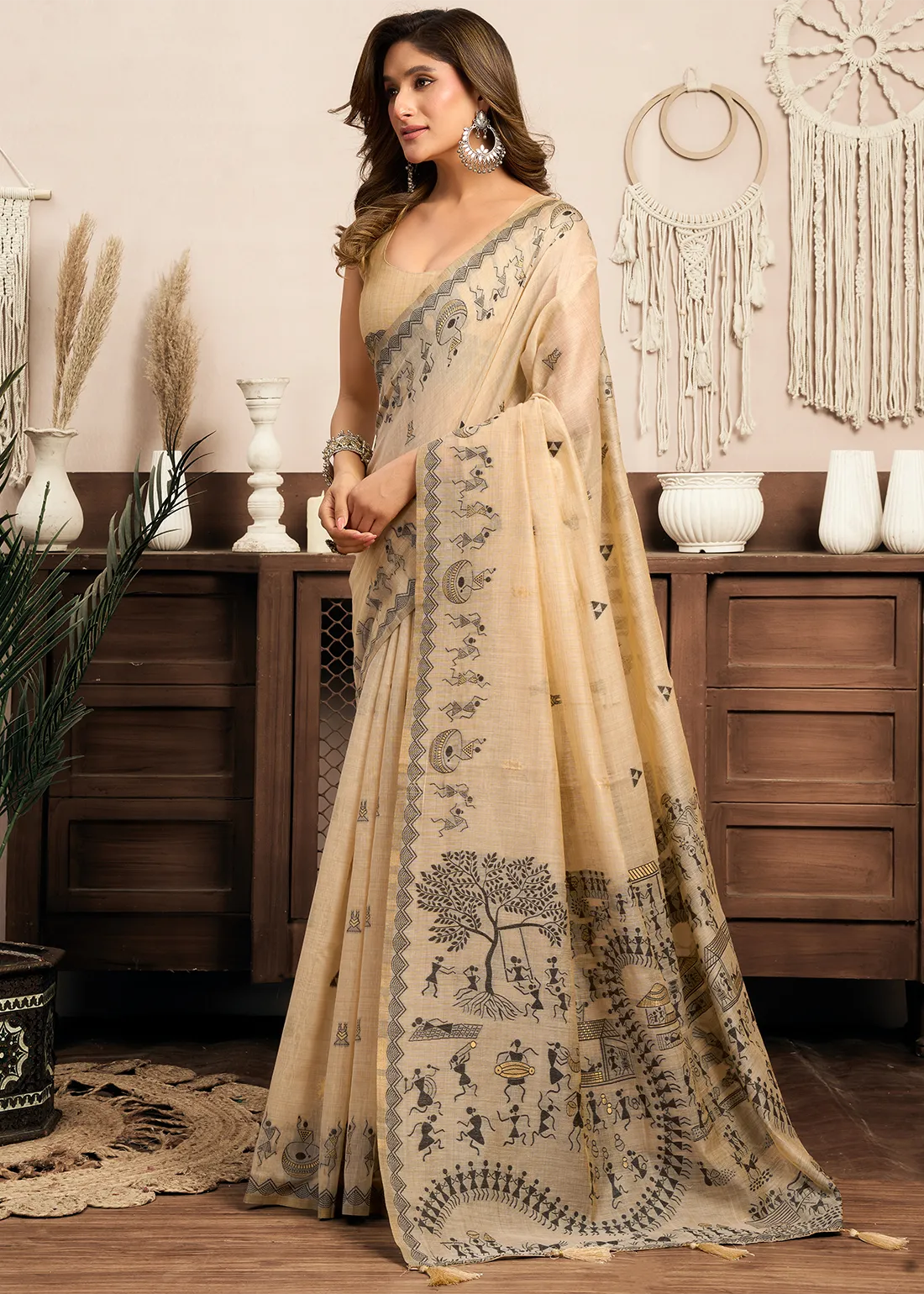 Saree: Stay cool and effortlessly stylish in this beautifully crafted, comfortable & light weight, Beige Linen Saree adorned with intricate woven worli motifs across the length of the Saree and rich woven Border and Pallu. This charming jacquard woven saree with zari accents is a summer essential and definitely deserves a place in your wardrobe.
