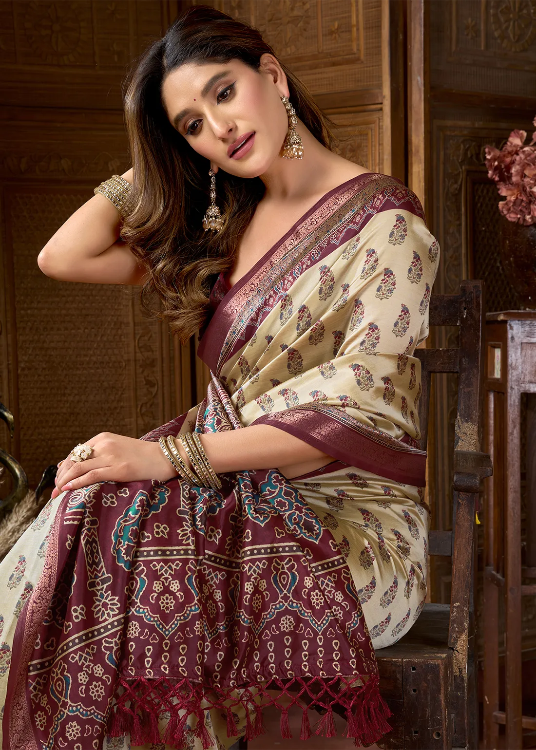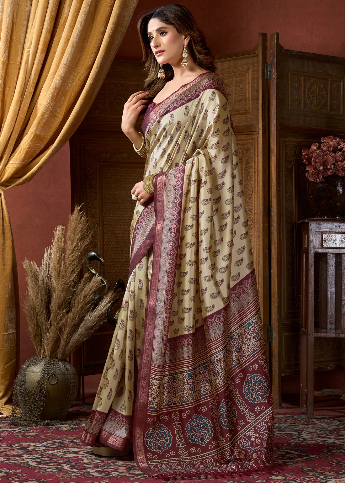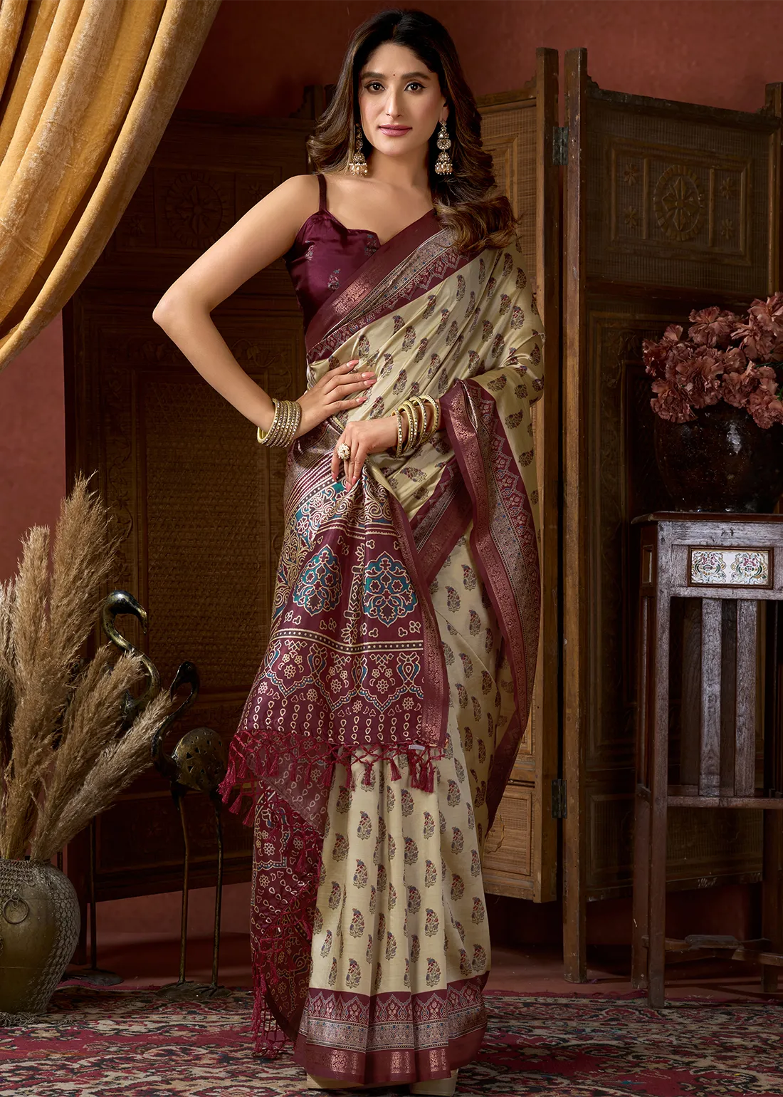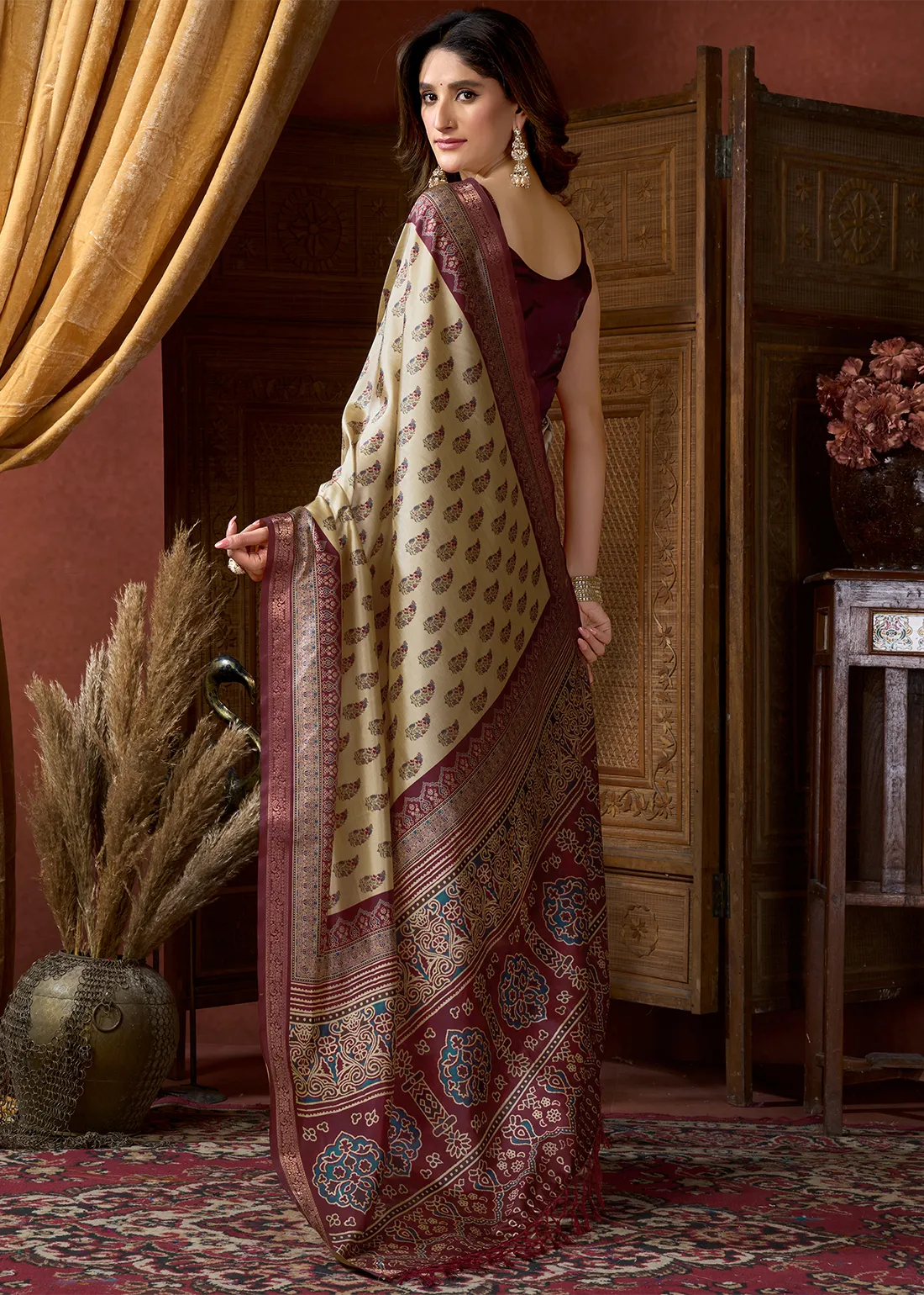 Beige & Maroon Ajrakh Printed Satin Crepe Saree with Zari Woven Border