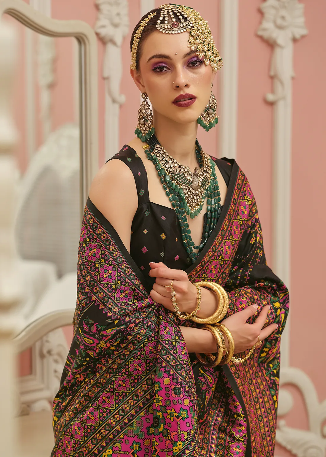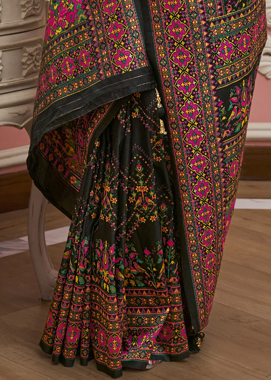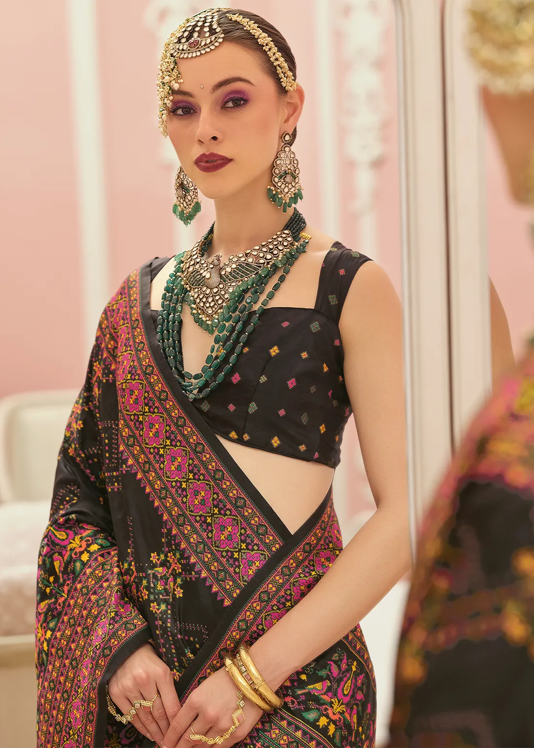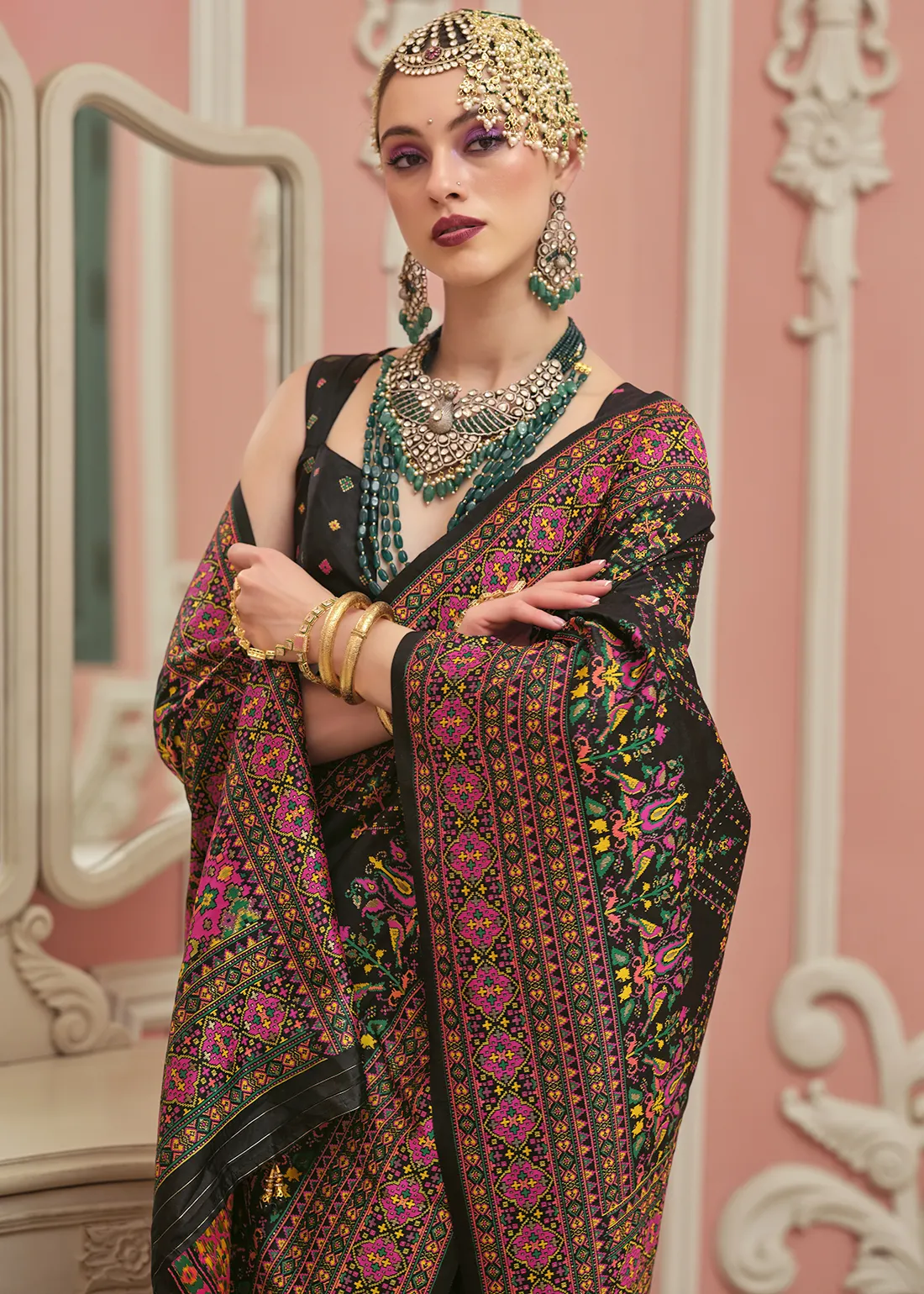 Saree: Adorned with intricately woven colourful Jamawar motifs, this Black Kashmiri Jamawar Silk Saree is a tribute to the rich heritage of Kashmiri artistry, making it a treasured possession for generations to come. With its versatile drape, this saree beautifully complements any occasion, whether it’s a wedding celebration, a festive gathering, or a social event.