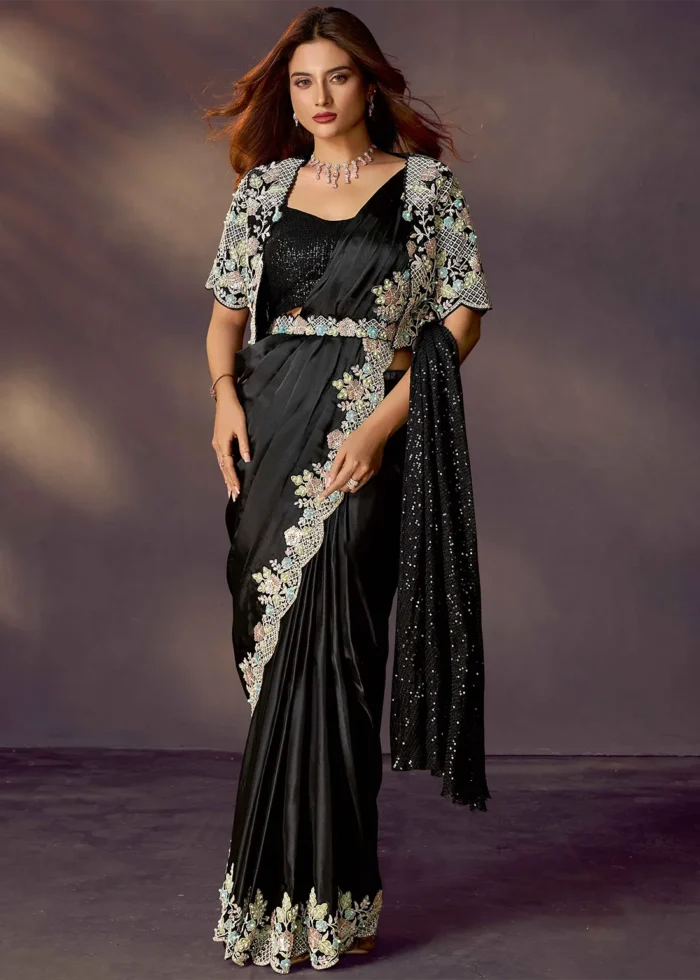 Black Ready to Wear Satin Silk Saree with Jacket & Belt