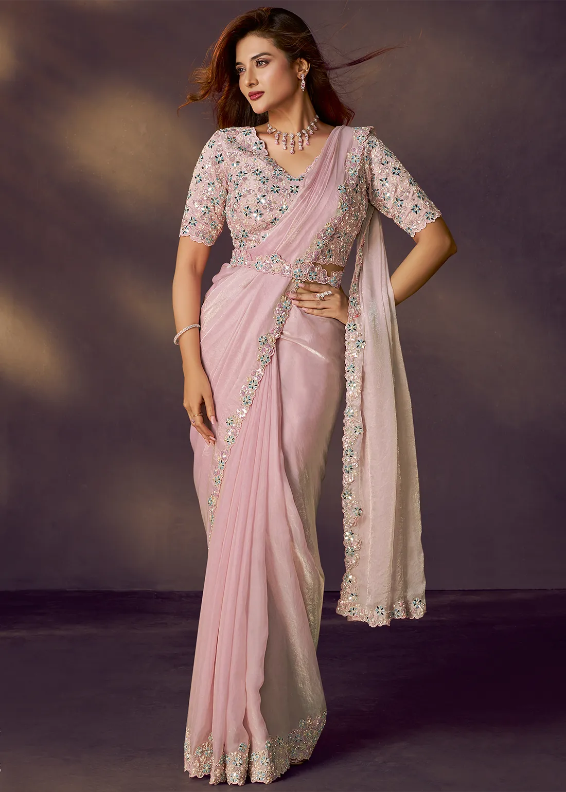 Saree: Embrace timeless elegance with this Blush Pink Ready to Wear Designer Saree featuring Resham, Beads and Sequins embroidery work along with beautiful Stone and mirror handwork that adds a unique touch of craftsmanship to the saree. This beautifully crafted drape has a luxurious and royal appeal and looks captivating when worn. Whether you’re attending a wedding, a party, or any other grand event, this Designer Saree promises to turn heads and make you a vision of grace and sophisticated beauty.