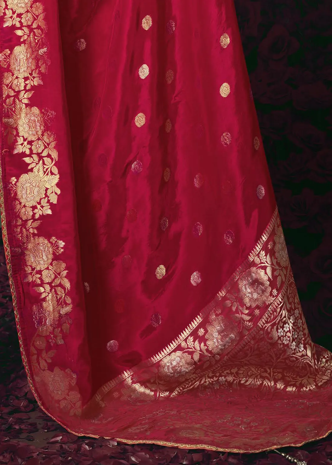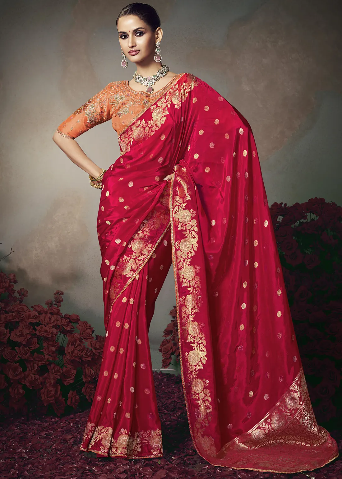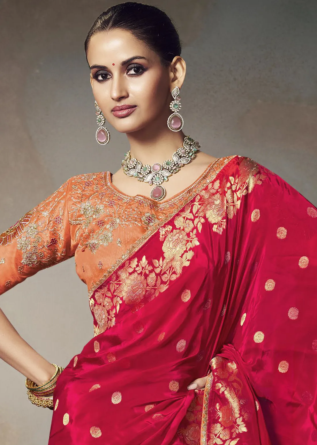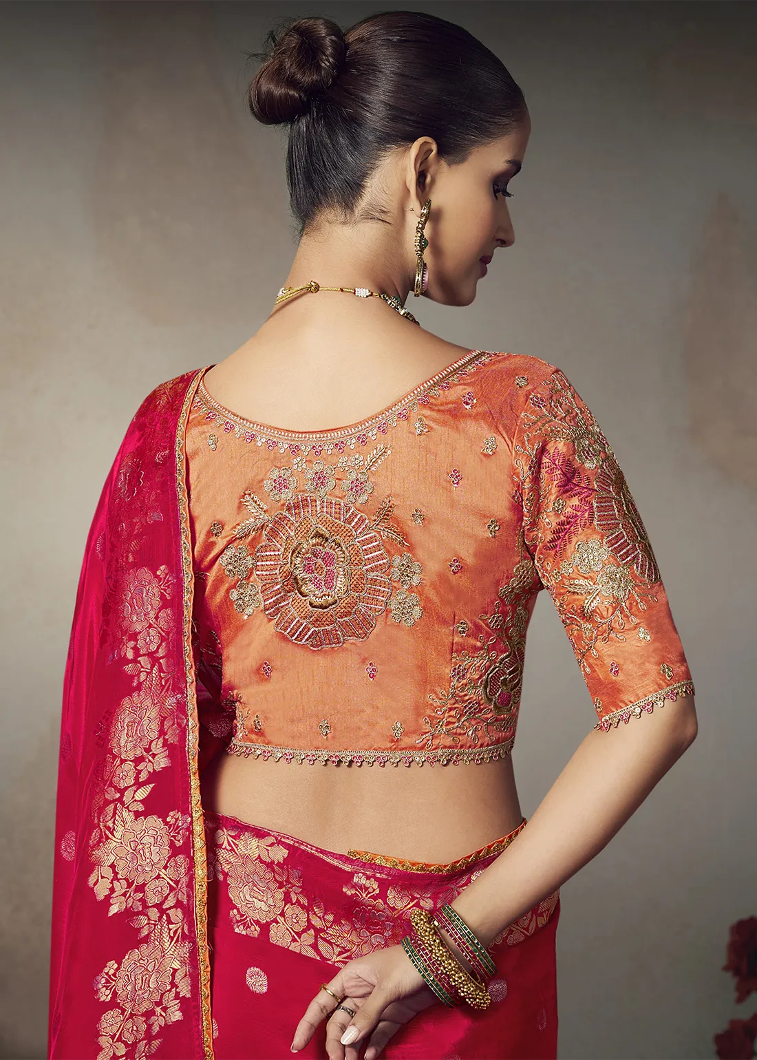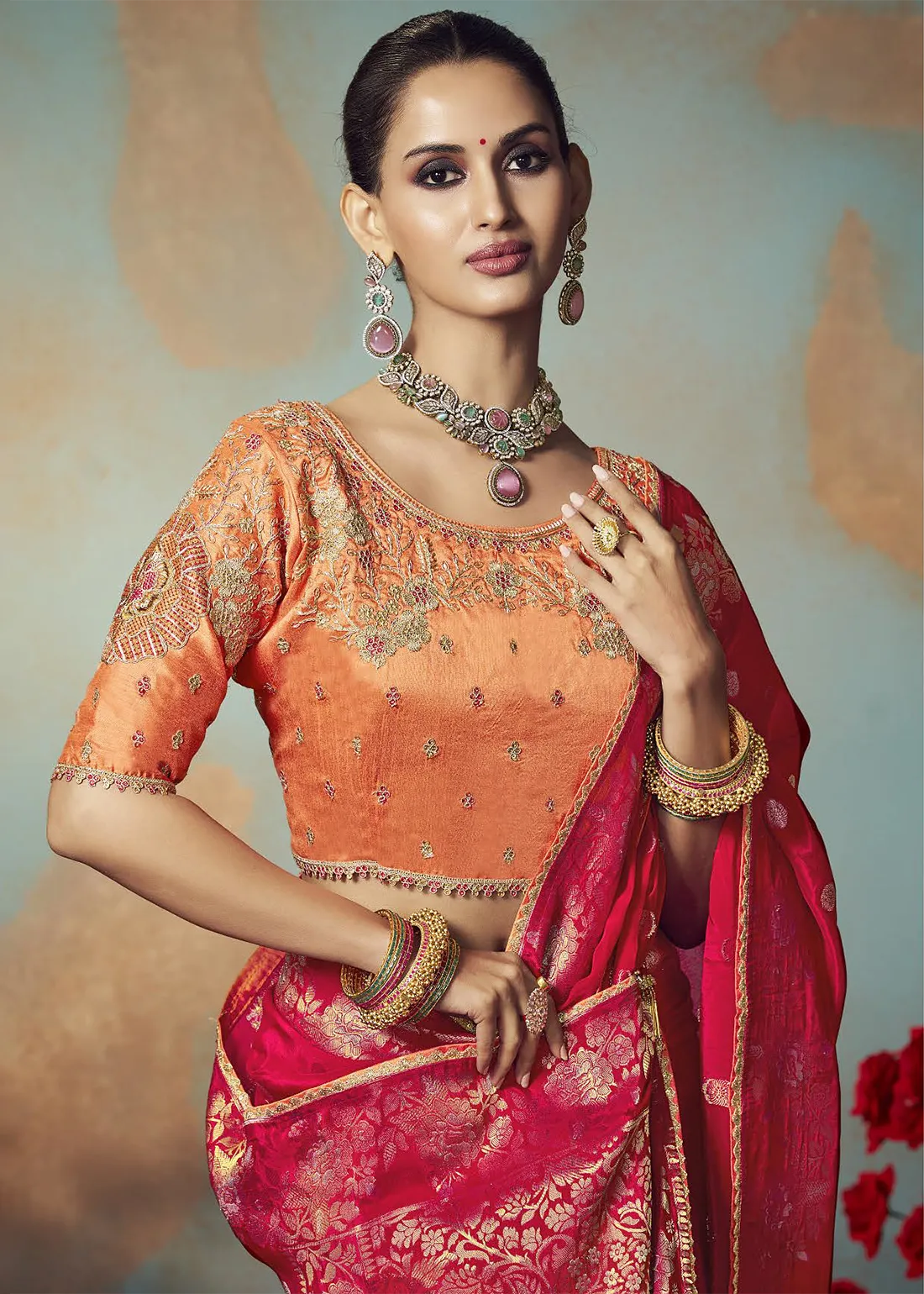 Bridal Red Banarasi Saree with Orange Embroidered Blouse