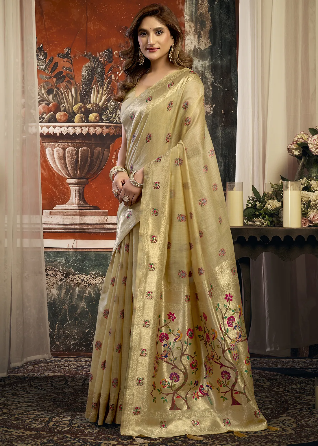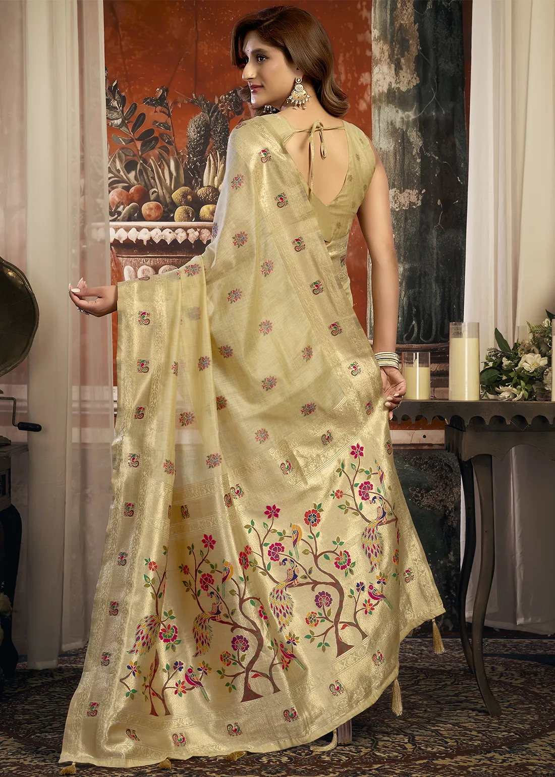 Champagne Beige Linen Paithani Saree with Peacock Motifs