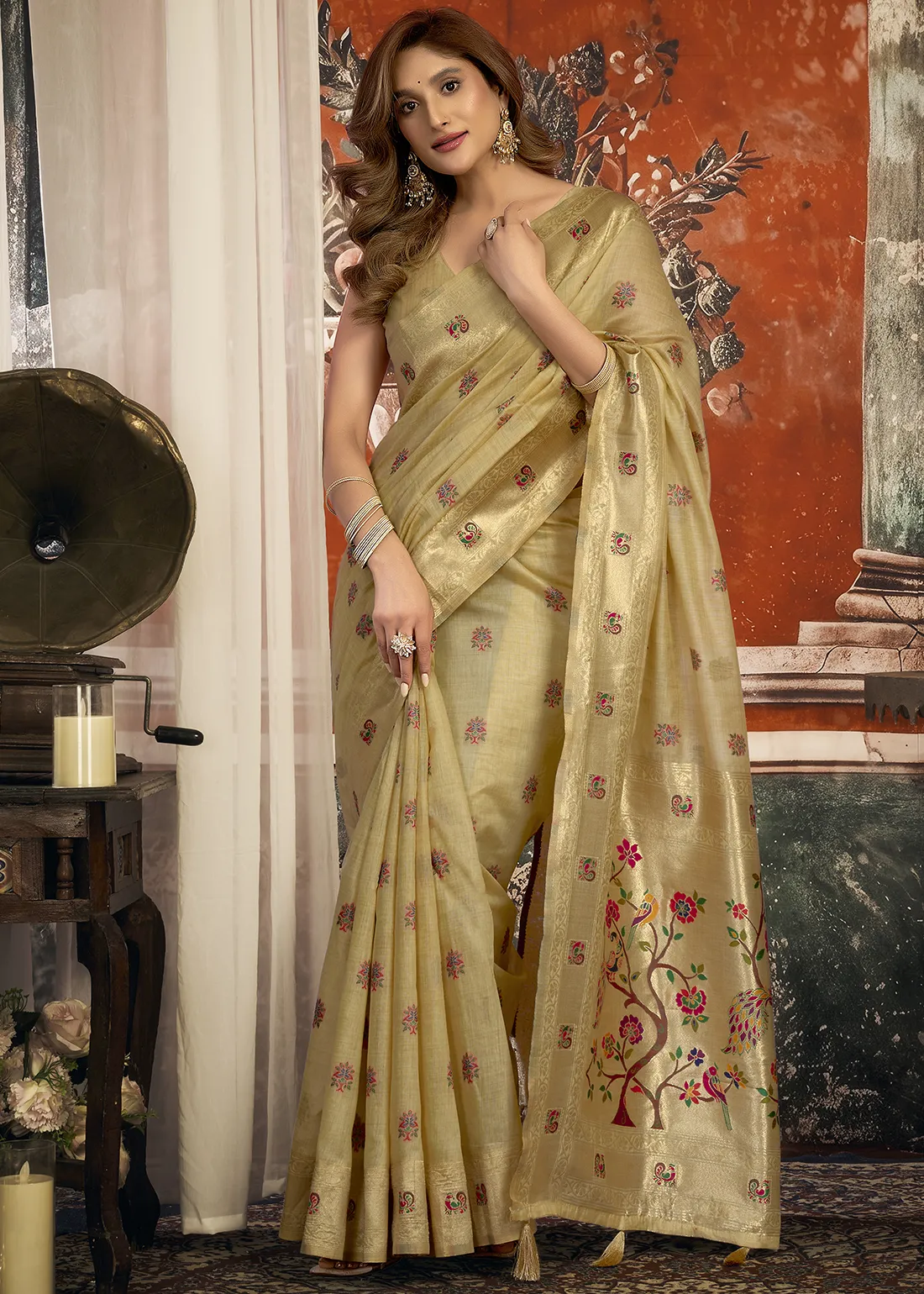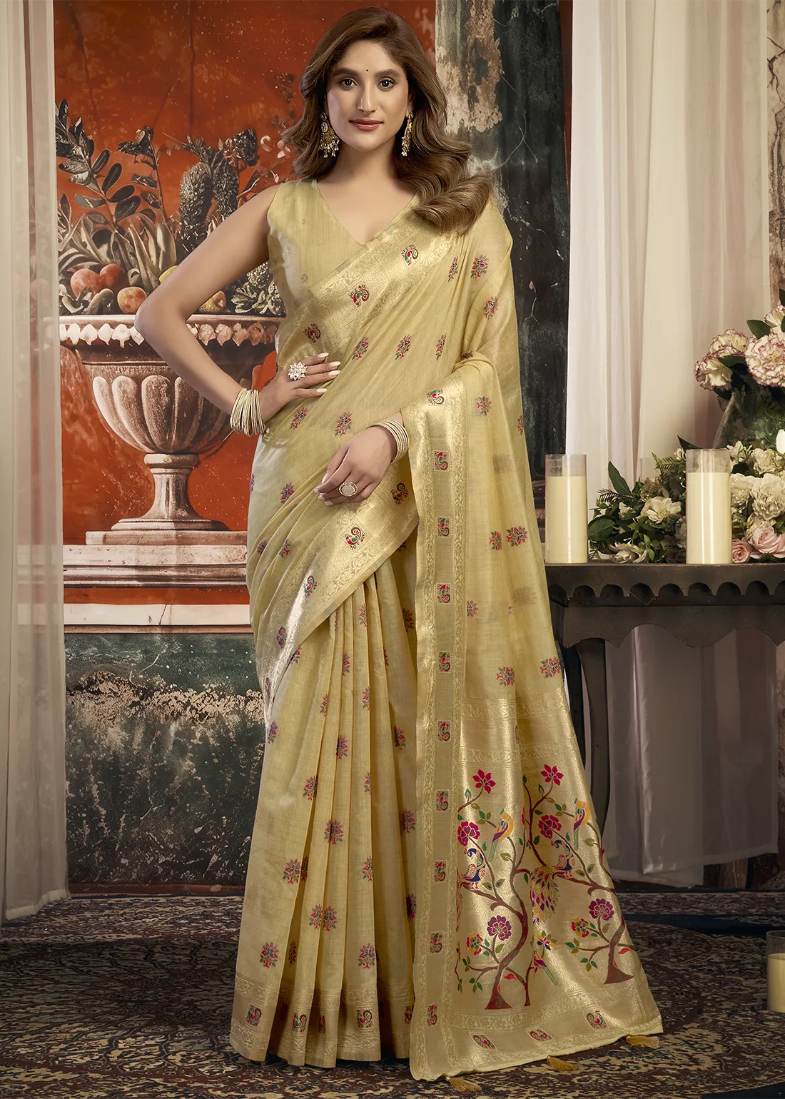 Set Content: Champagne Beige Summer Linen Paithani Saree with a matching unstitched blouse piece.