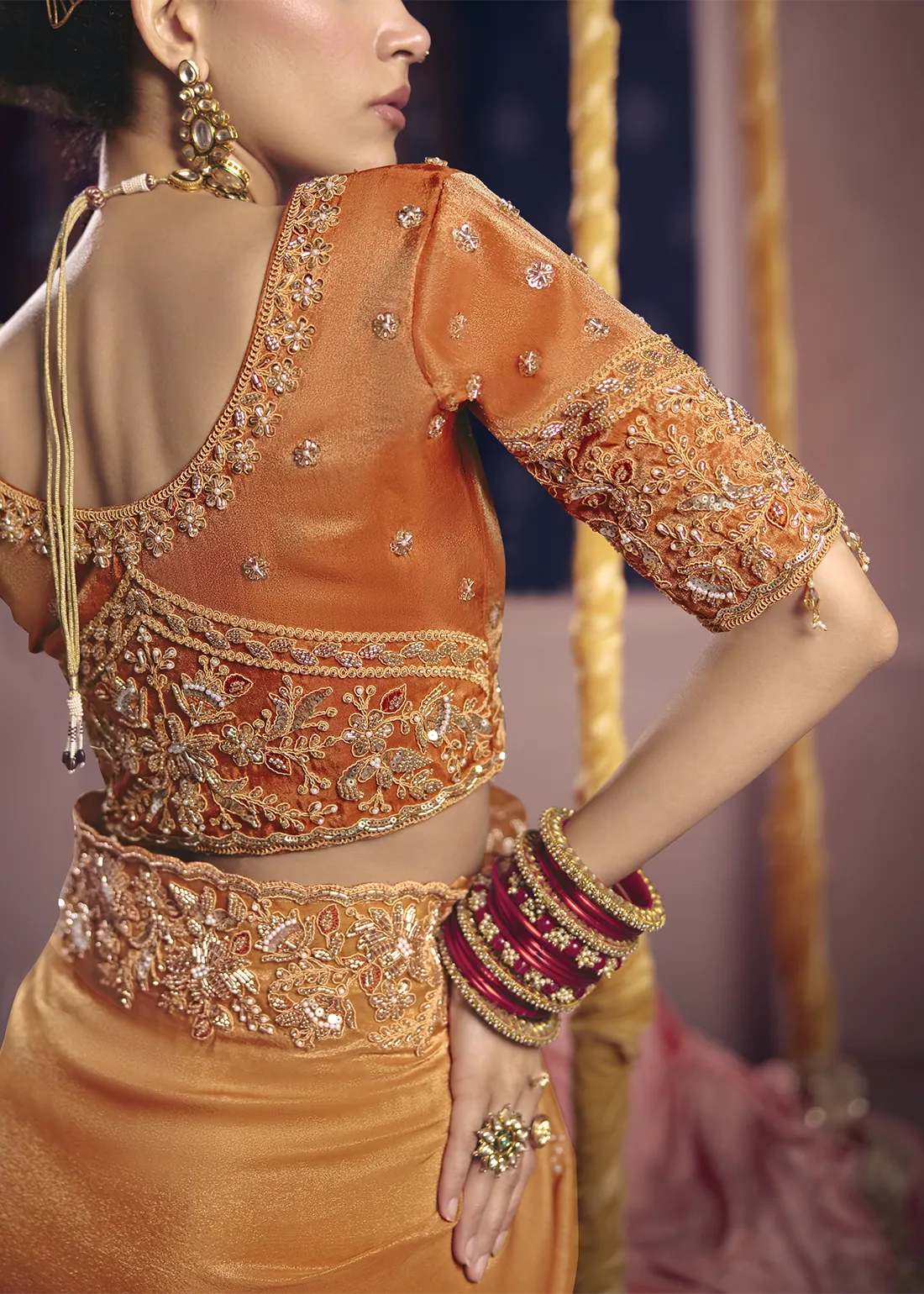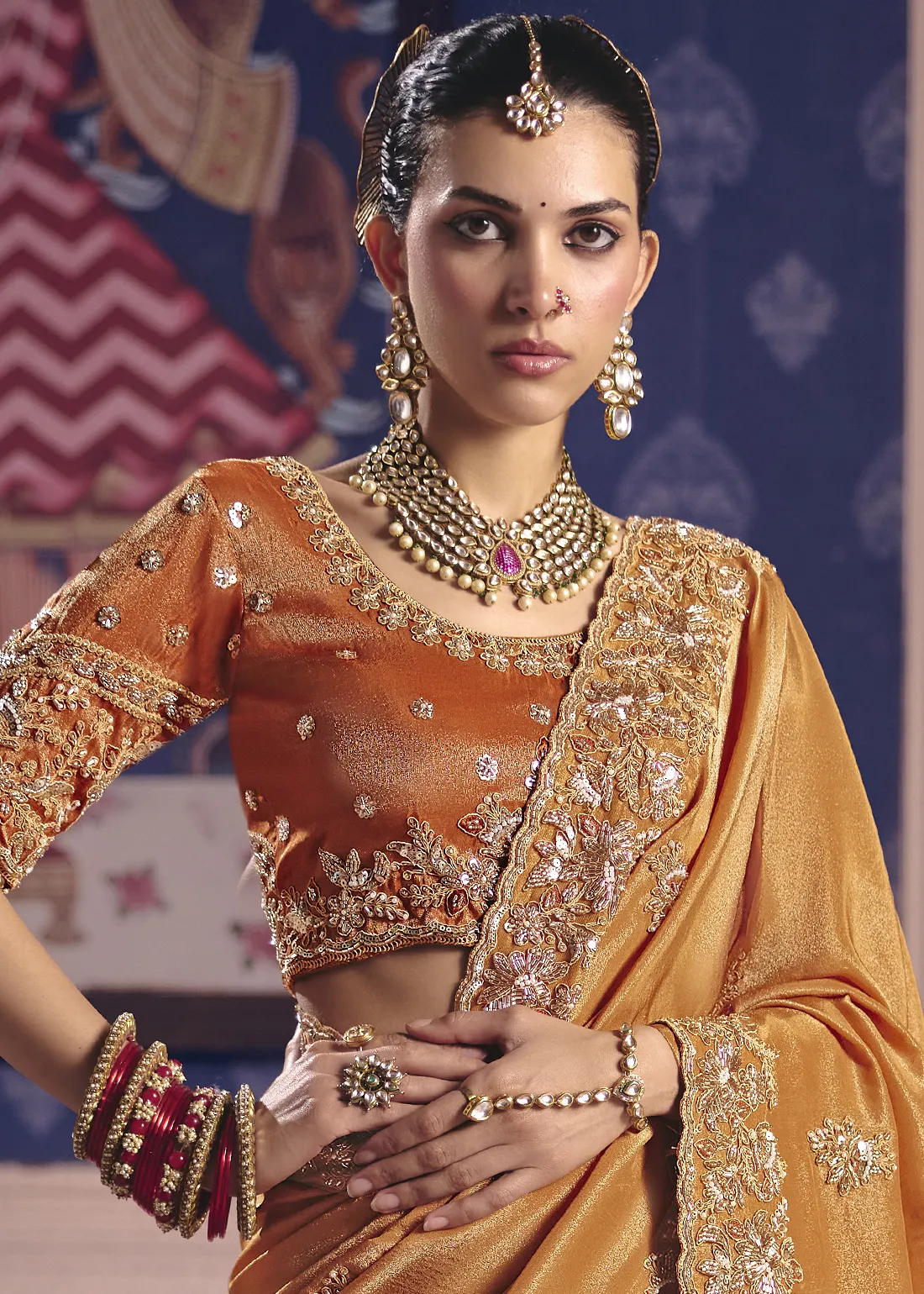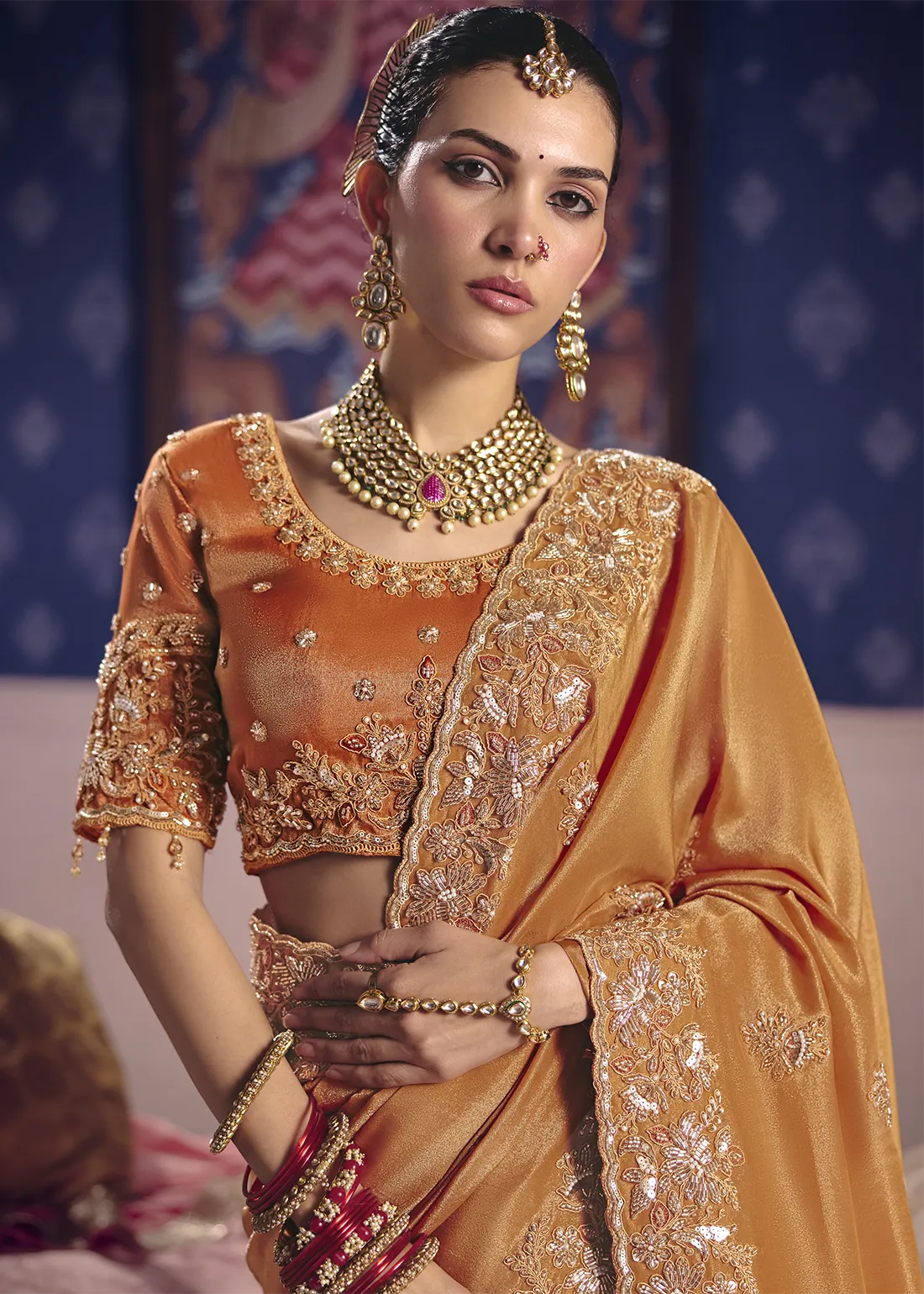 Set Content: Copper Orange Tissue Silk Saree with a heavily embroidered, matching unstitched blouse piece.