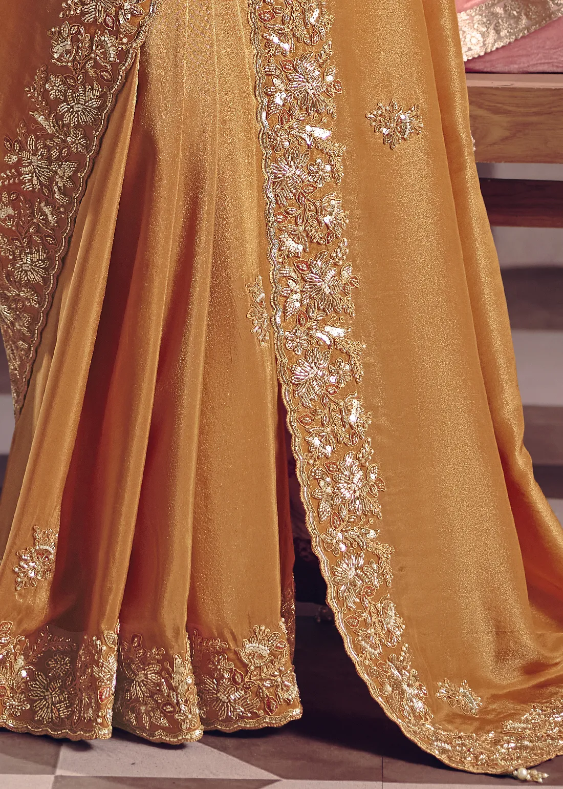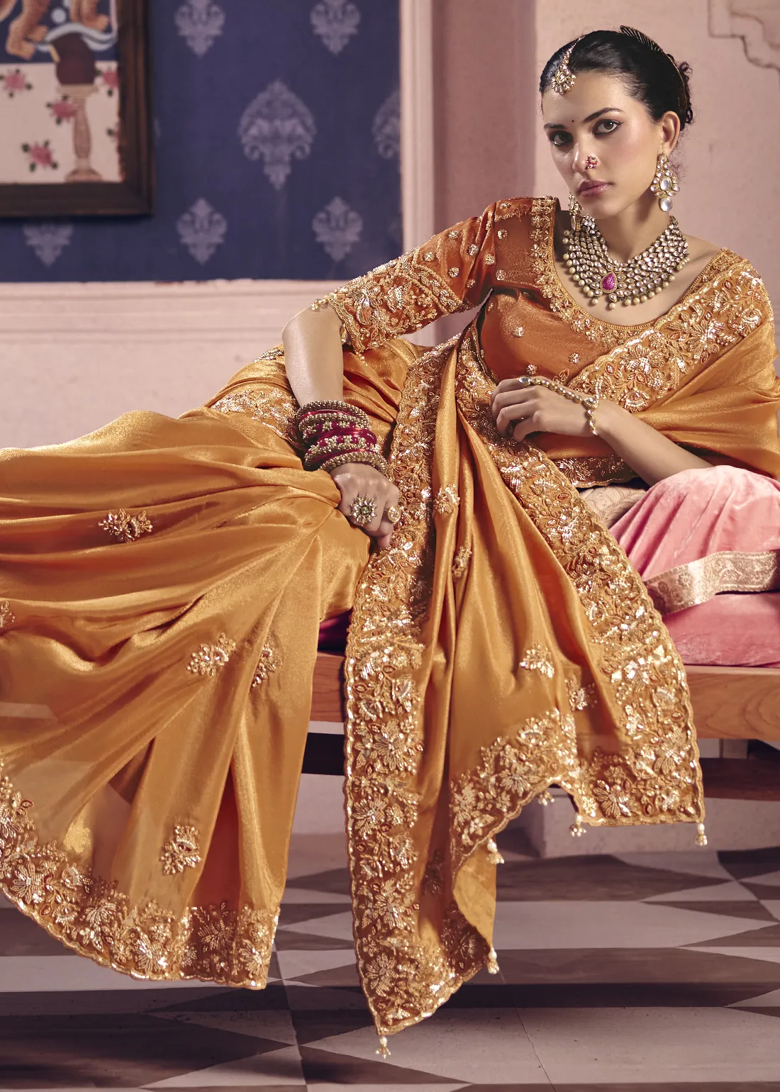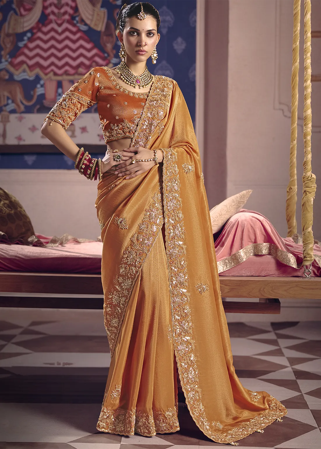 Saree: Radiate warmth and royal elegance with this breathtaking Copper Orange Tissue Silk Saree. The premium tissue silk fabric offers a mesmerizing, metallic coppery sheen and a graceful, glowing drape. It is masterfully framed by a heavy, intricately scalloped border, meticulously hand-embellished with shimmering golden sequins, brilliant cutdana (glass beads), and delicate pearl work. This rich, monochromatic masterpiece is the ultimate statement piece for festive celebrations, Haldi and Mehendi ceremonies, and grand evening receptions.