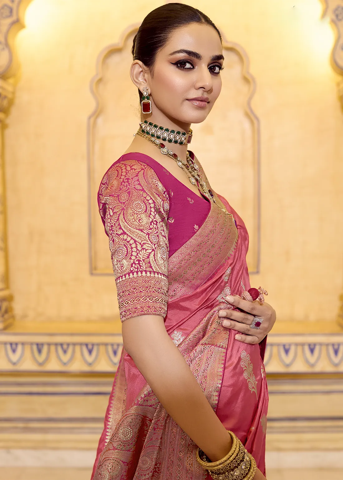 Set Content: Coral Pink Saree with Magenta Blouse.