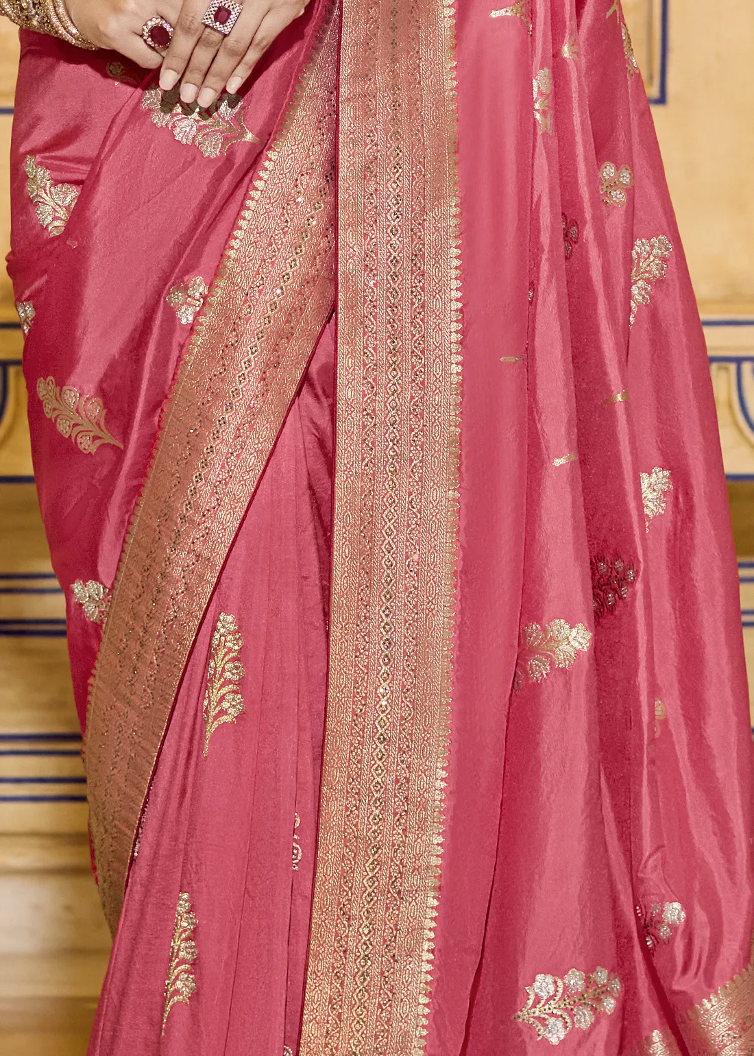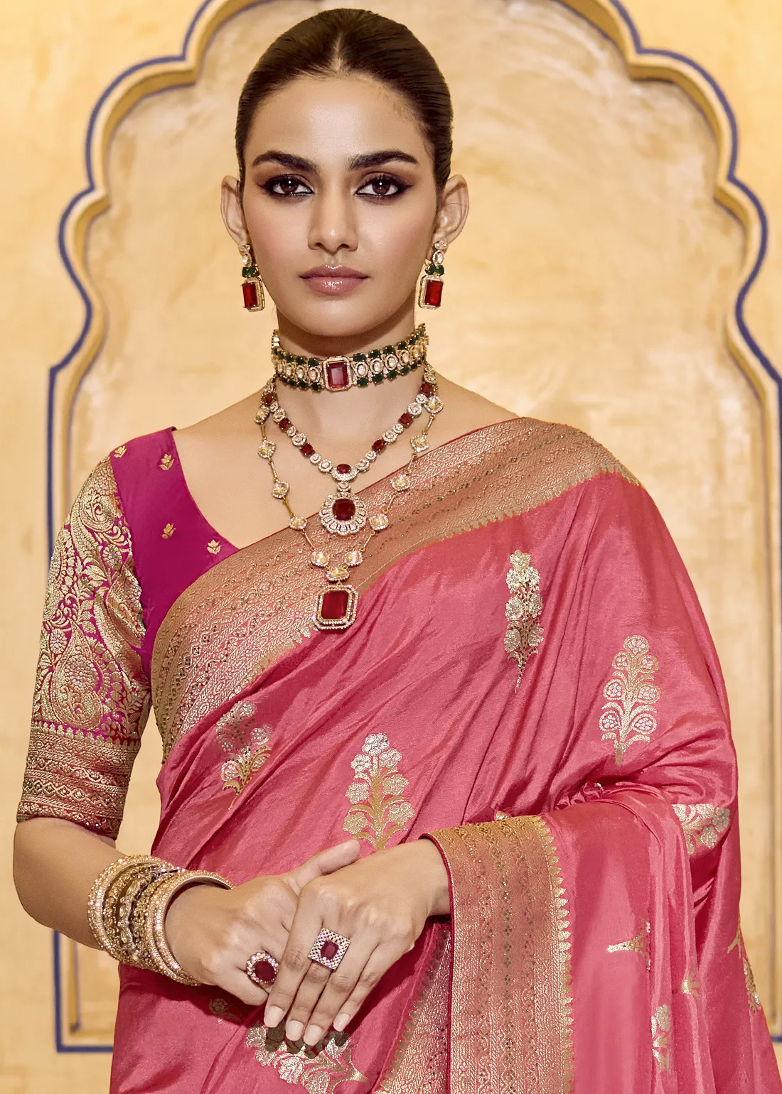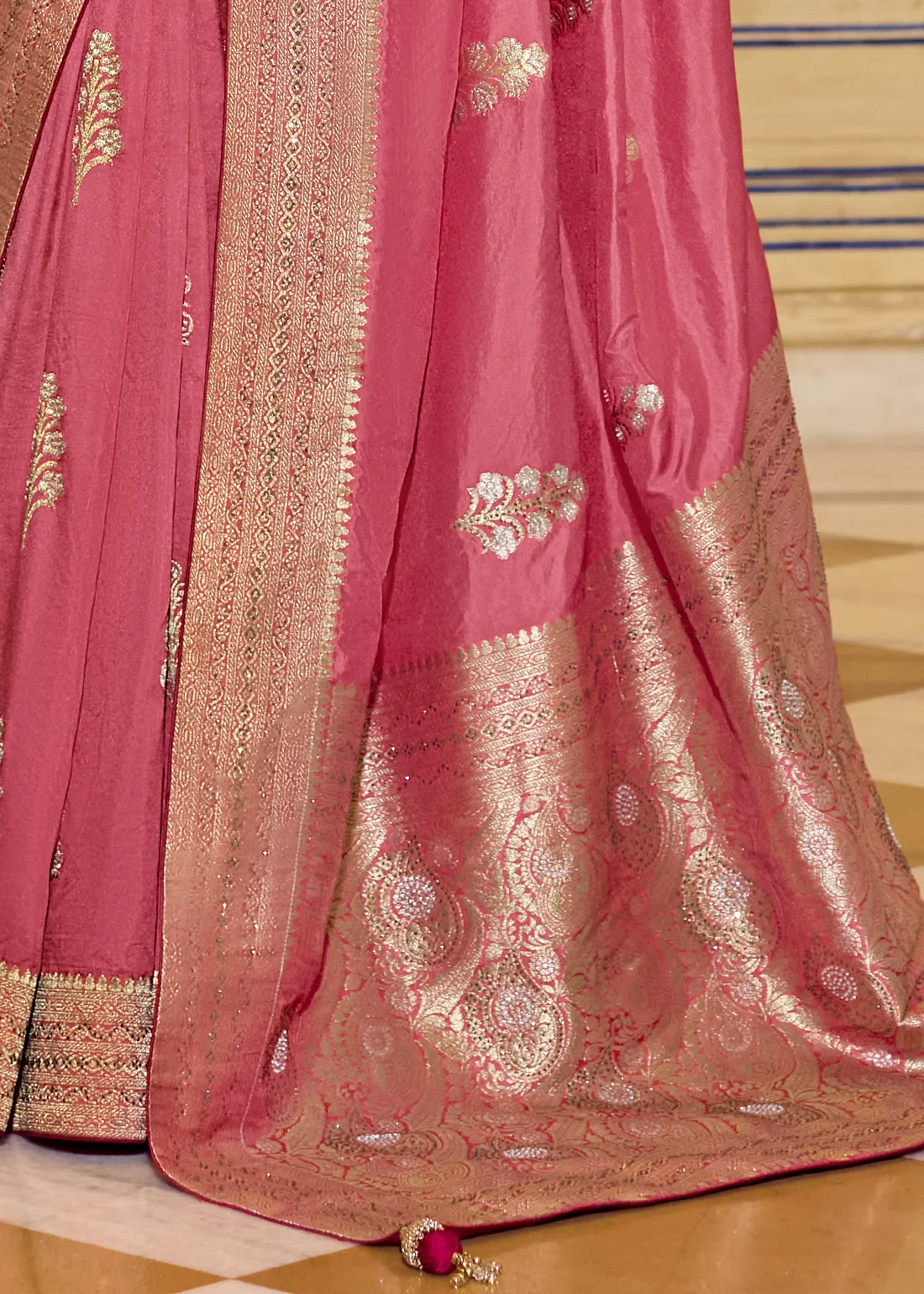 Step into timeless elegance with our Majestic Coral Pink Banarasi Crepe Silk Saree, an exquisite piece from our premium Banarasi Stone Work Collection. Crafted in a rich coral hue, this saree features intricate golden zari weaving, showcasing traditional motifs, and heritage patterns. Delicately placed handworked stones enhance the luxurious zari detailing, adding a subtle shimmer perfect for festive lights and wedding functions. This saree blends royal craftsmanship with modern glamour, giving you a regal drape with effortless grace.