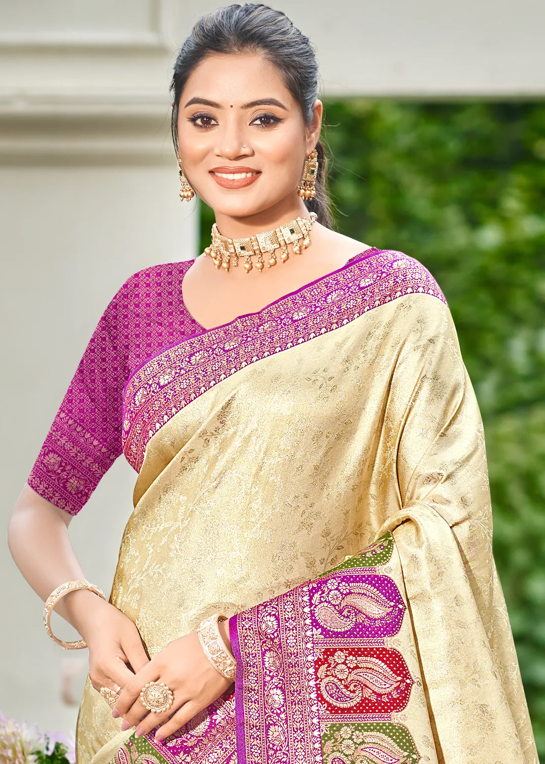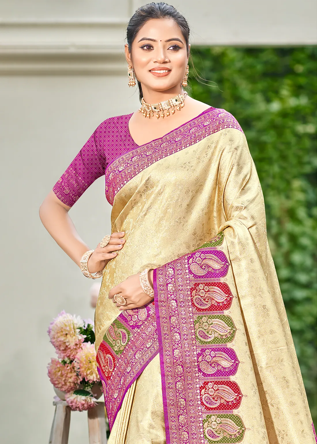 Saree: Radiate timeless grace with this breathtaking Cream Kanjivaram Silk Saree. The luminous, light golden body is intricately woven with delicate zari floral vines, creating a rich yet understated elegance. The true showstopper is the vibrant Orchid Purple contrast border, featuring spectacular Meenakari weaving—colorful threadwork that brings the traditional paisley motifs to life. Finished with a grand, heavy zari woven pallu, this drape is an absolute masterpiece for weddings, festive pujas, and grand cultural celebrations.