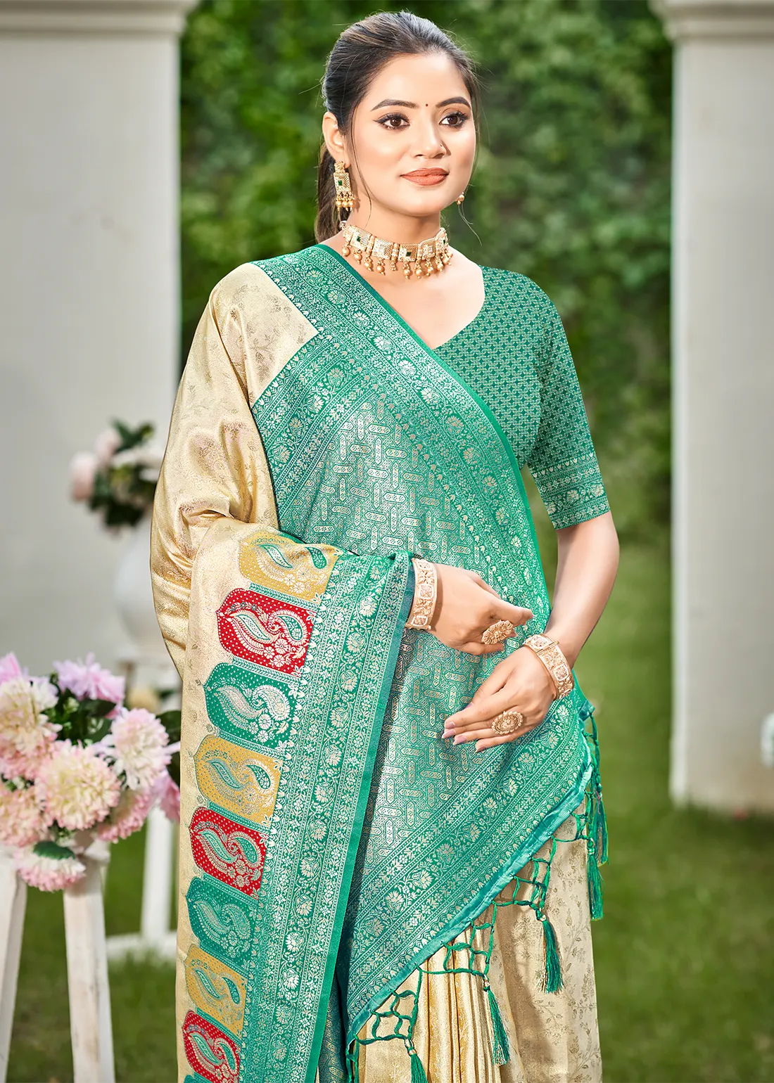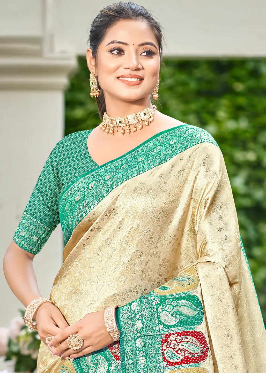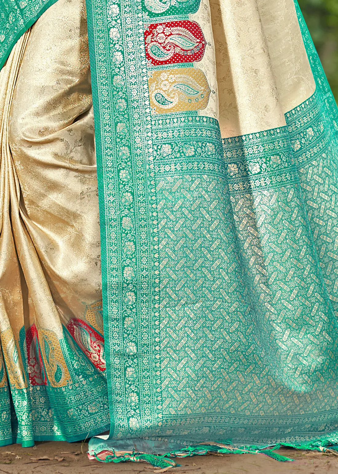 Cream Kanjivaram Silk Saree with Sea Green Blouse