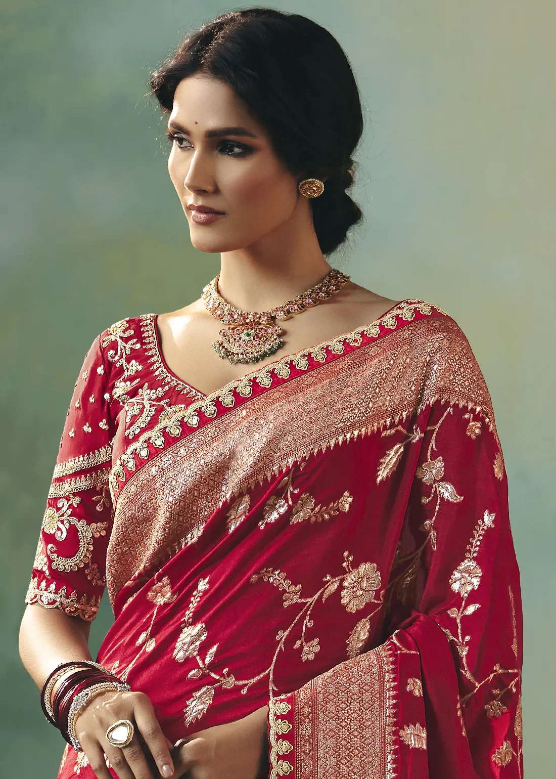 Crimson Red Banarasi Dola Silk Saree with Embroidered Blouse