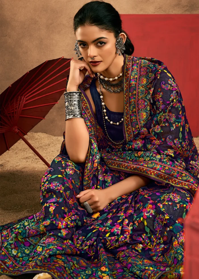 Saree: Crafted with meticulous attention to detail, this Modal Cotton Dark Navy Kashmiri Jamawar Saree encapsulates the rich cultural heritage and traditional craftsmanship of Kashmir, making it a treasured possession for generations to come. With its versatile drape, this saree beautifully complements any occasion, whether it’s a wedding celebration, a festive gathering, or a social event.