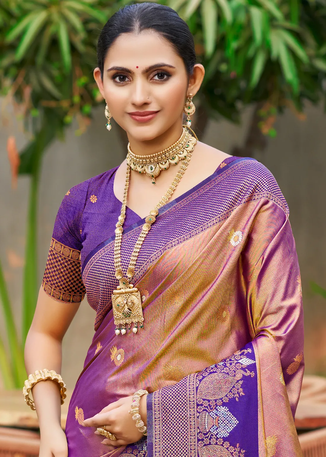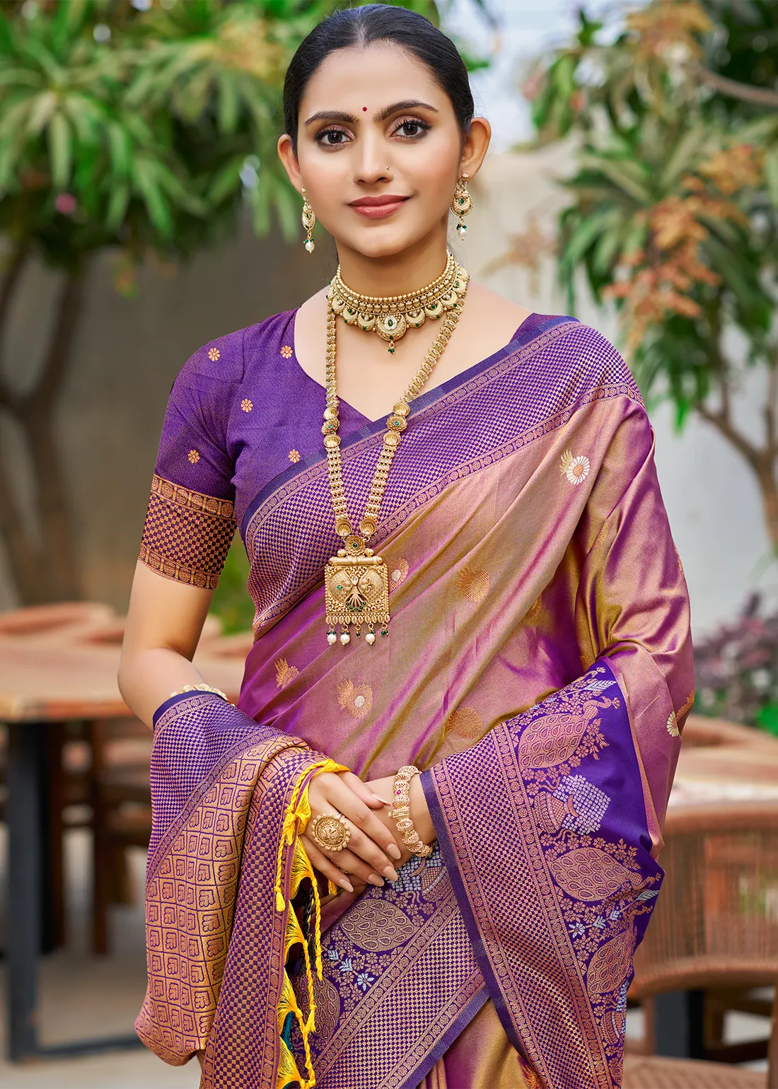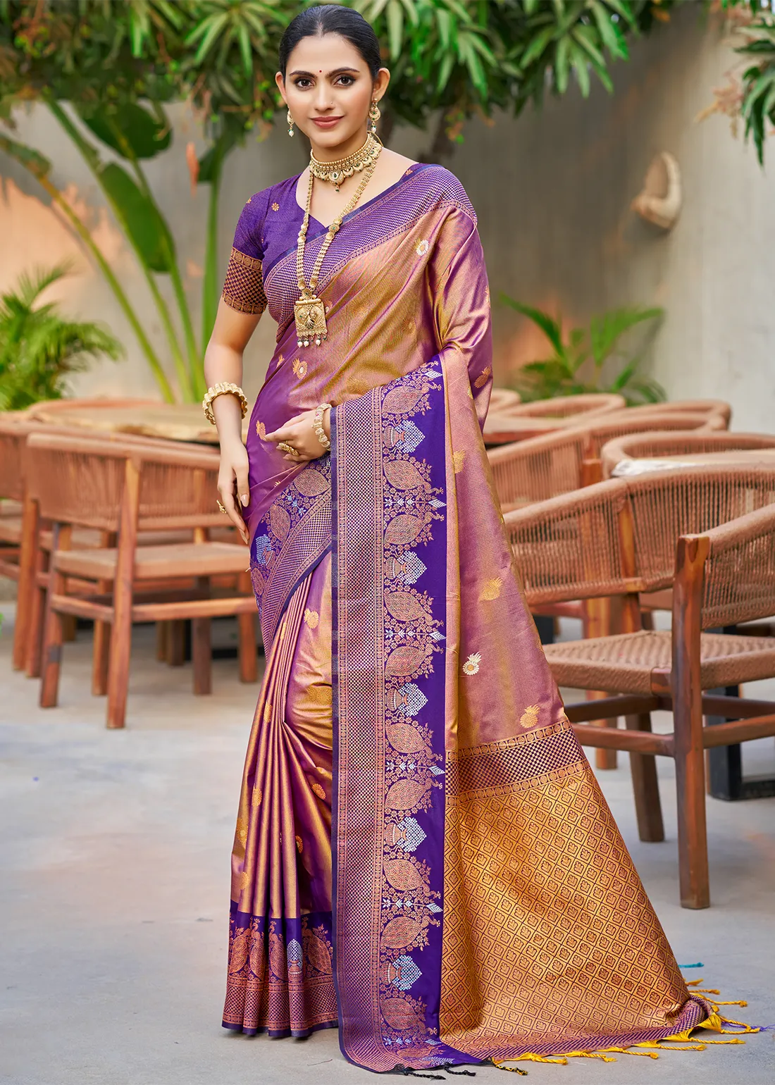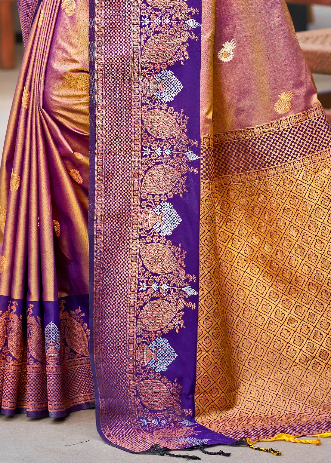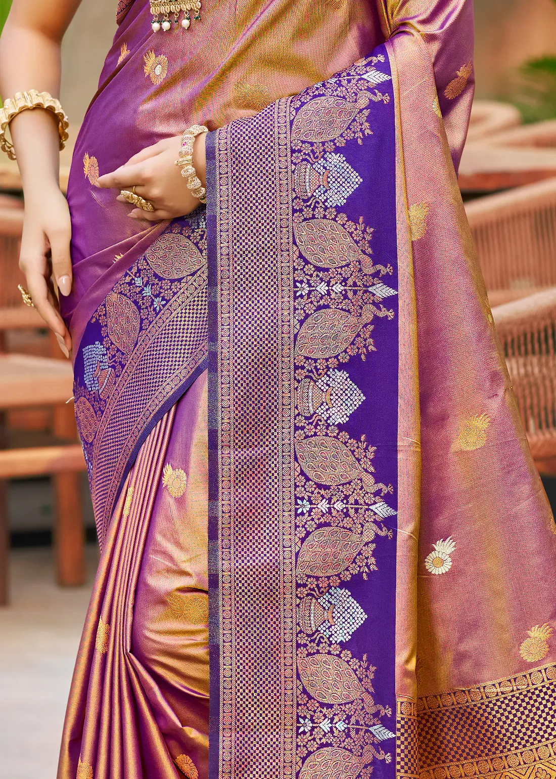 Dual-Tone Lilac Gold Banarasi Silk Saree with Deep Violet Border