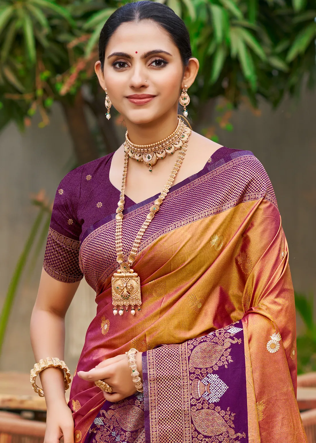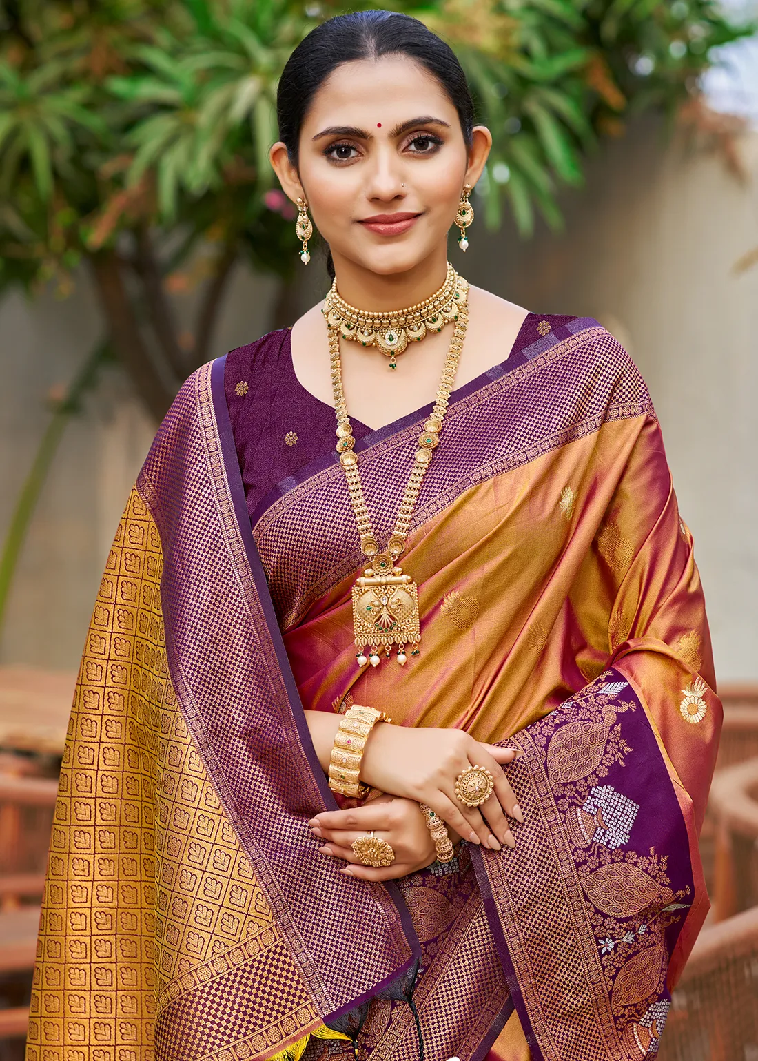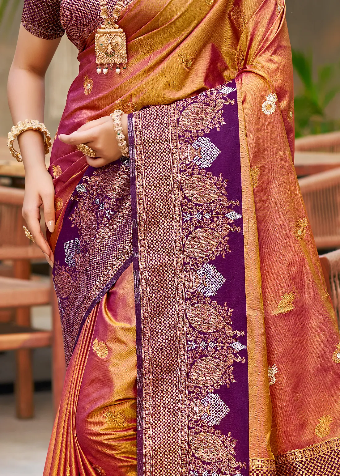 Dual-Tone Lilac Gold Banarasi Silk Saree with Deep Violet Border