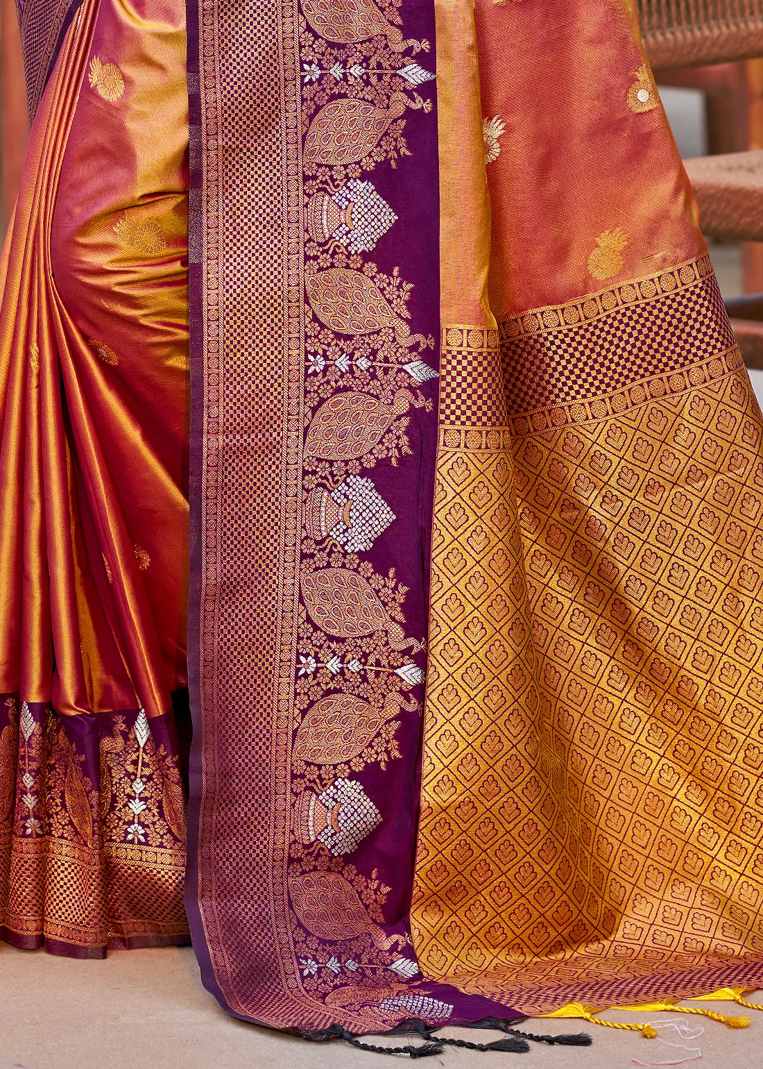 Dual-Tone Sunset Orange Banarasi Silk Saree with Tri-Color Zari