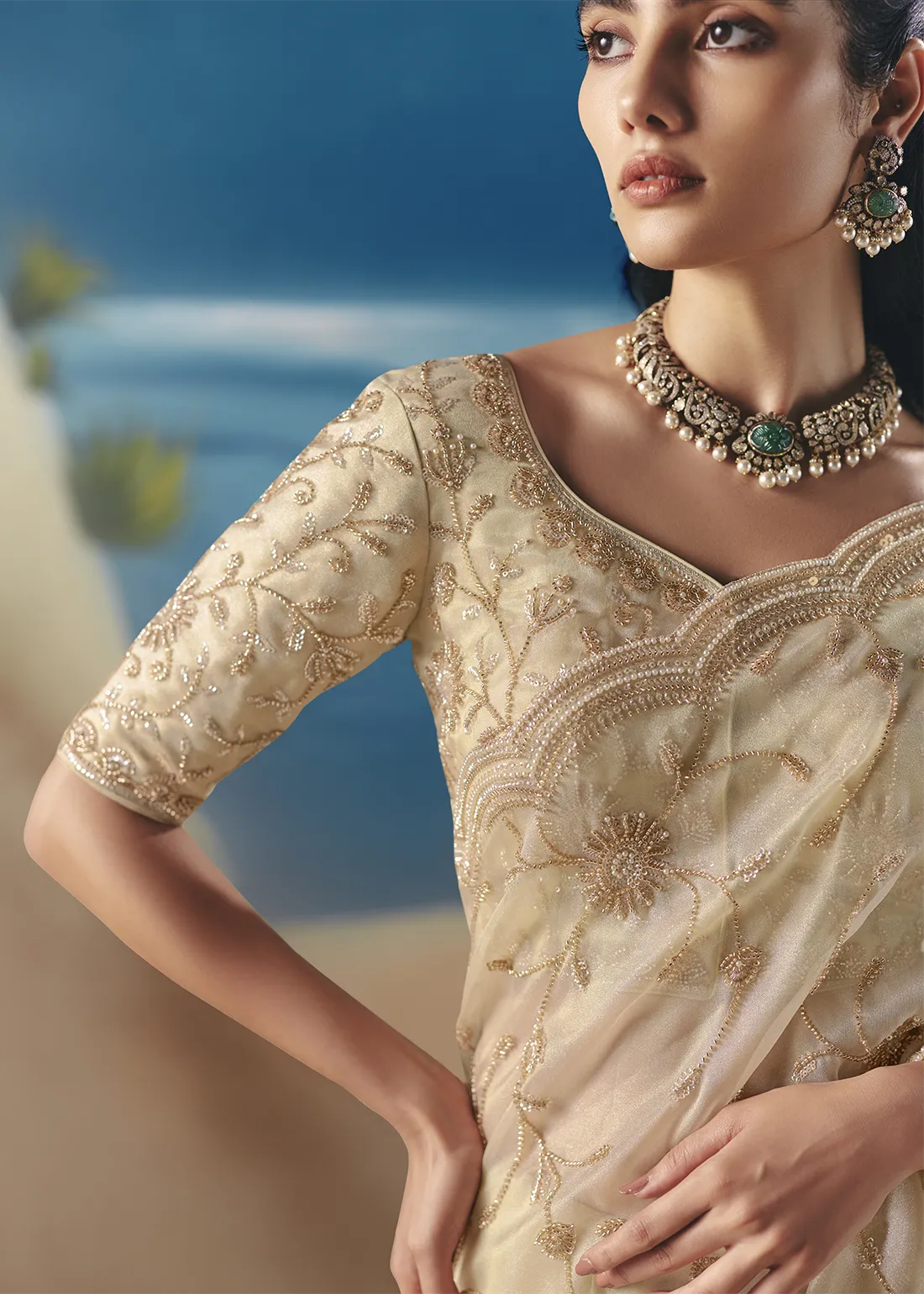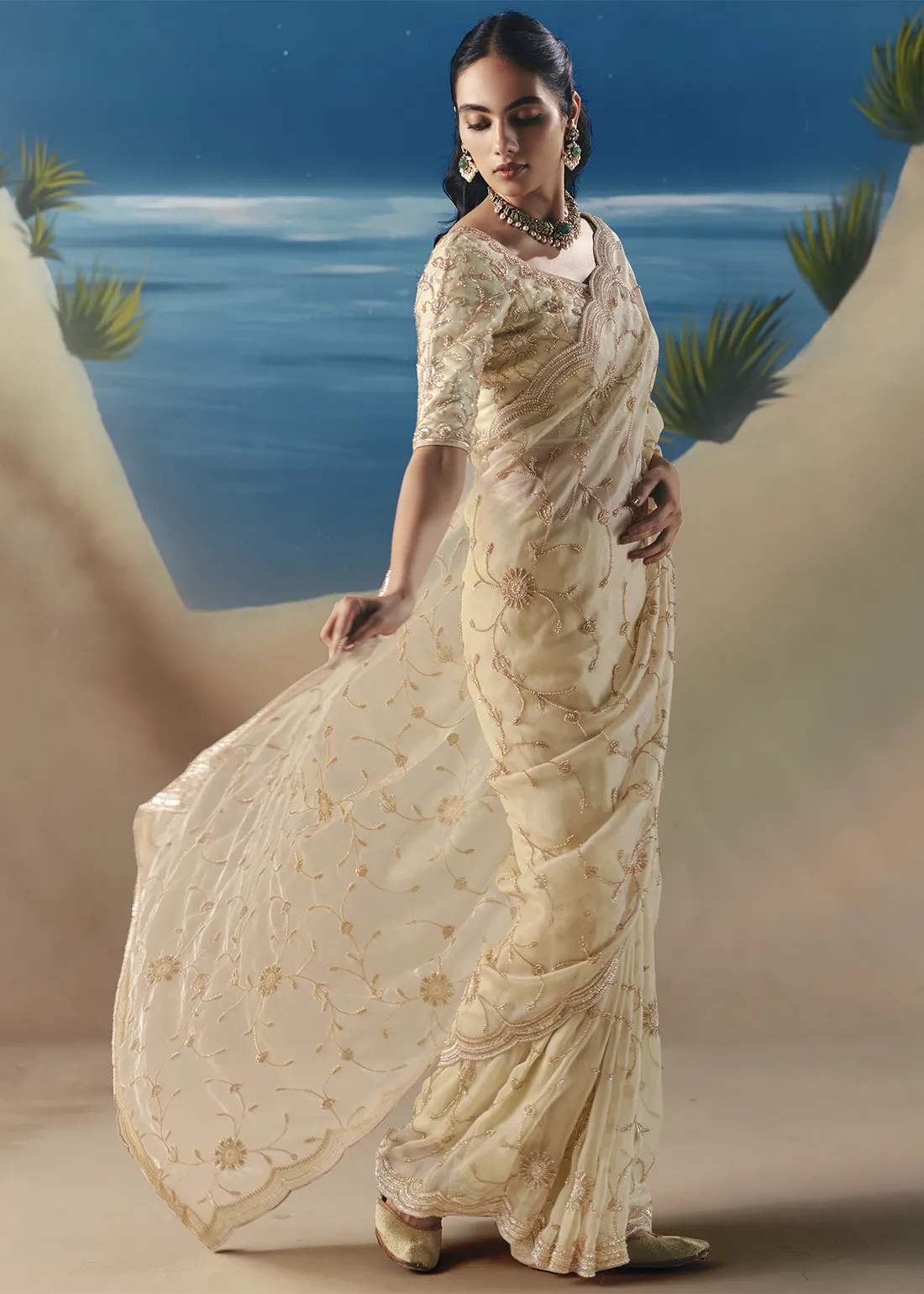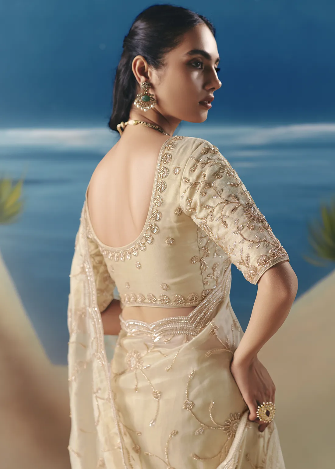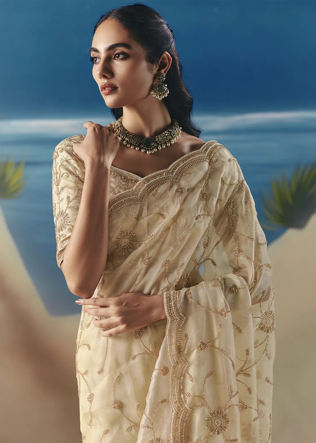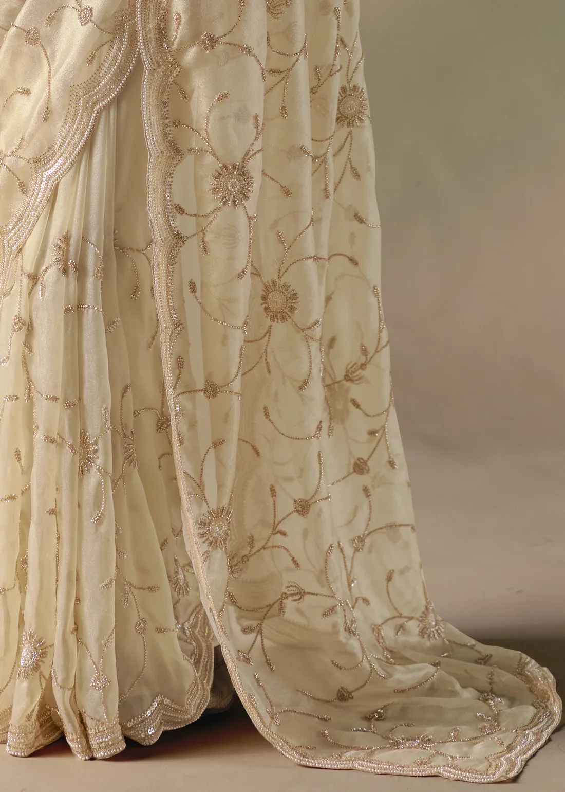 Embellished Cream Organza Silk Saree with Cutdana & Beads