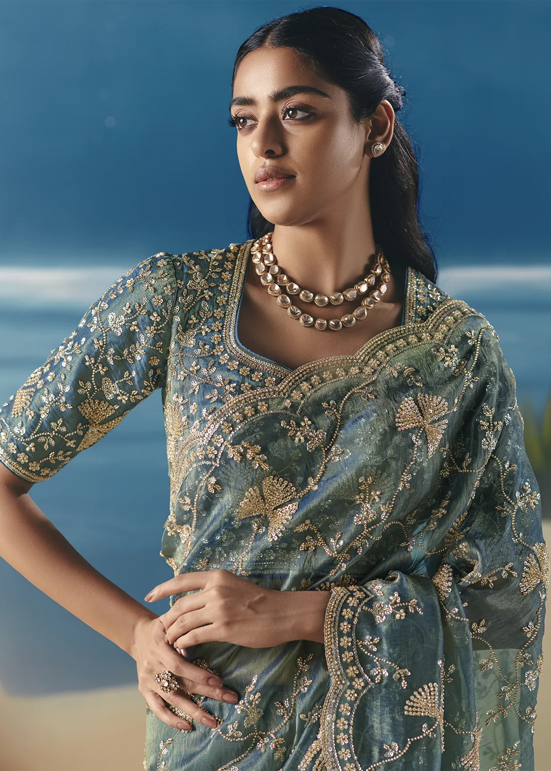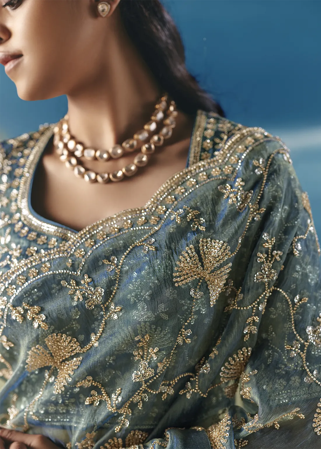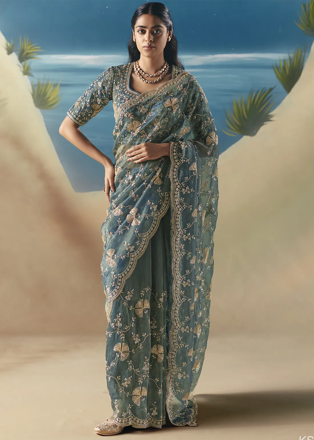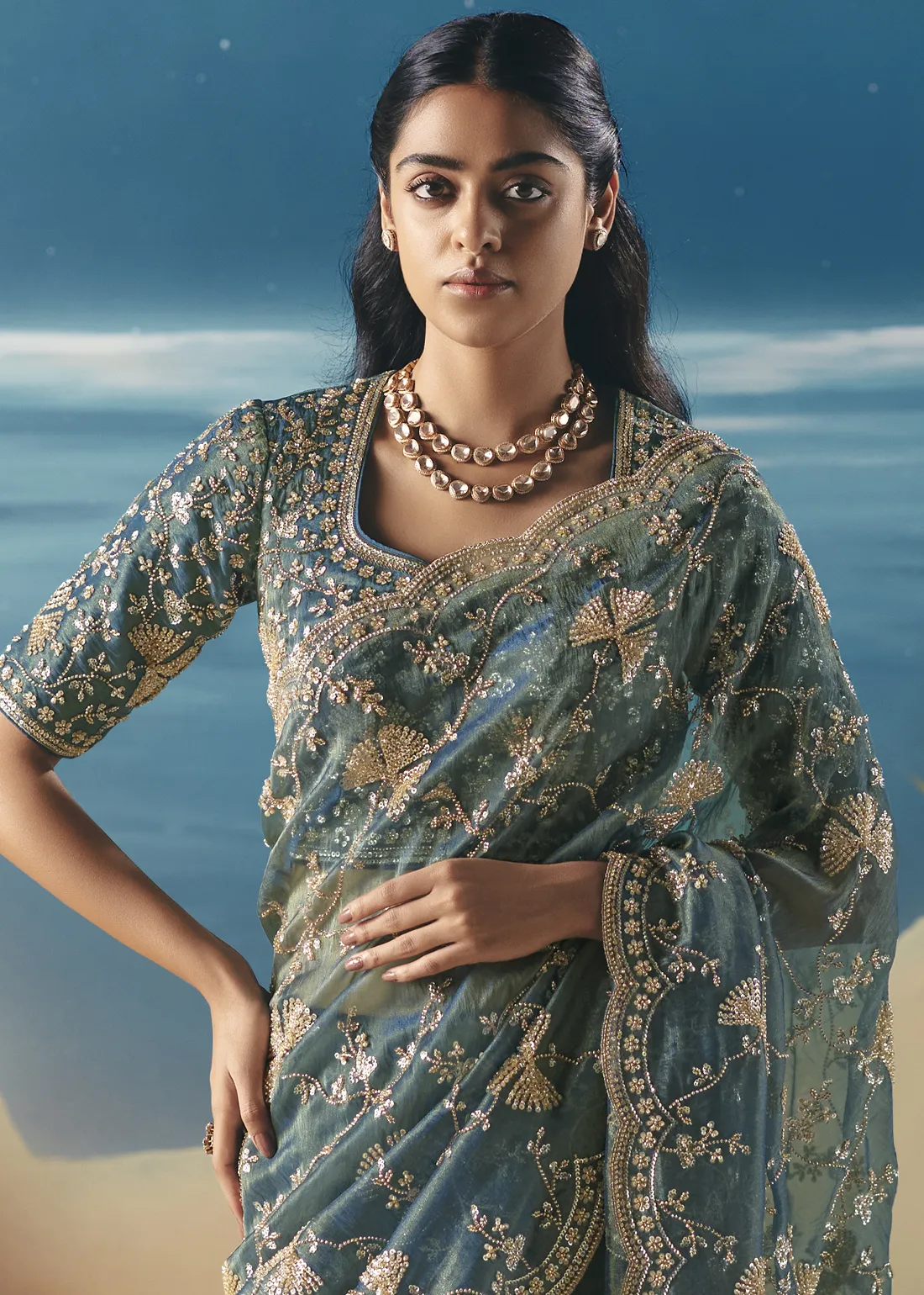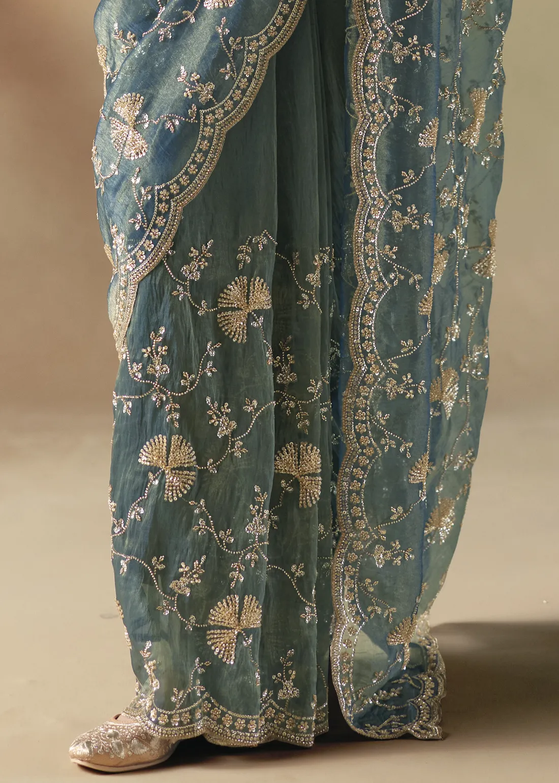 Embellished Teal Organza Silk Saree with Cutdana & Beads