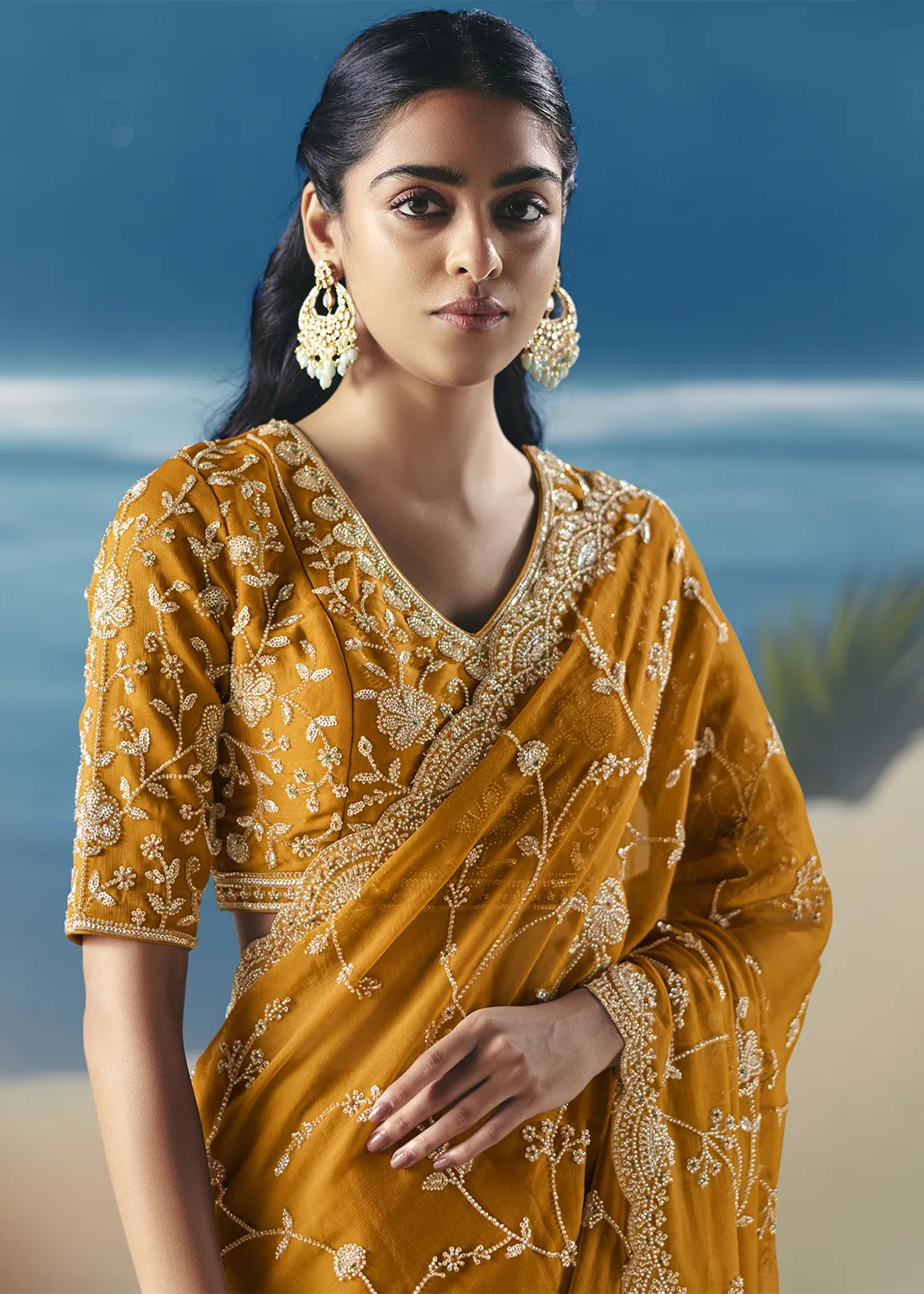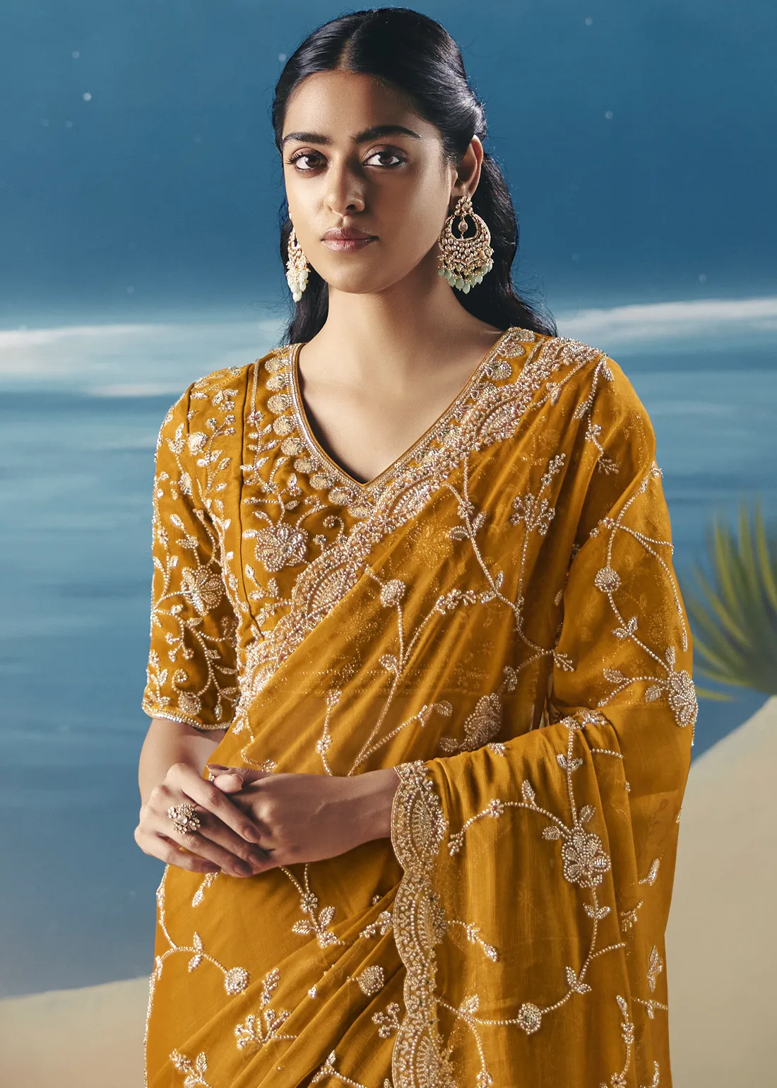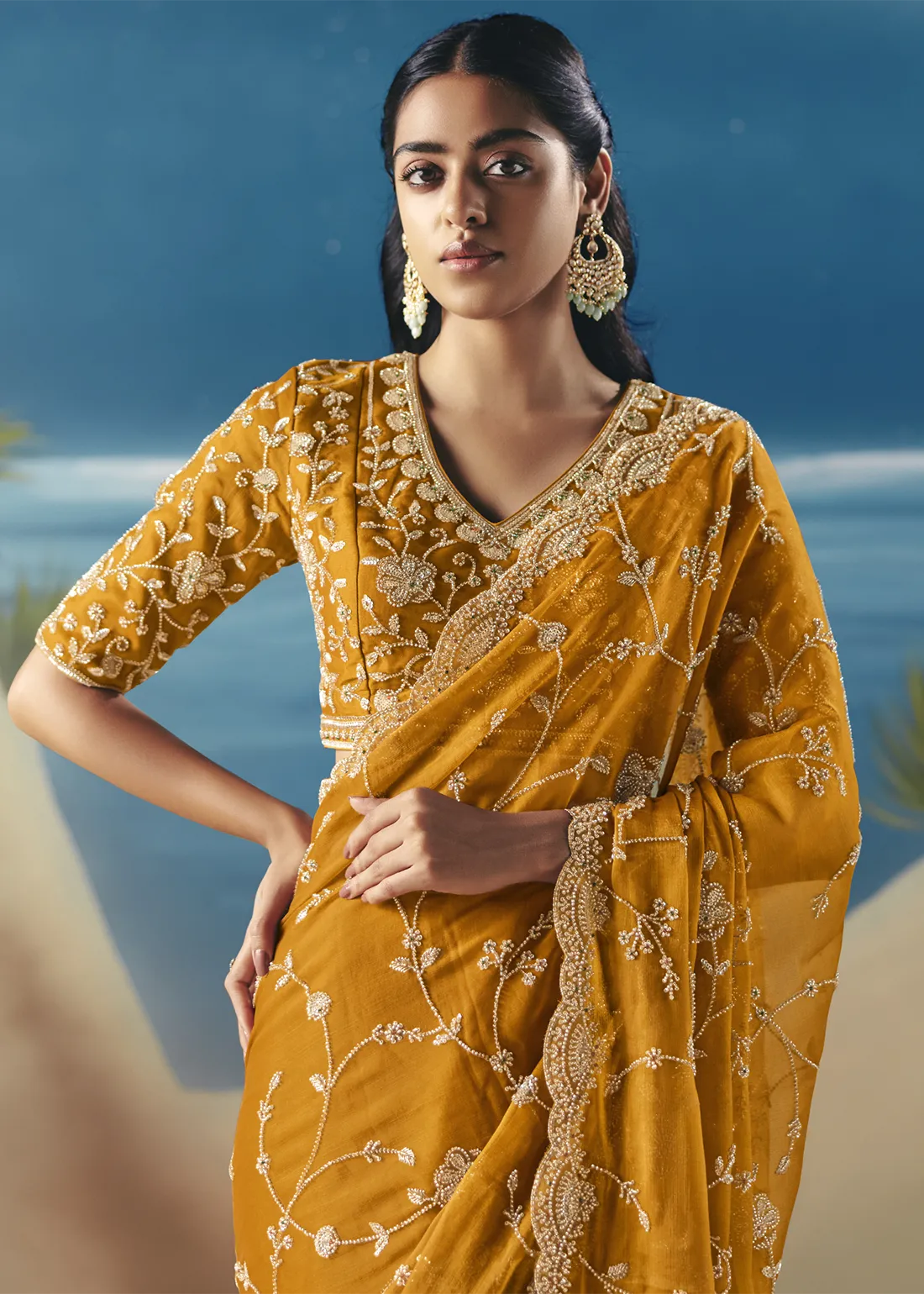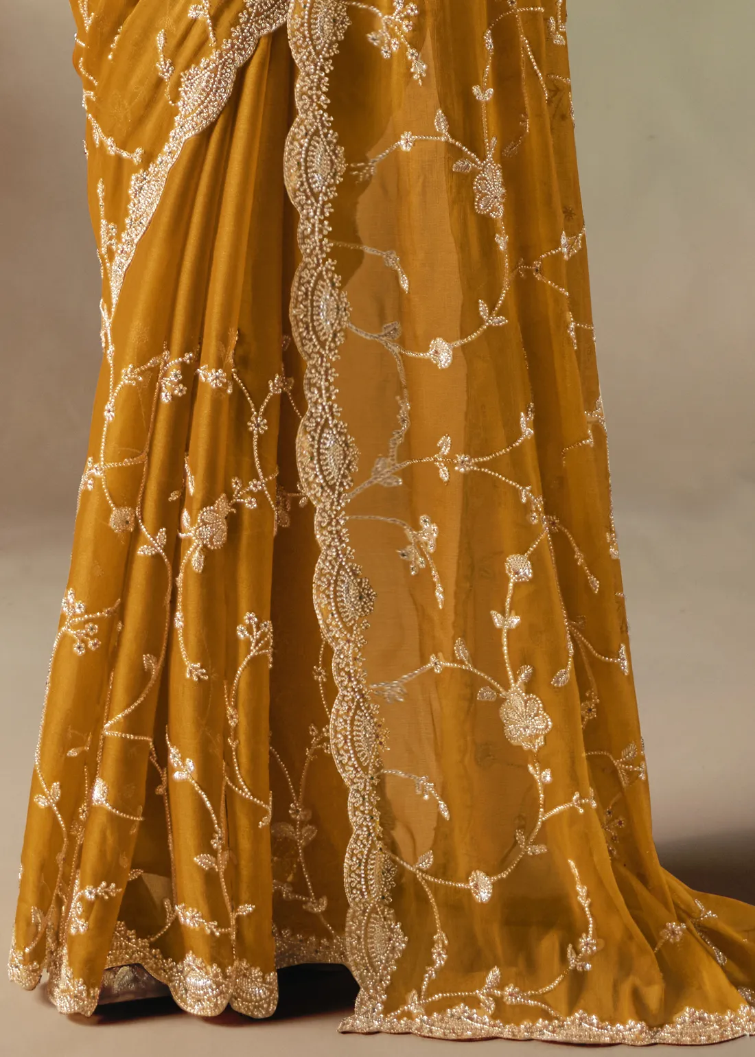 Embellished Mustard Yellow Organza Silk Saree with Cutdana & Beads