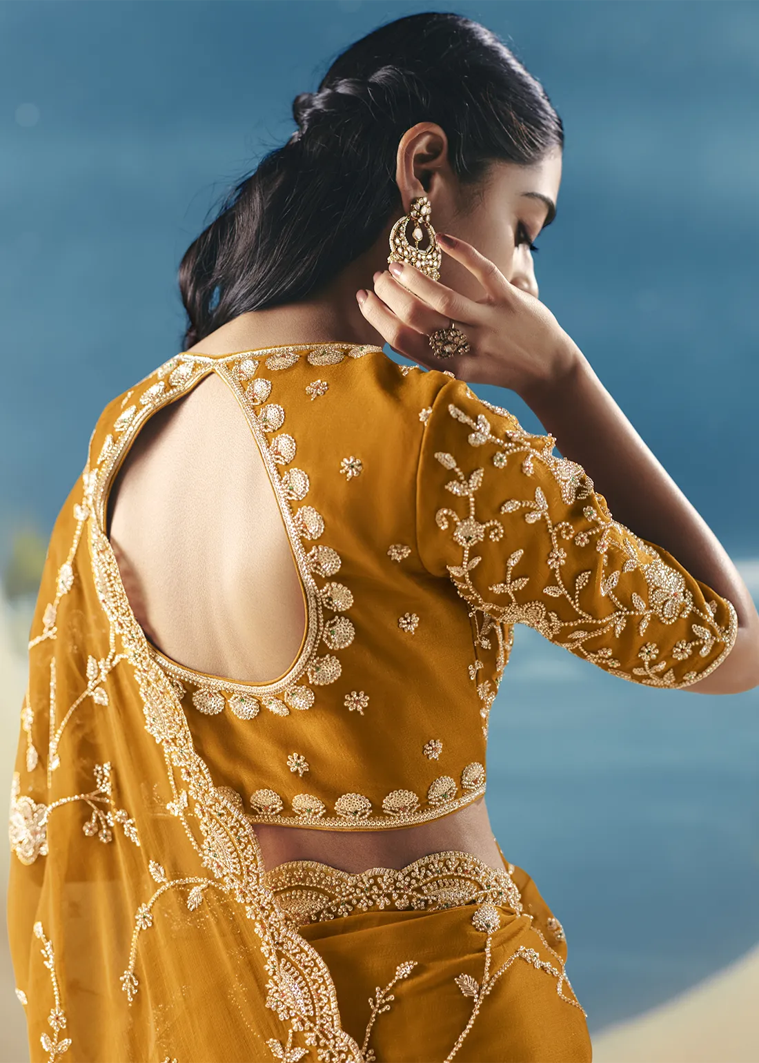 Elevate your festive and wedding wardrobe with this exquisite Mustard Yellow Saree, crafted from premium Organza silk. The saree features intricate embellished work adorned with shimmering sequins, delicate cutdana, and fine beads — adding a touch of ethereal charm and sophistication.