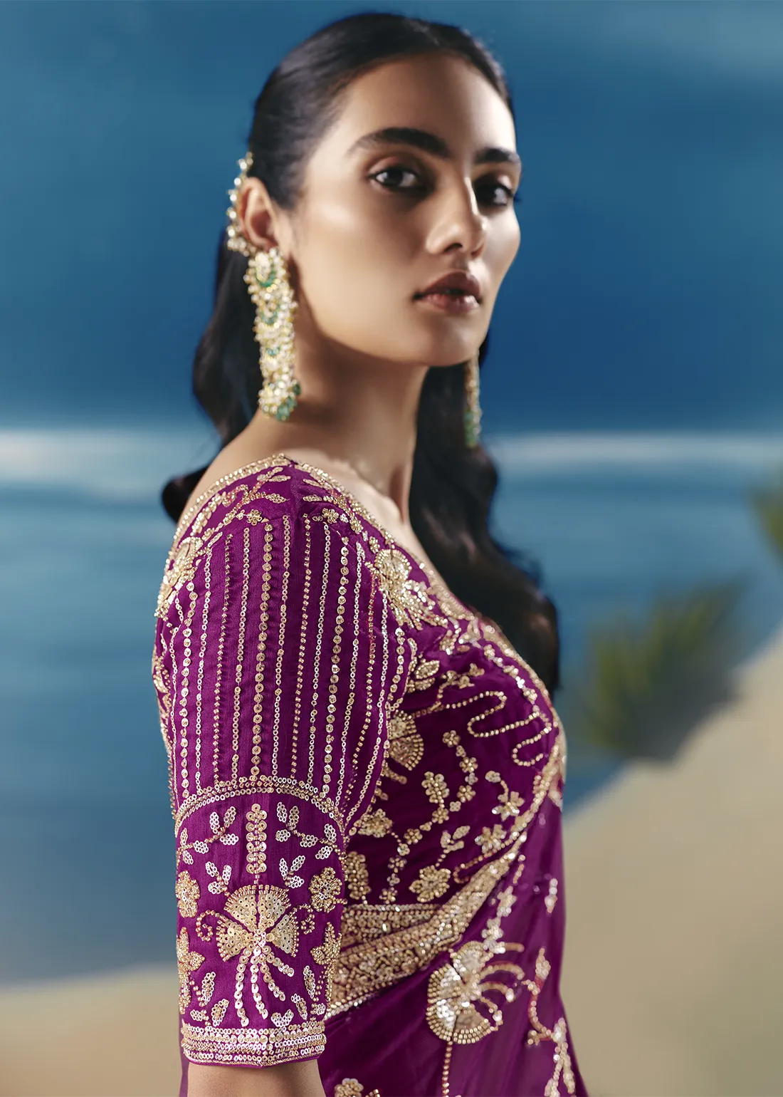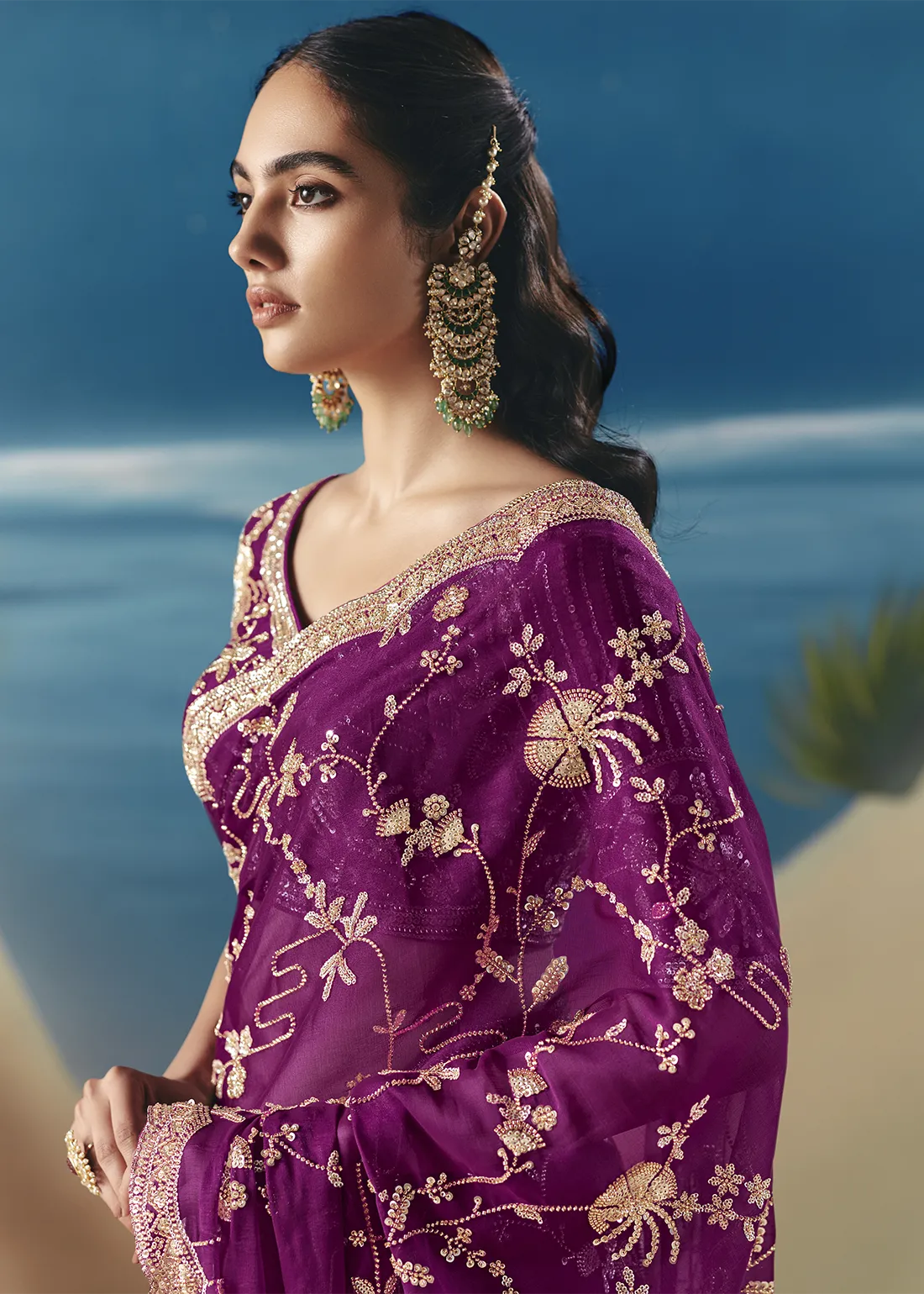 The luxurious purple hue perfectly complements the golden embroidery, creating a sophisticated look ideal for weddings, receptions, or grand festivities. Lightweight yet opulent, this saree drapes beautifully, offering a blend of timeless tradition and modern allure.