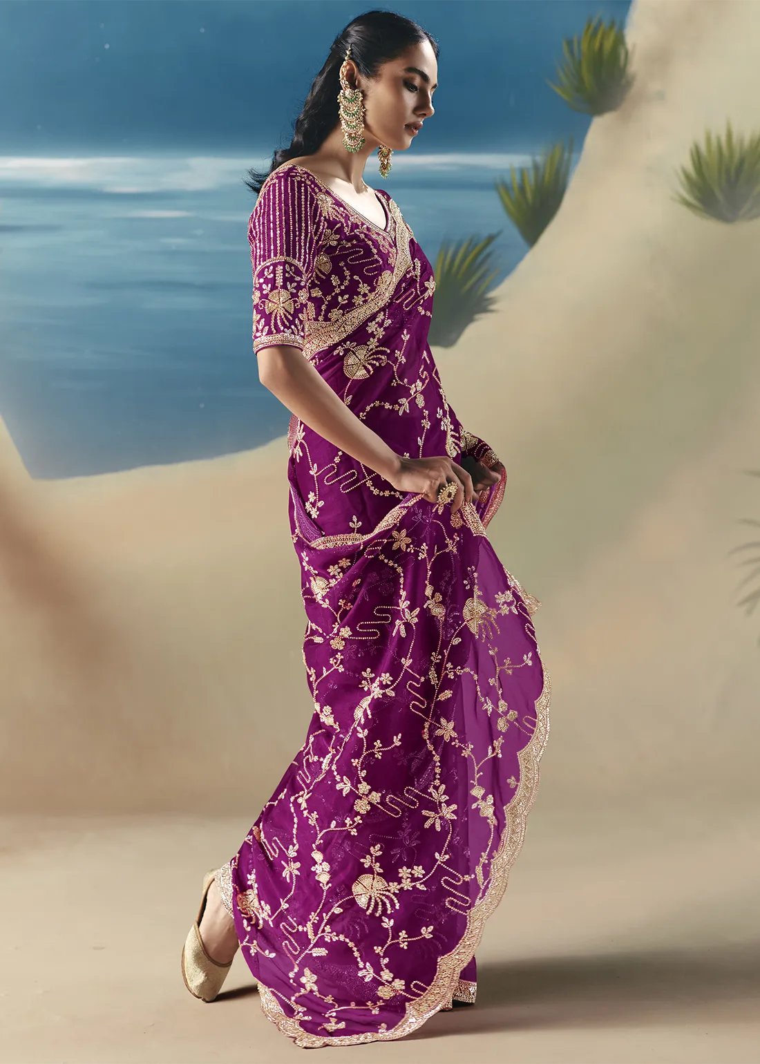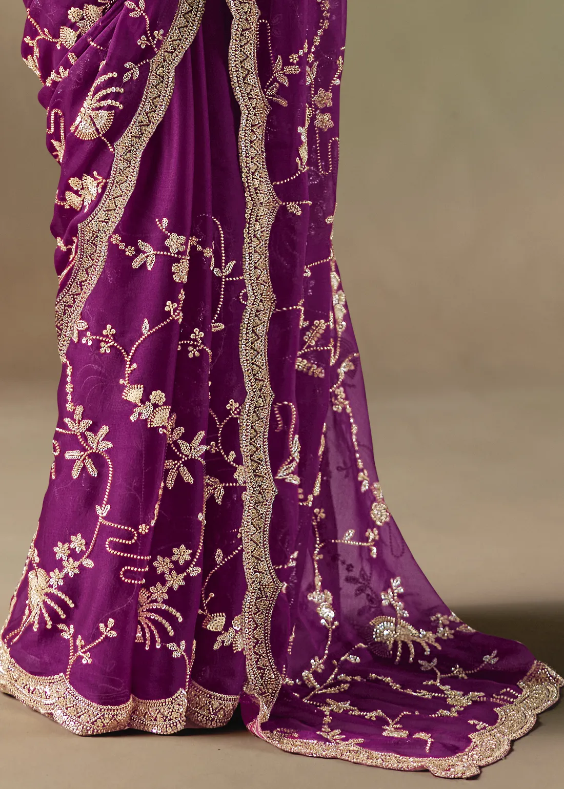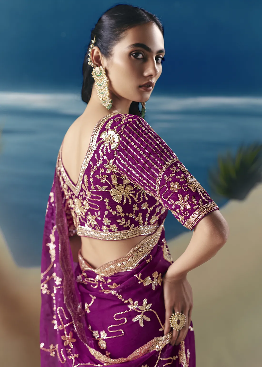 Embellished Purple Organza Silk Saree with Cutdana & Beads