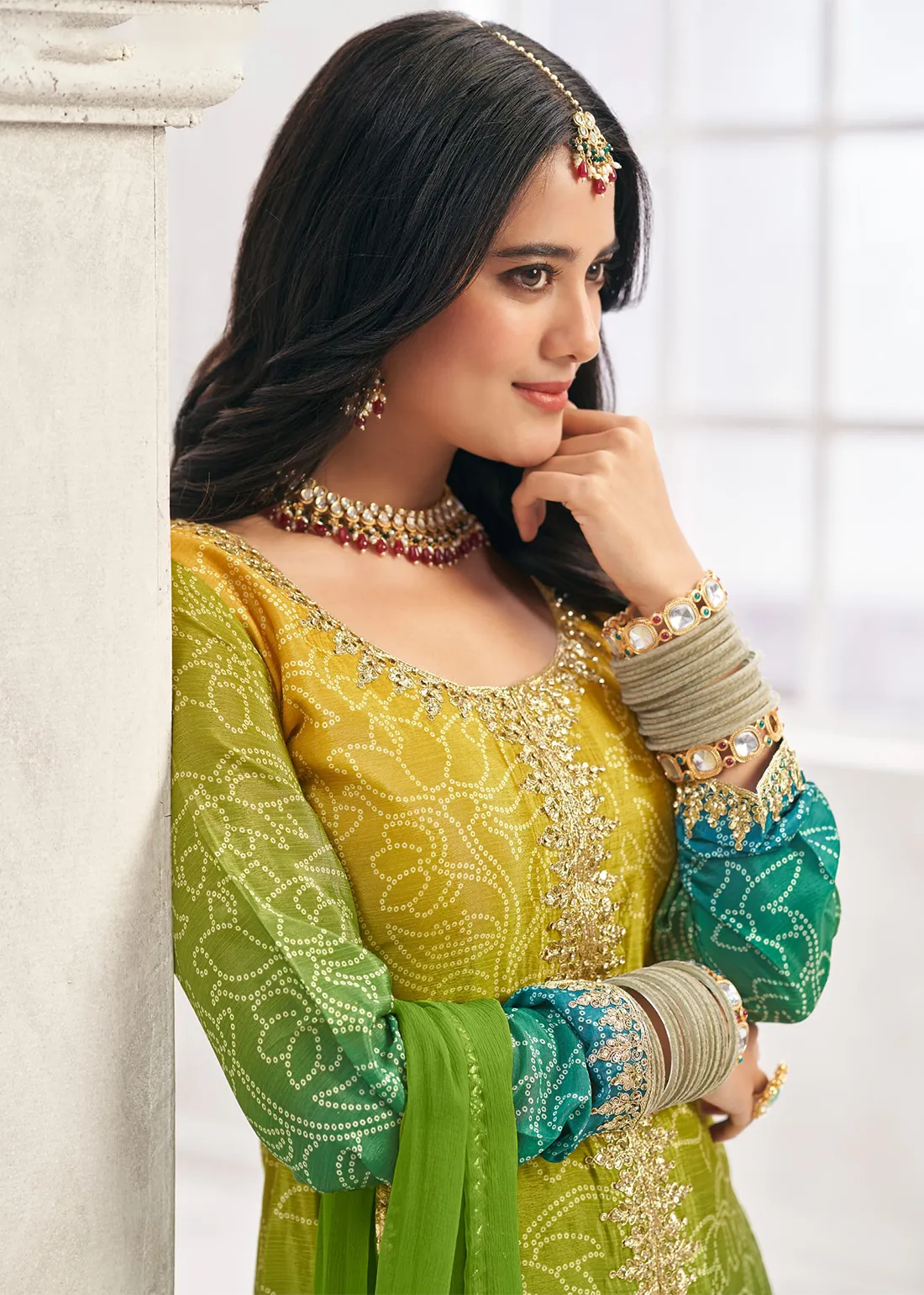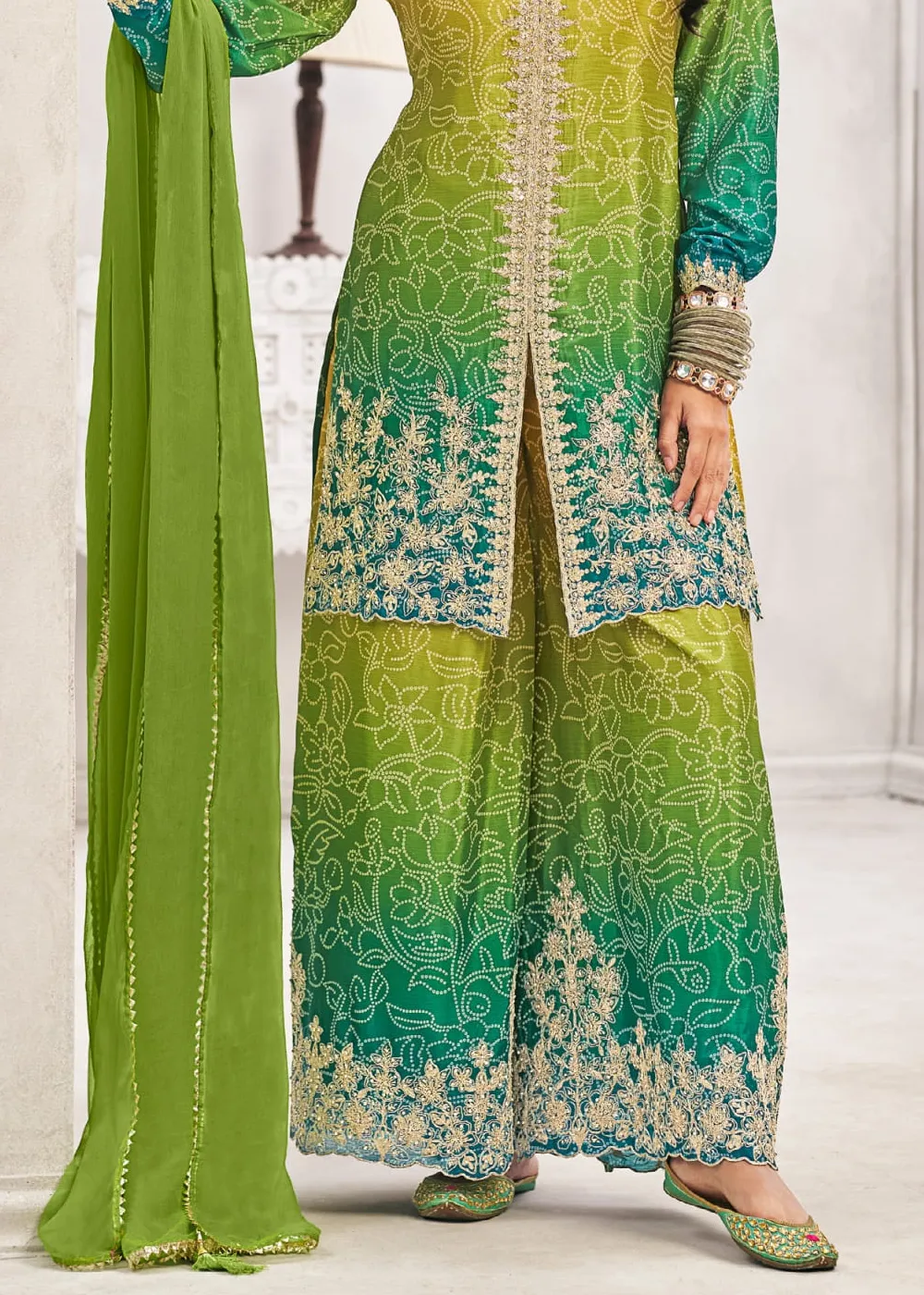 Embrace timeless elegance with this intricately embroidered Chinon Chiffon Ombré Green Sharara Suit. Delicate Zari and Sequins embroidery adorns the ensemble, adding a touch of dazzling shimmer to the Bandhani printed base. Crafted with meticulous attention to detail, this luxurious suit promises to turn heads and make you a vision of sophisticated beauty.