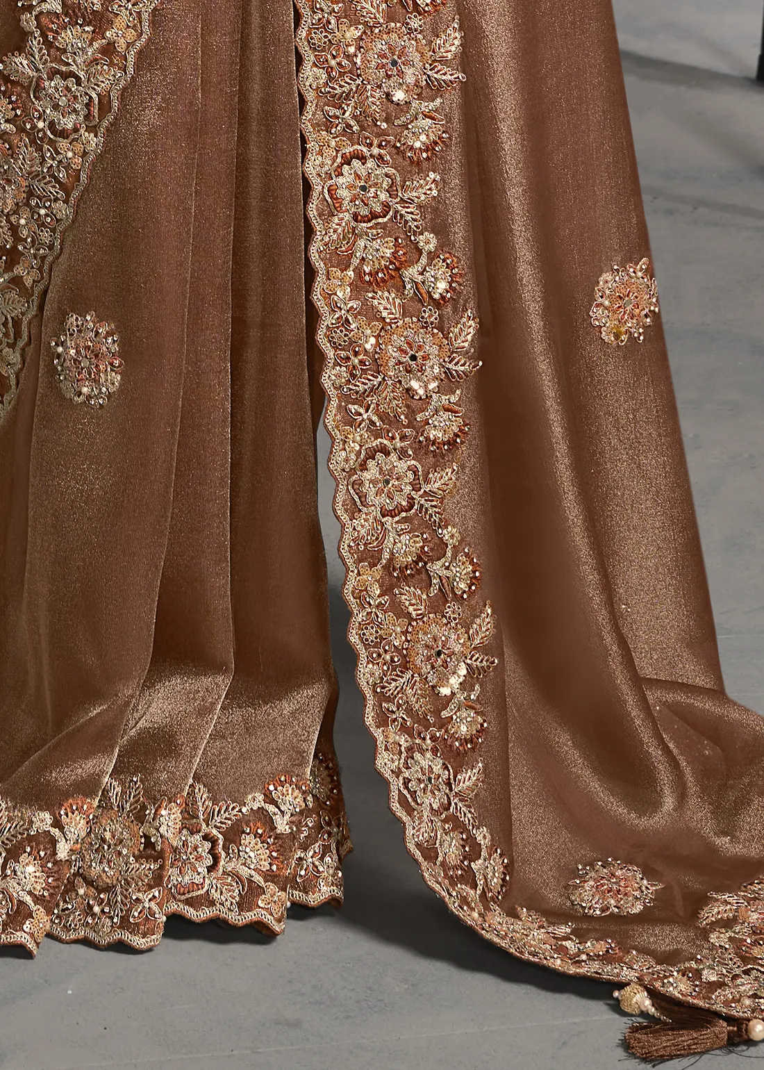 Embroidered Coffee Brown Tissue Silk Saree with Beads & Stone Work