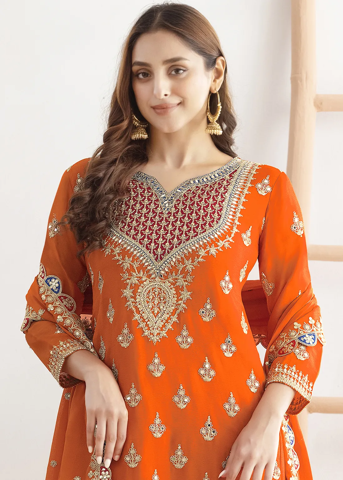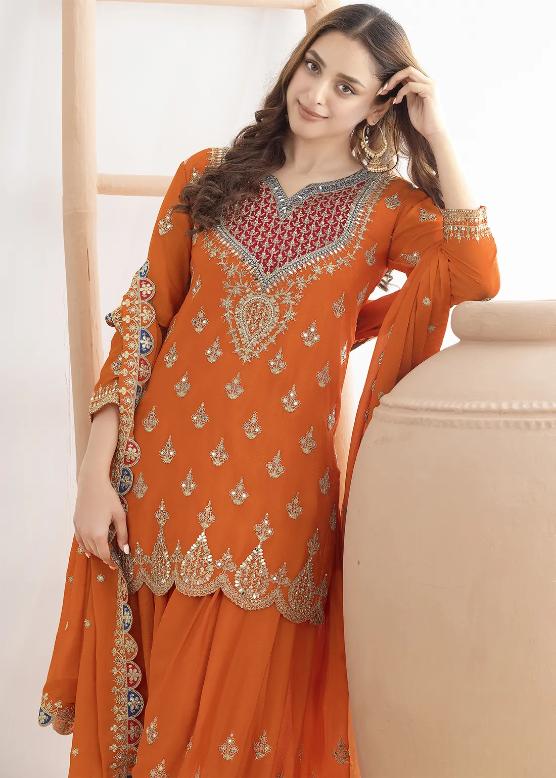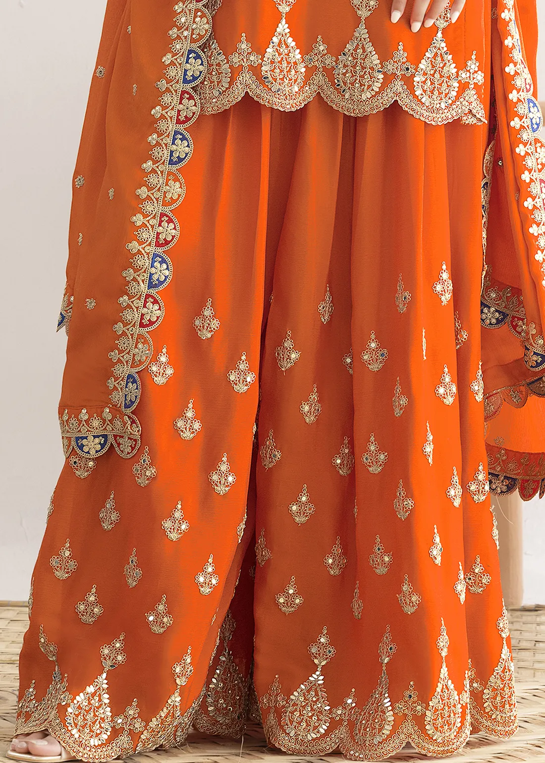 Make heads flip and charm everyone with your grace and beauty by opting for this gorgeous Embroidered Coral Orange Chinon Sharara Suit adorned with Zari, Mirror and Sequins work. Whether it’s a festive celebration, a wedding, or a cultural event, this gorgeous outfit is sure to make a lasting impression.