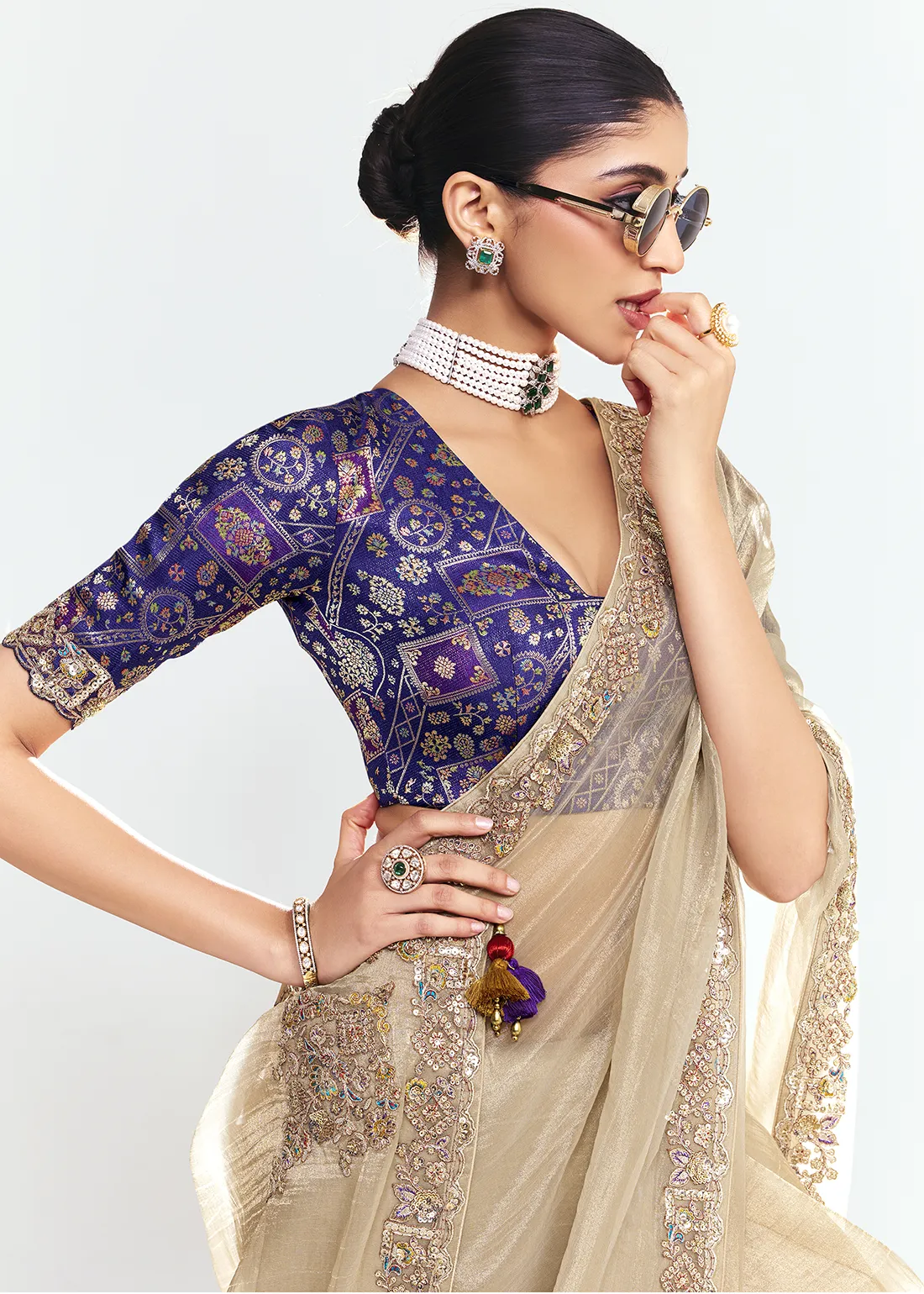 Cream Banarasi Dola Silk Saree with Embroidery Work