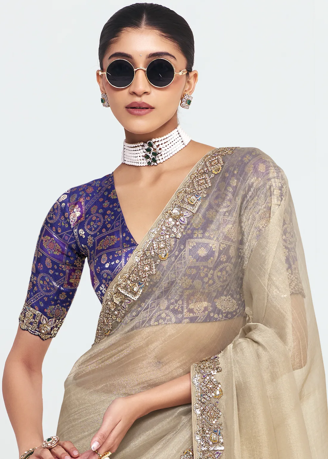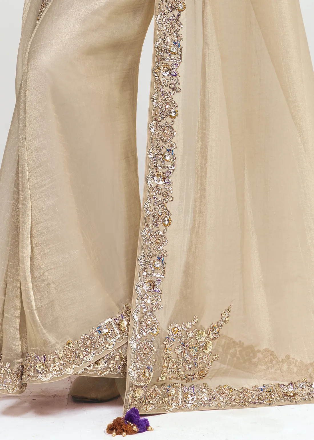 Step into effortless elegance with our Designer Embroidered Cream Organza Saree, specially curated for summer parties, cocktail evenings, and elegant celebrations. Crafted in lightweight, sheer organza, this saree is delicately beautified with sequins, dhaga, and intricate thread embroidery, creating a refined shimmer that feels luxurious yet breathable.