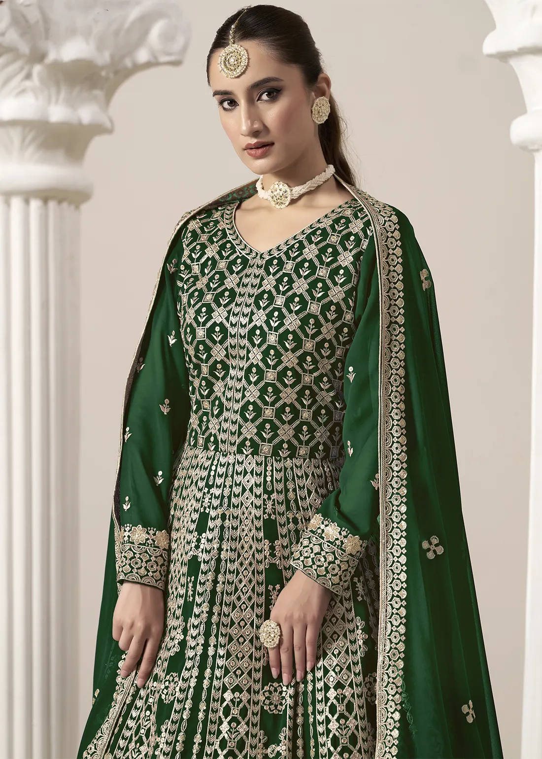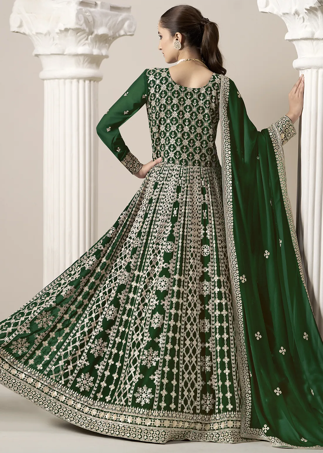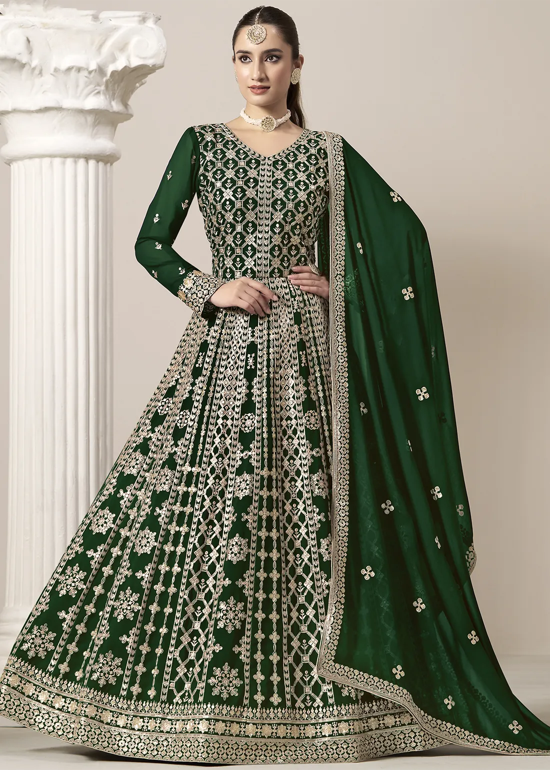 Bottle Green Anarkali Suit with Foil Print and Mirror Work
