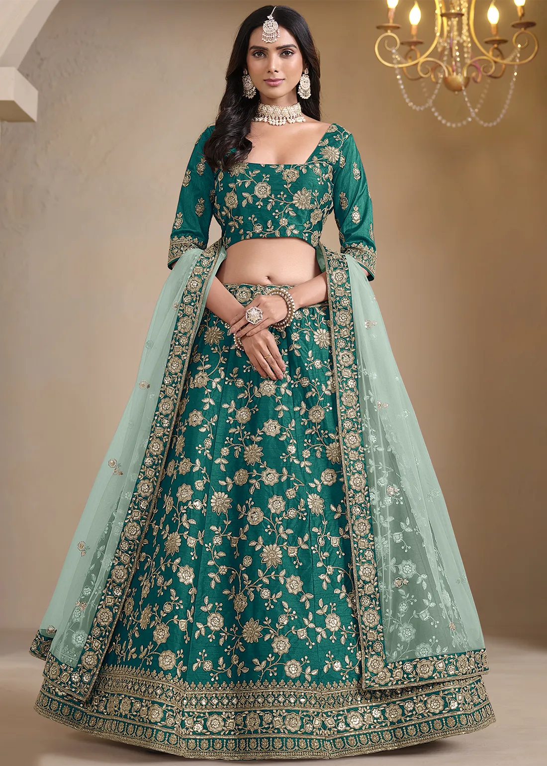 Embroidered Emerald Green Silk Lehenga with Net Dupatta