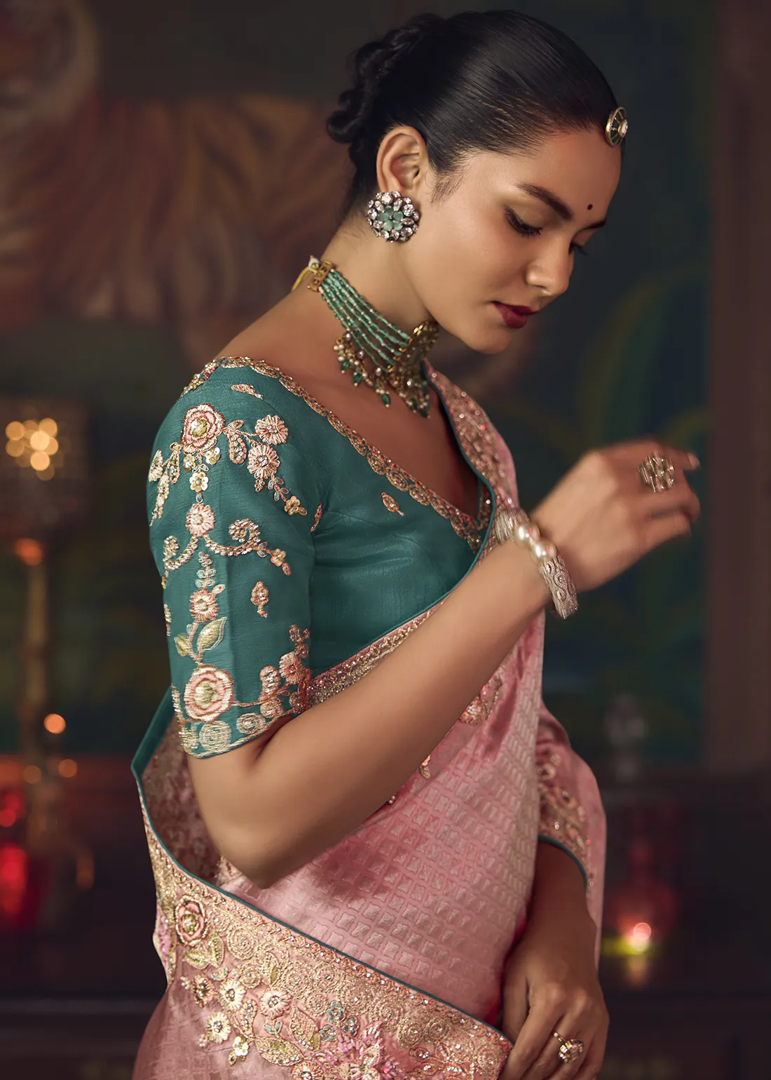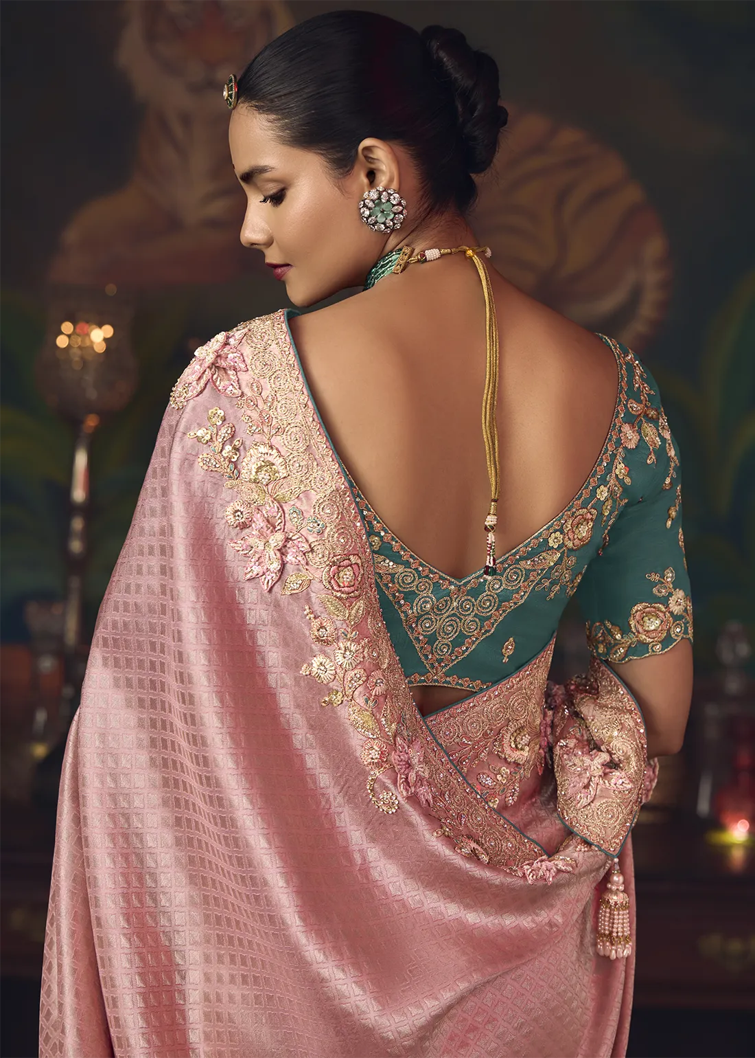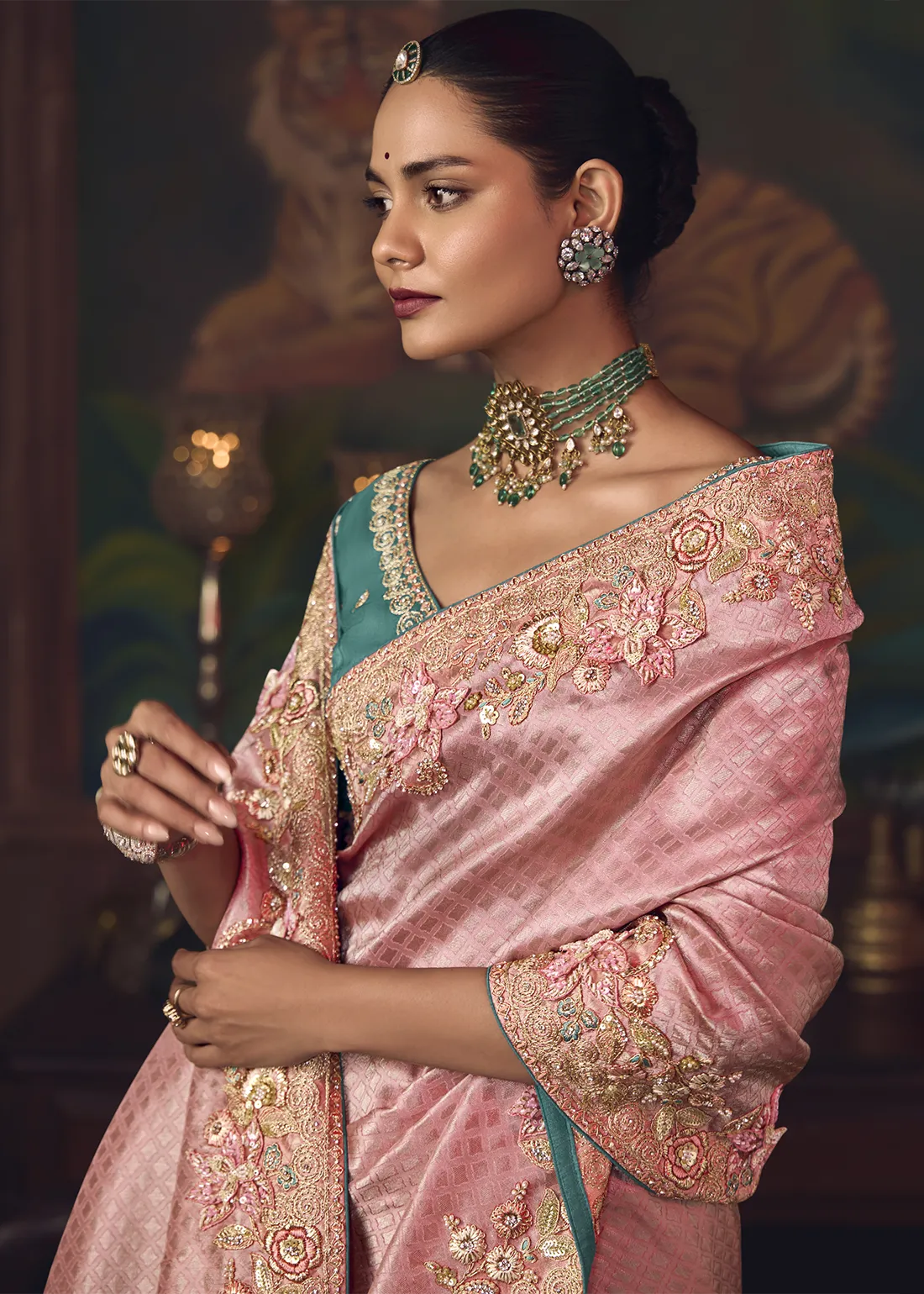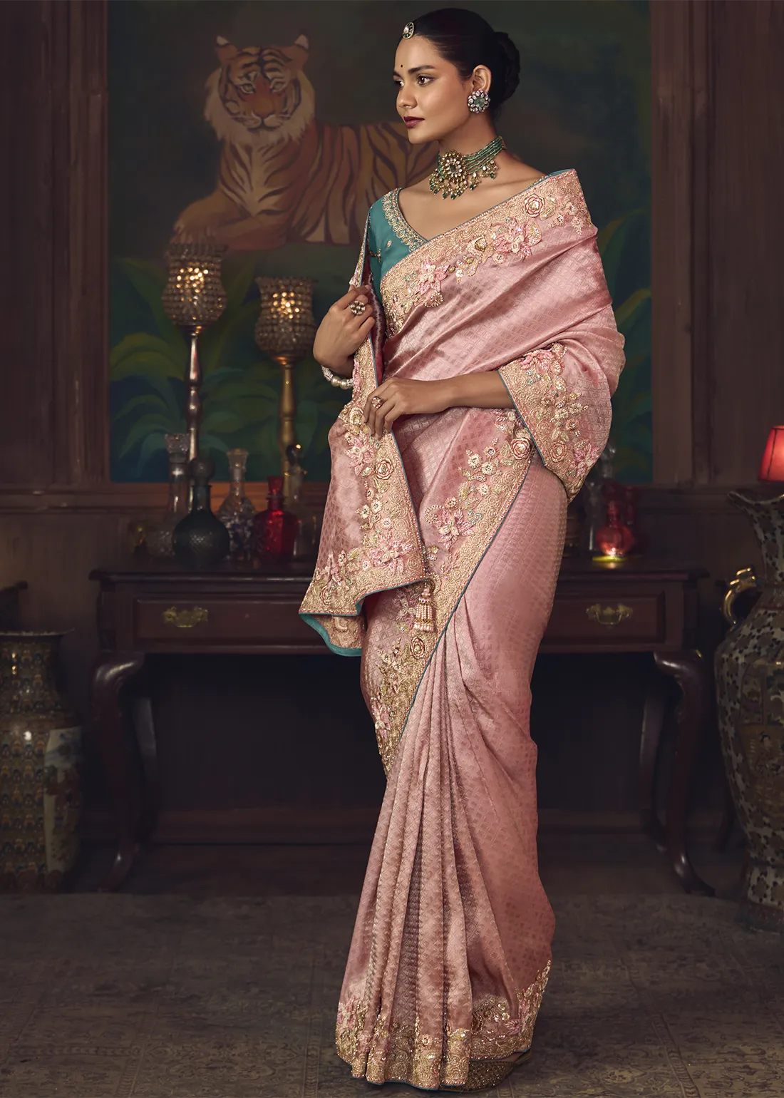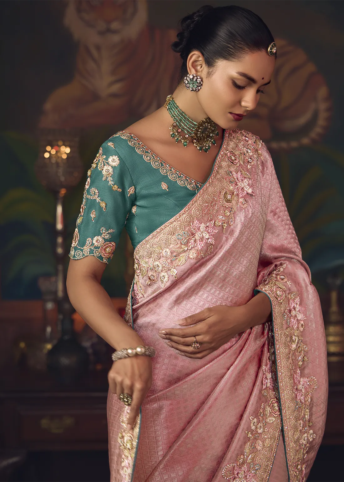 Embroidered Flamingo Pink Kanjivaram Silk Saree with Teal Blouse