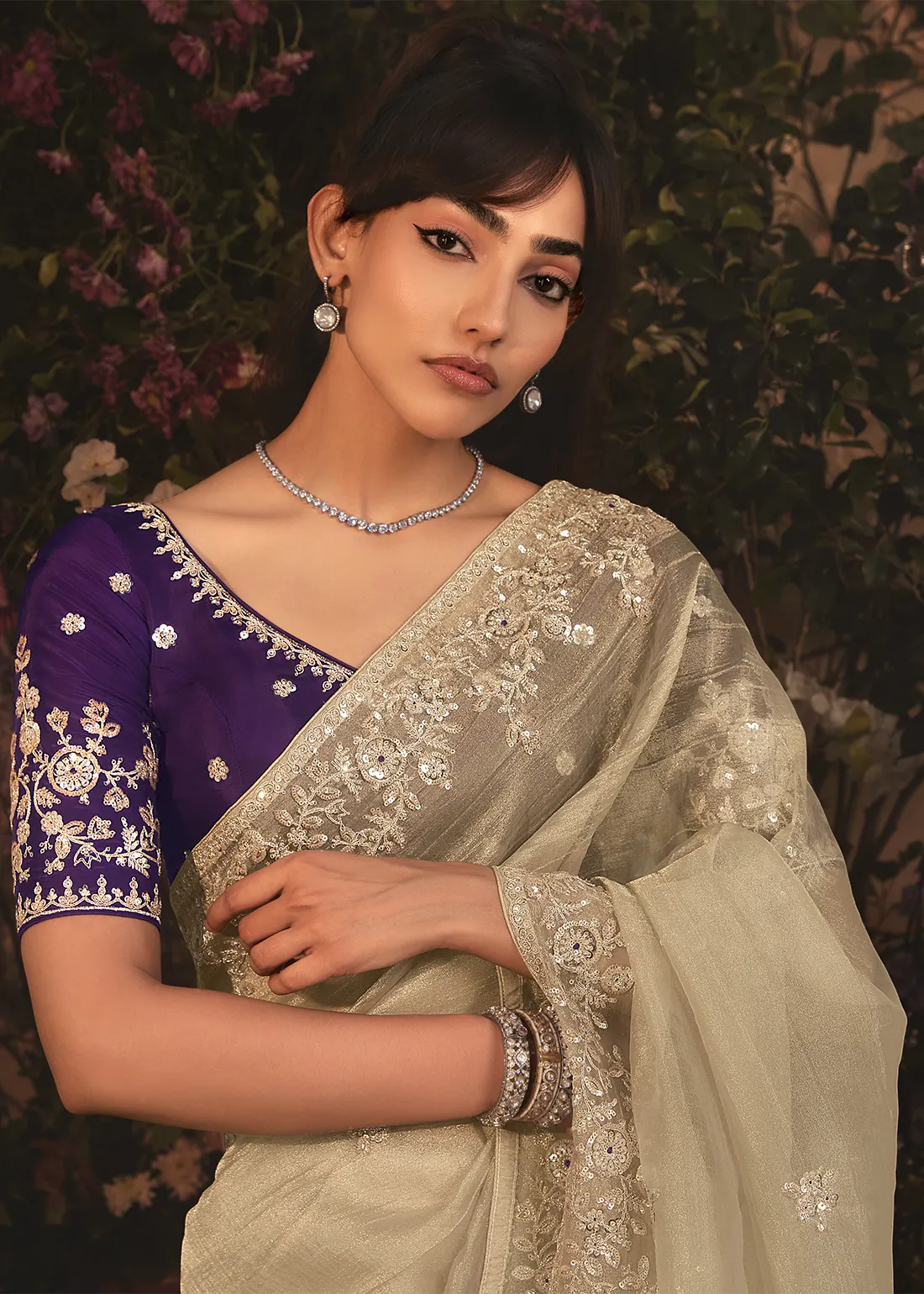 Step into the spotlight with this Golden Beige Organza Saree from our Luxe Collection, designed to redefine understated opulence. The saree features delicate zari and sequin floral embroidery, enhancing its sheer organza texture with a radiant glow. The highlight — a royal purple embroidered blouse — adds a striking contrast that beautifully complements the muted golden tones. Perfect for weddings, festive soirées, and grand celebrations, this saree blends classic craftsmanship with modern sophistication.