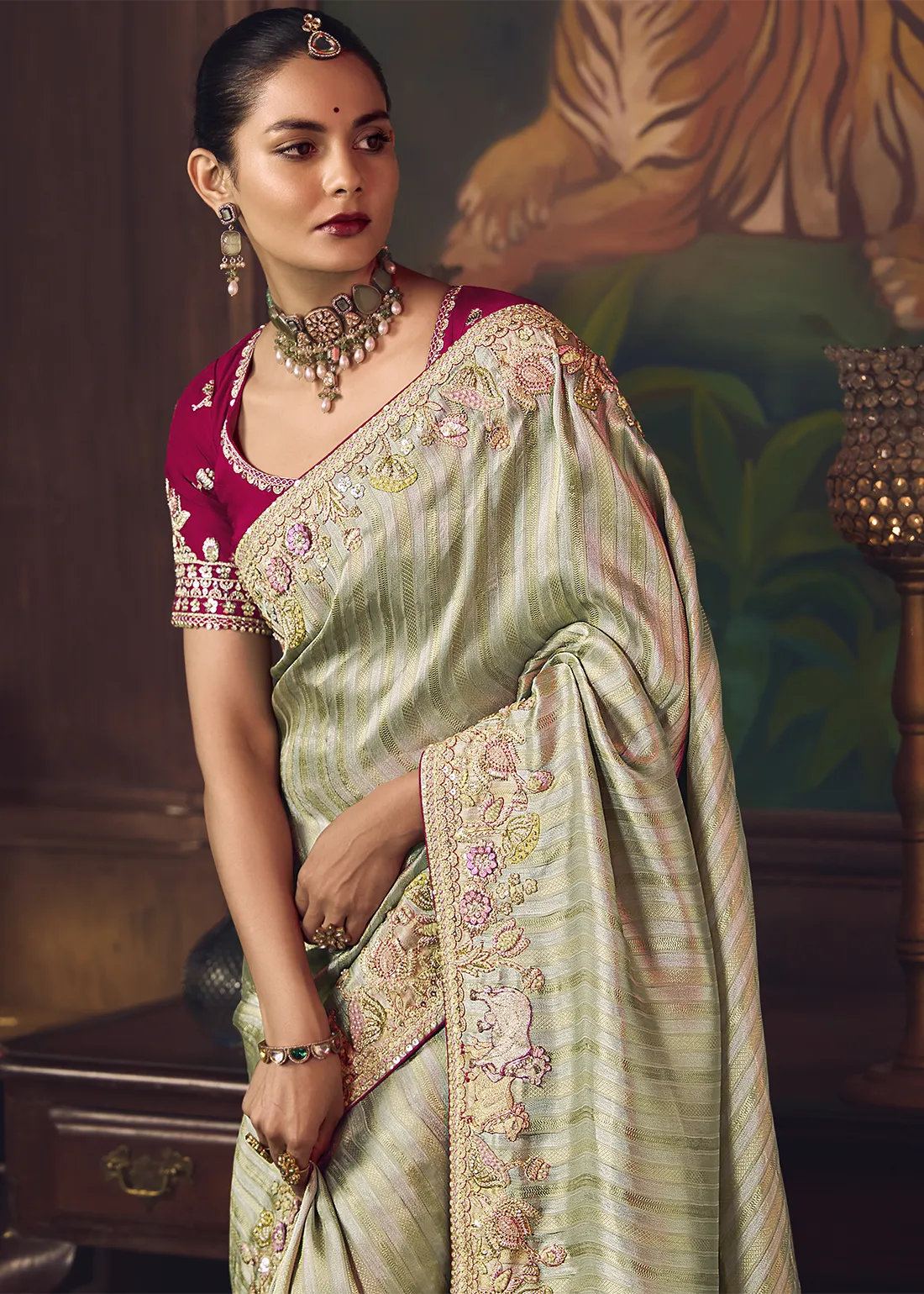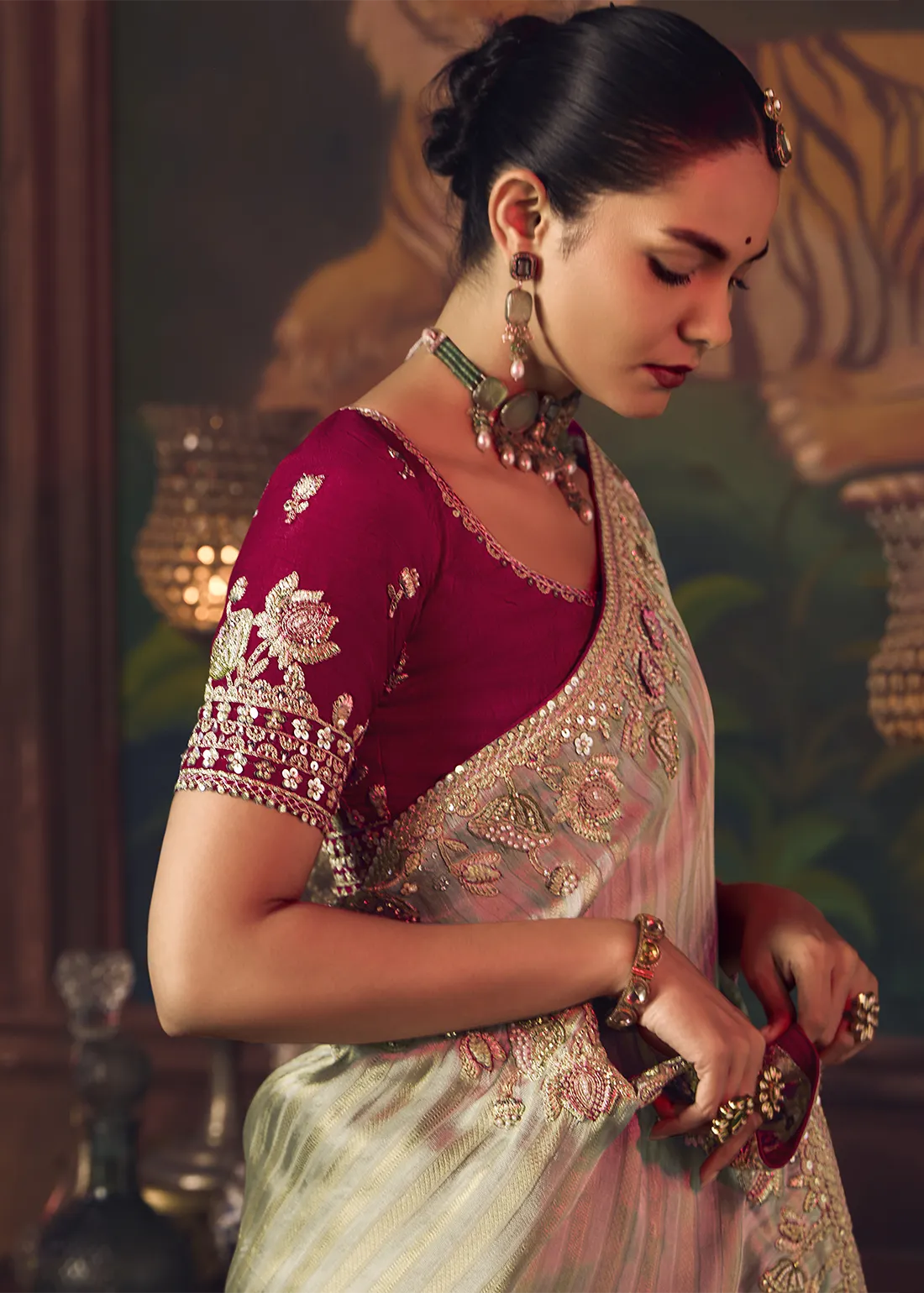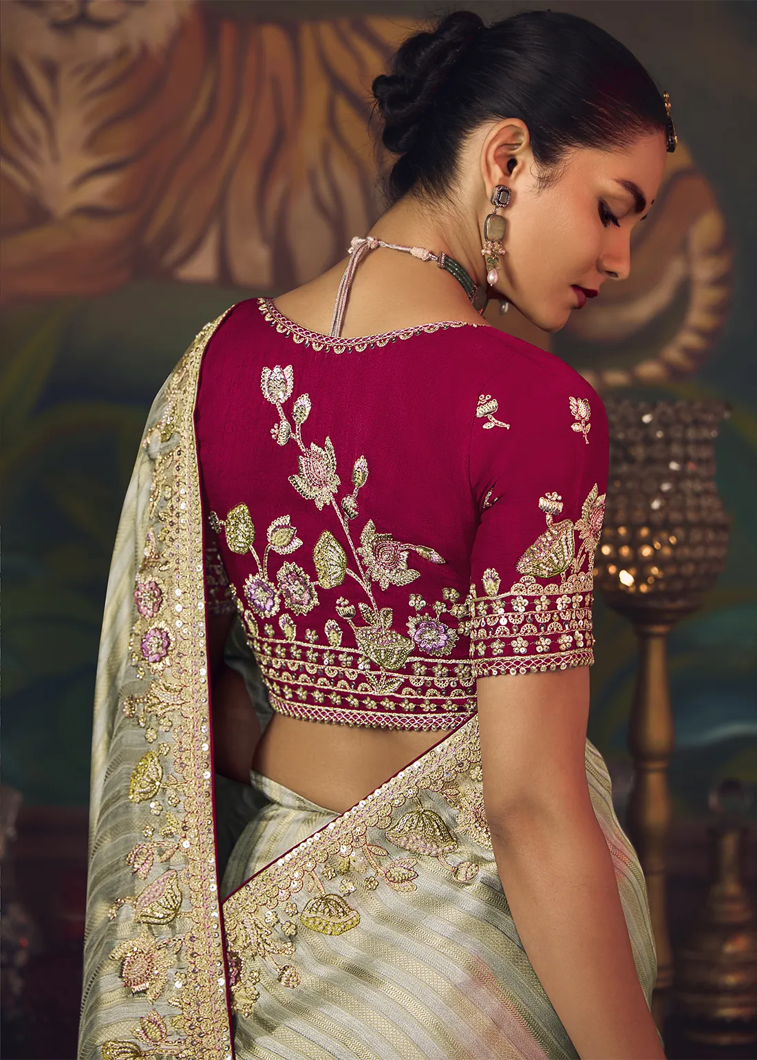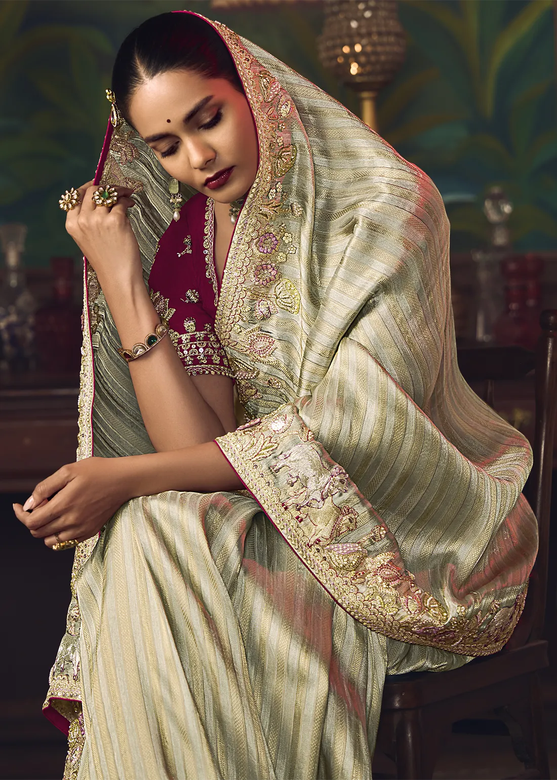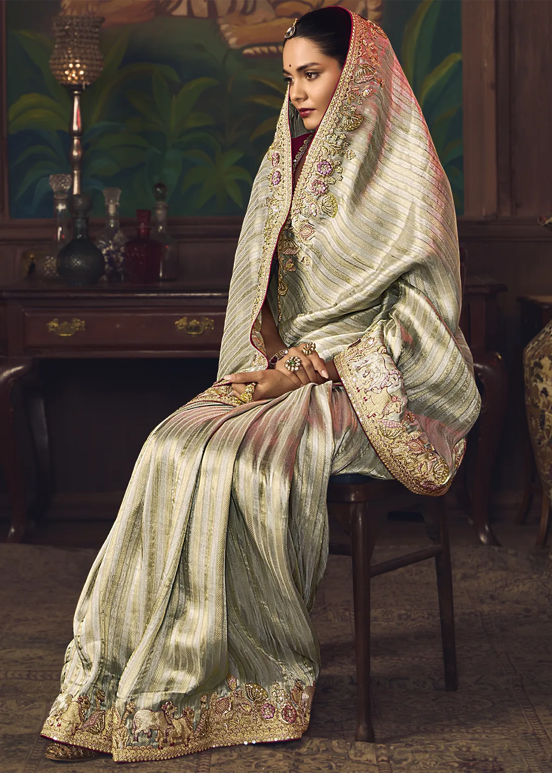 Embroidered Grey Kanjivaram Silk Saree with Maroon Blouse
