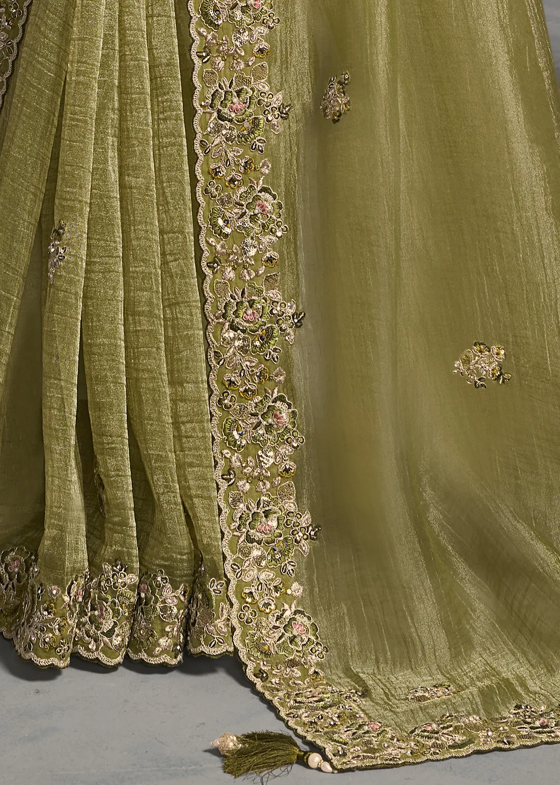 Embroidered Light Olive Green Tissue Silk Saree with Beads & Stone Work