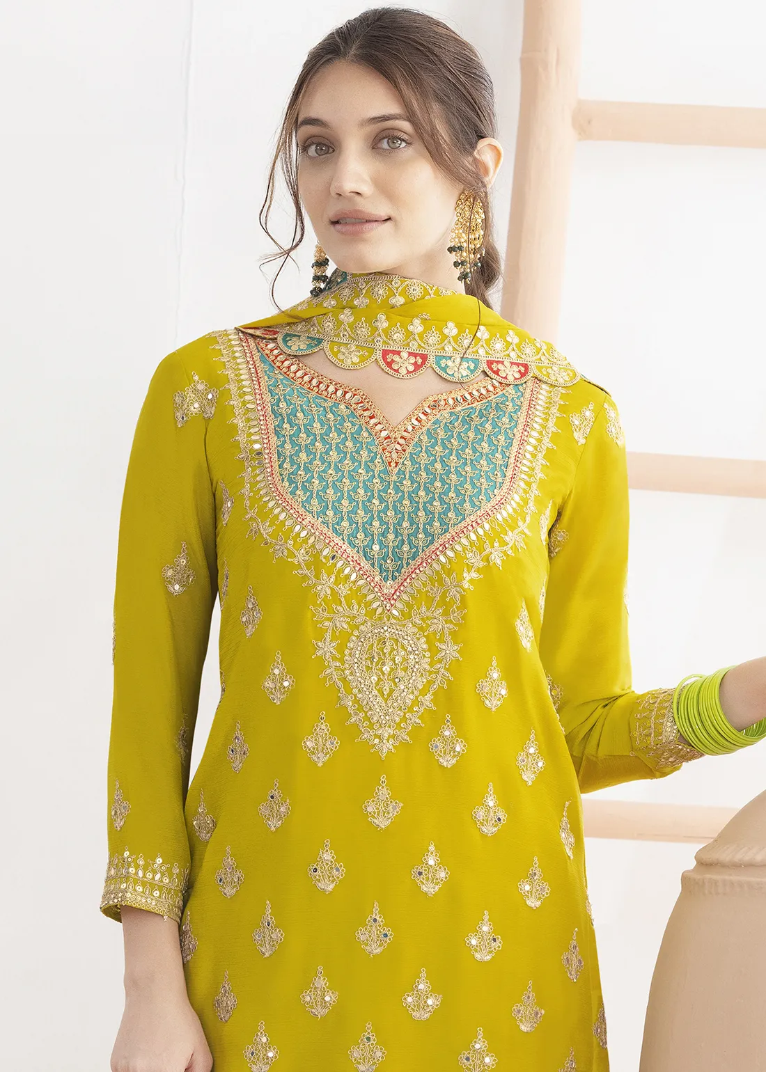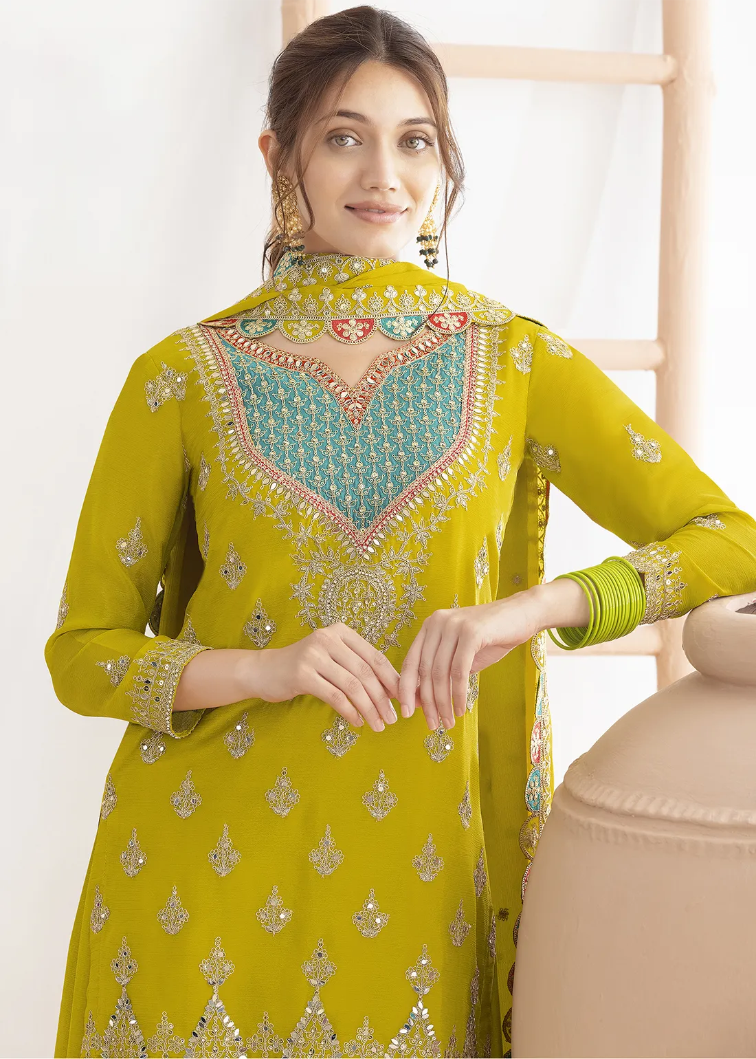 Make heads flip and charm everyone with your grace and beauty by opting for this gorgeous Embroidered Lime Green Chinon Sharara Suit adorned with Zari, Mirror and Sequins work. Whether it’s a festive celebration, a wedding, or a cultural event, this gorgeous outfit is sure to make a lasting impression.