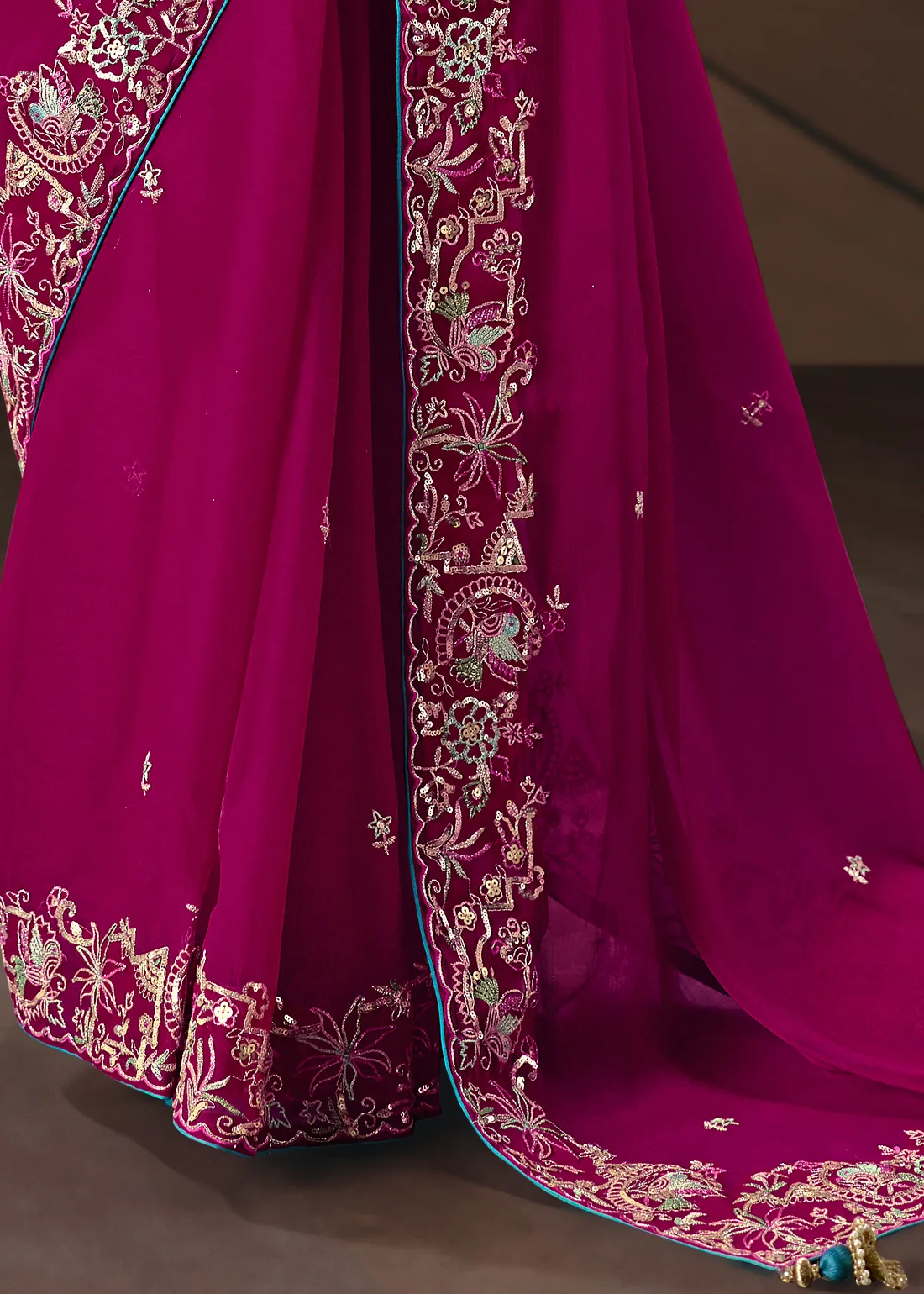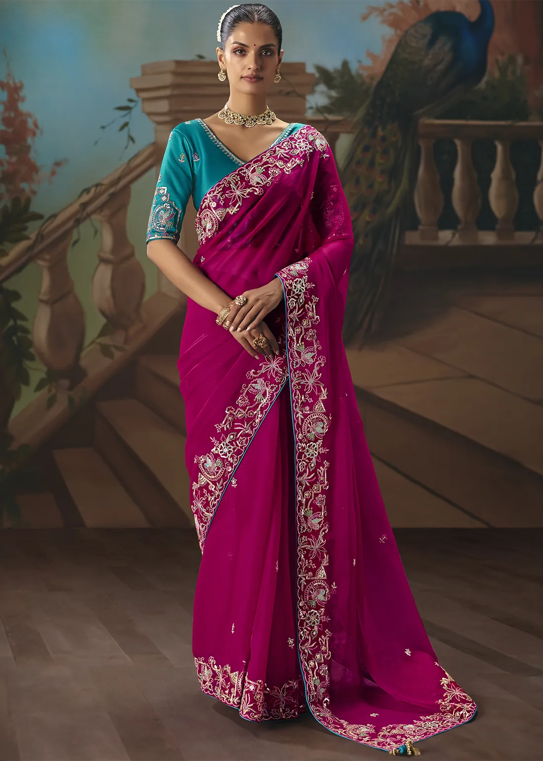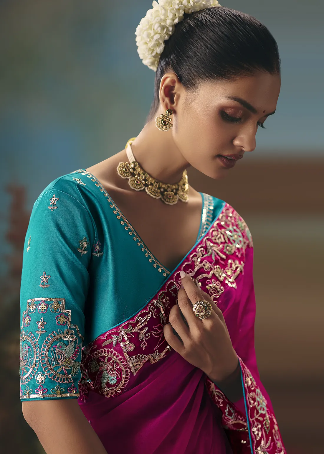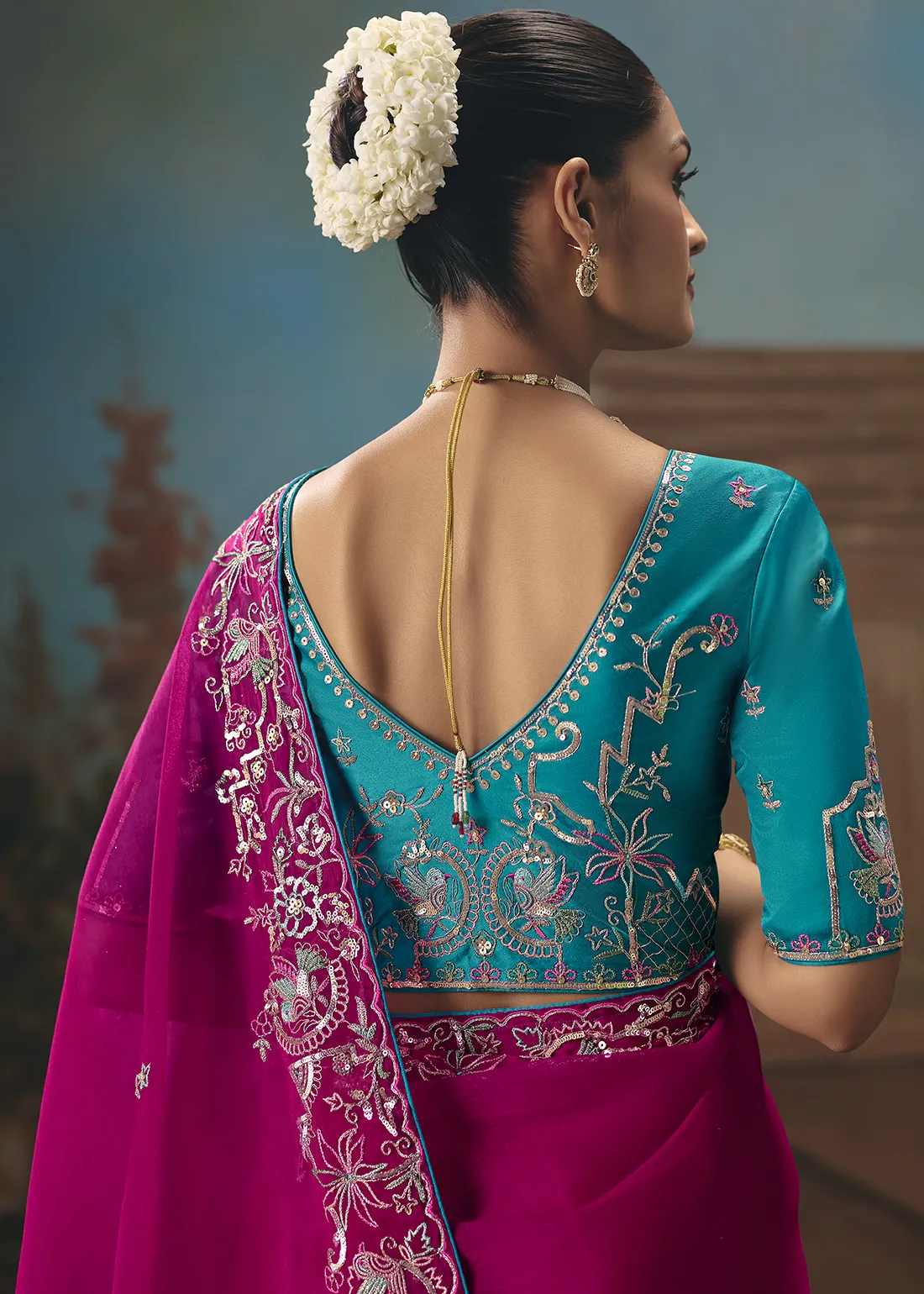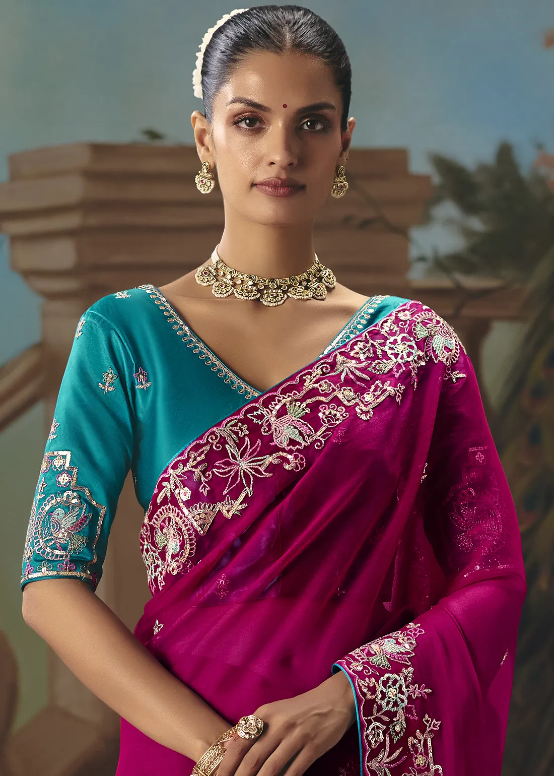 Embroidered Magenta Chiffon Saree with Teal Blouse