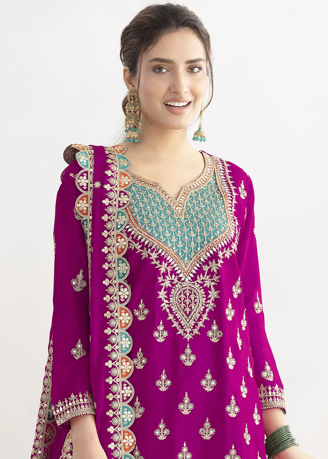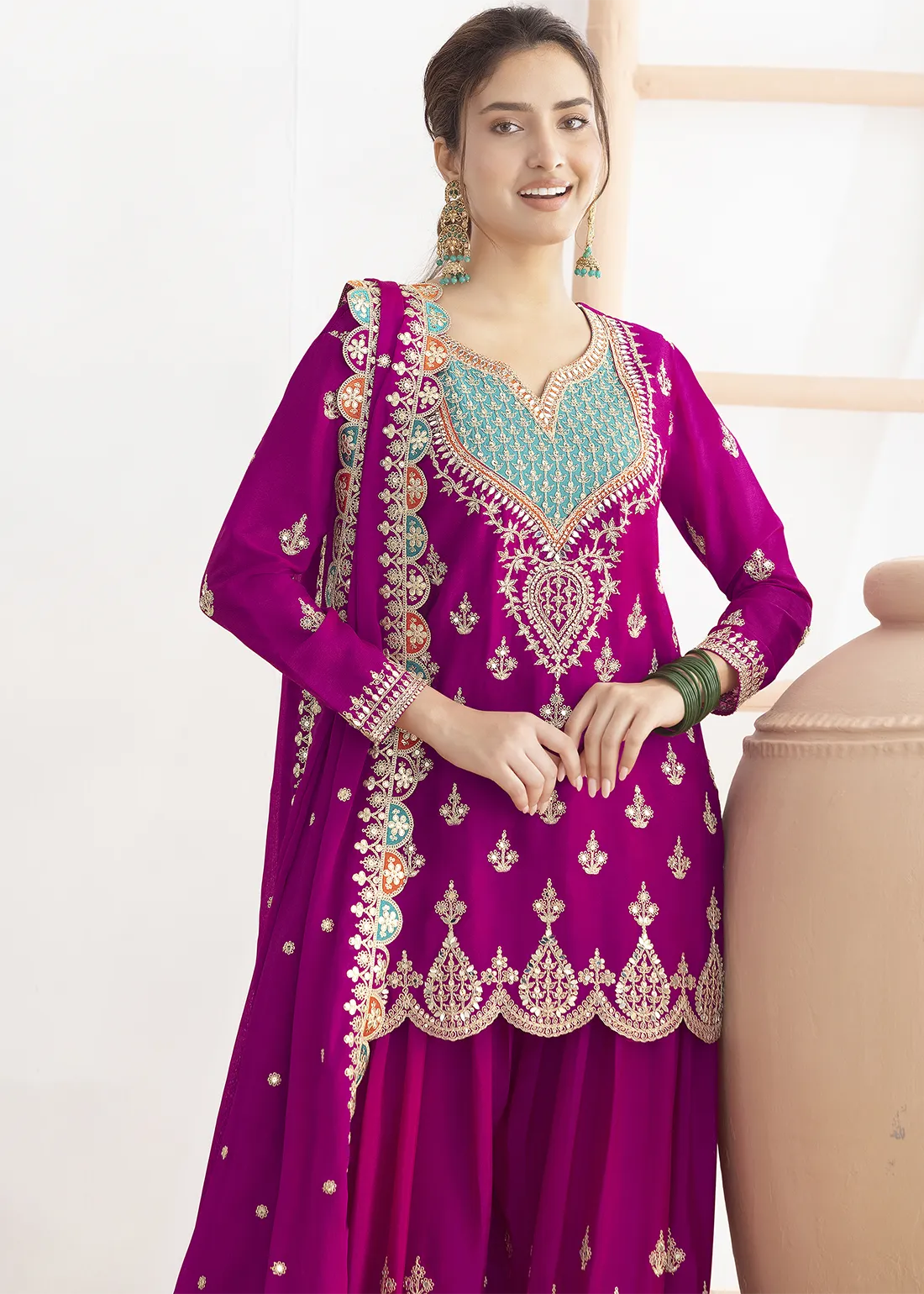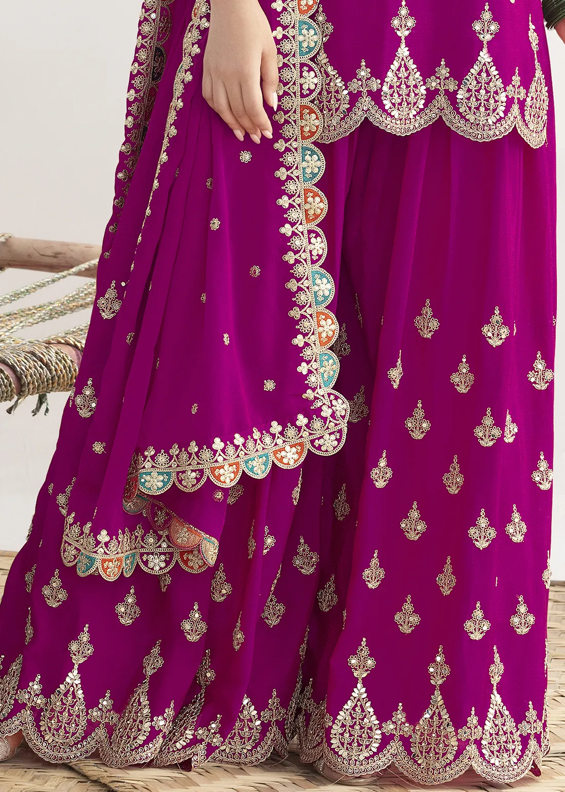 Make heads flip and charm everyone with your grace and beauty by opting for this gorgeous Embroidered Magenta Chinon Sharara Suit adorned with Zari, Mirror and Sequins work. Whether it’s a festive celebration, a wedding, or a cultural event, this gorgeous outfit is sure to make a lasting impression.