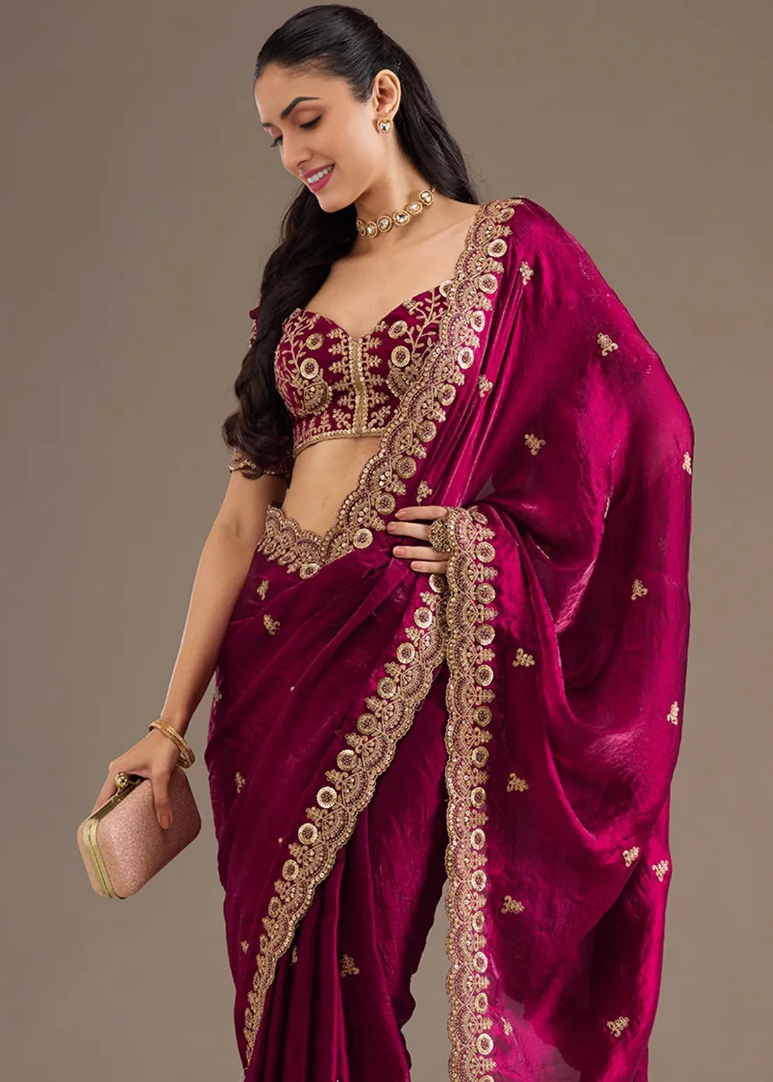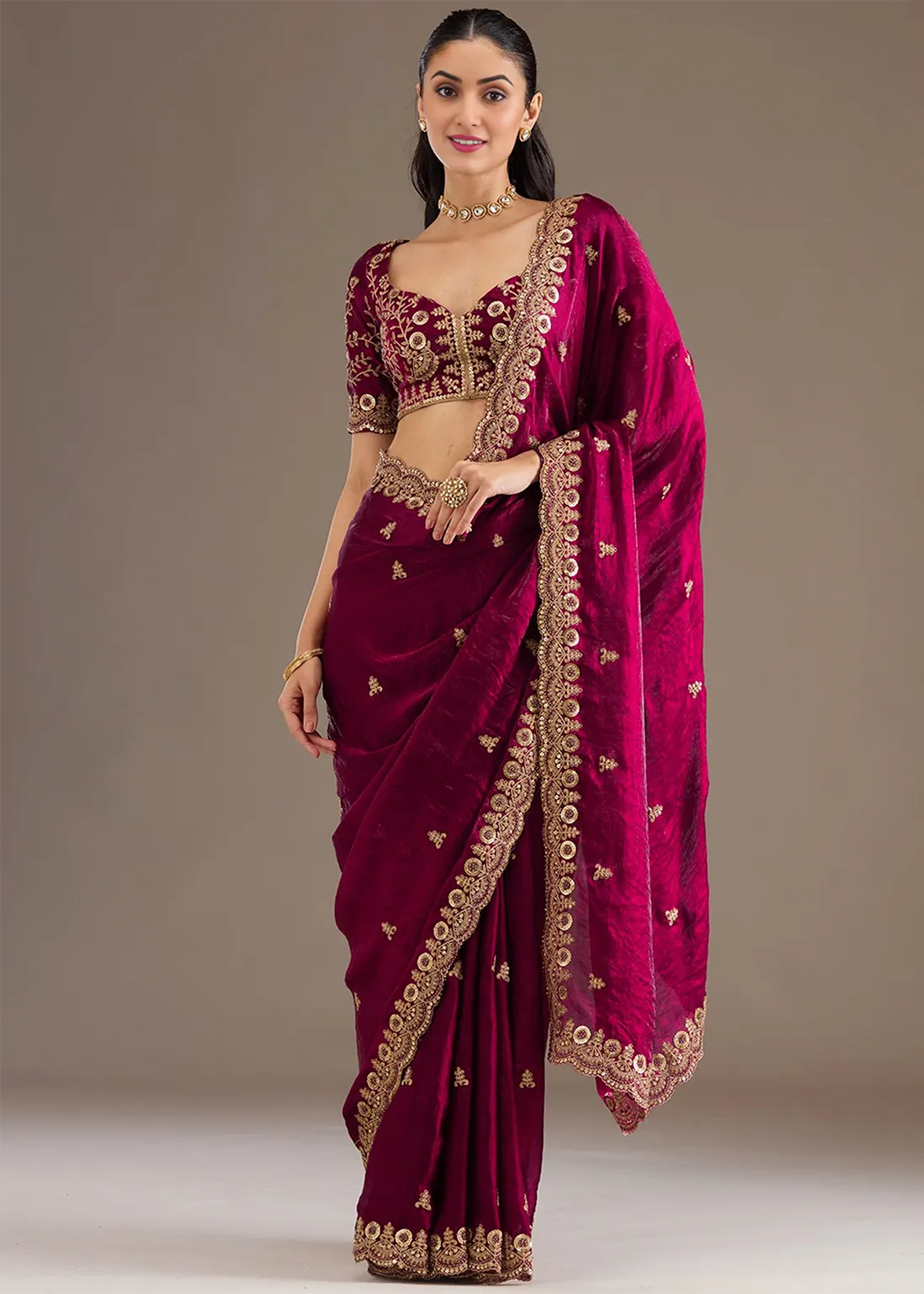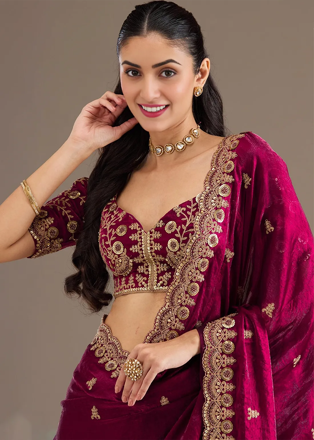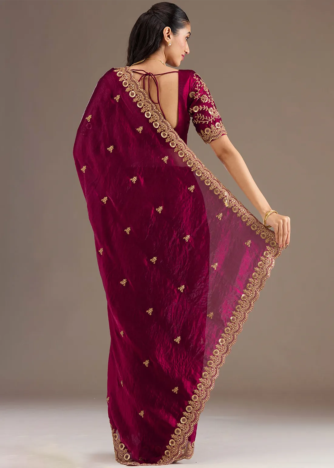 Magenta Embroidered Crushed Silk Saree with Embroidered Blouse
